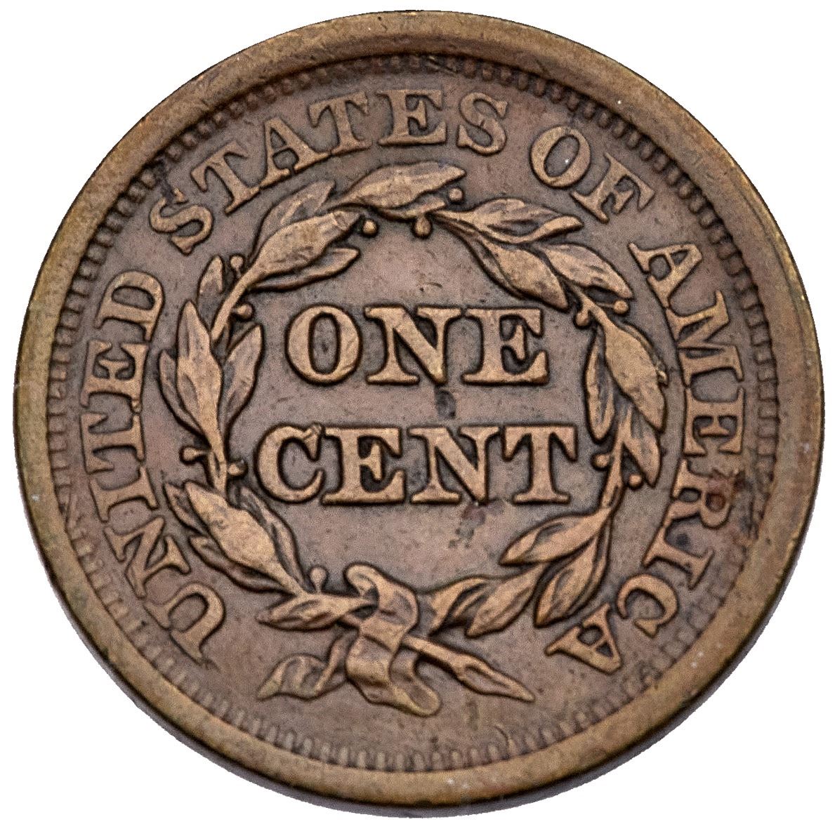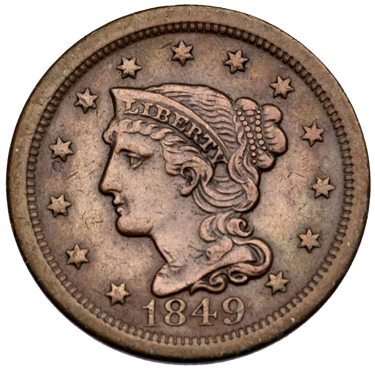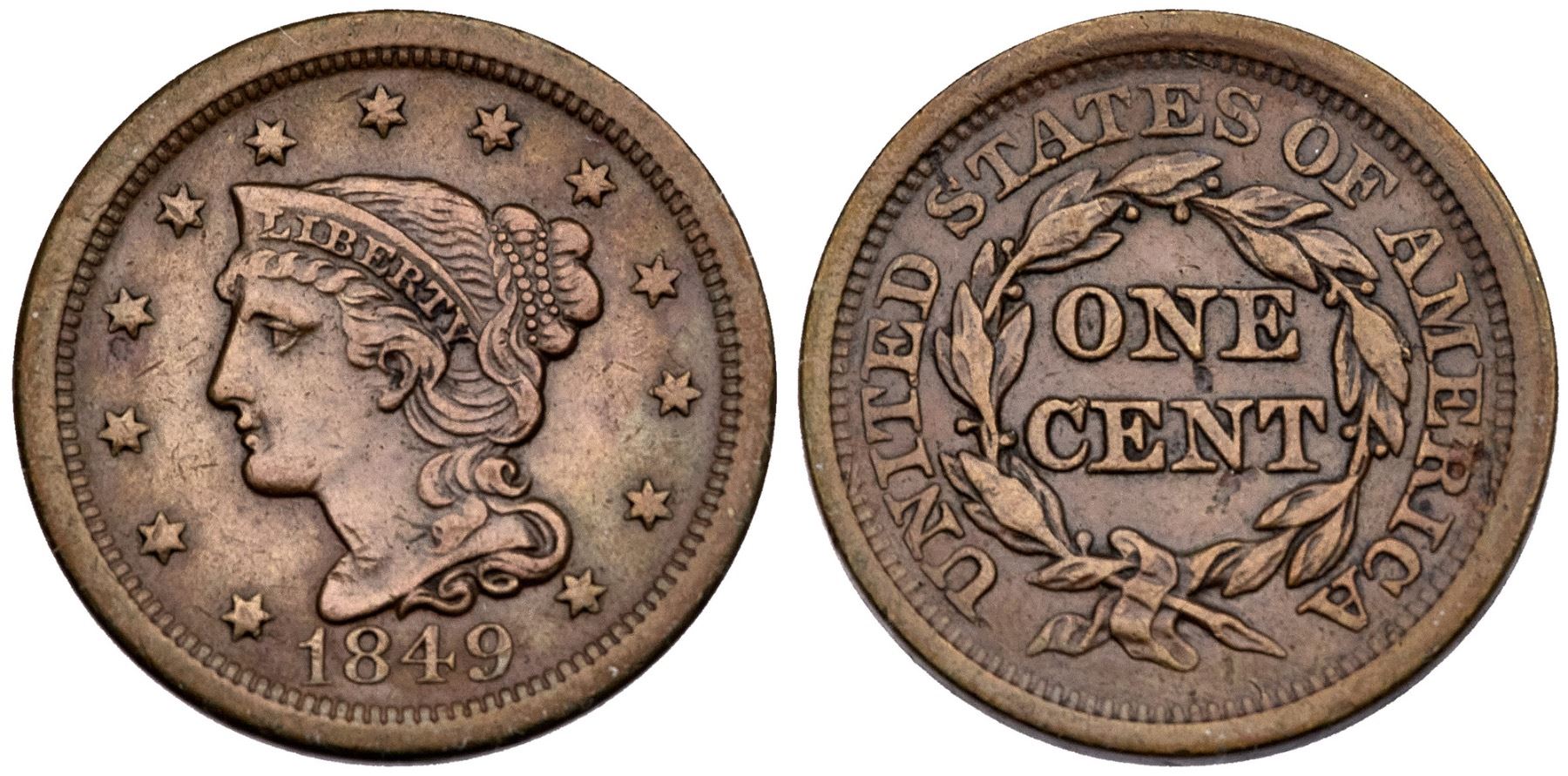 1849 N-12 R-1 VF25Glossy medium brown and olive with a couple reddish chocolate spots on the obverse peripheries. Only a few trivial marks on the fields and devices, with a couple flakes around N in ONE. Smooth surfaces. MDS, state b.