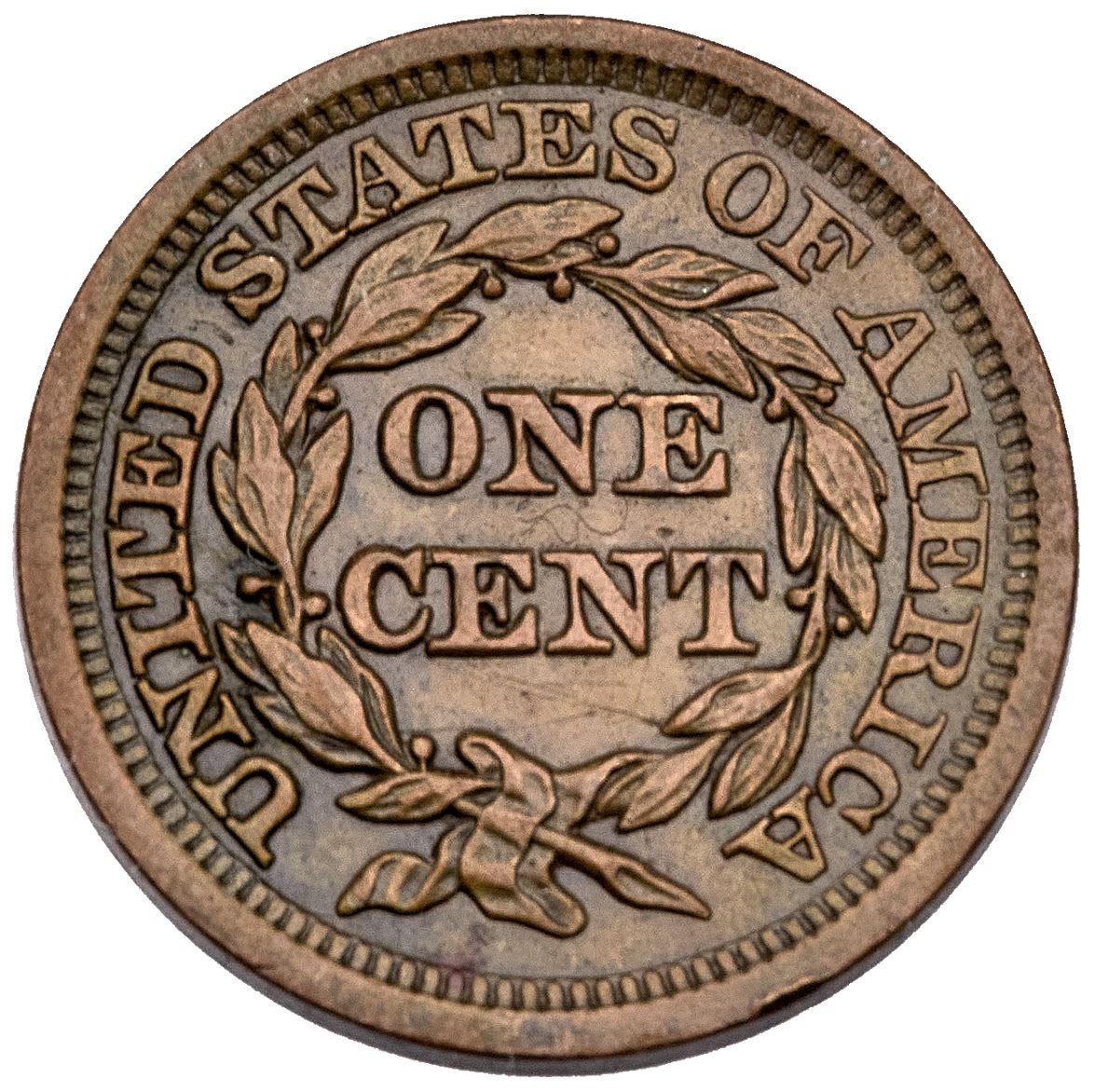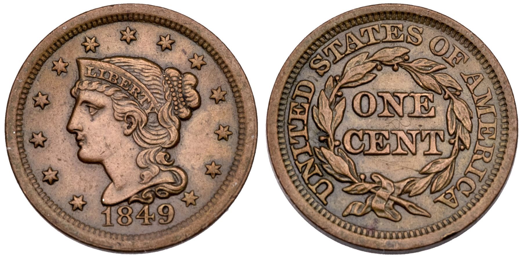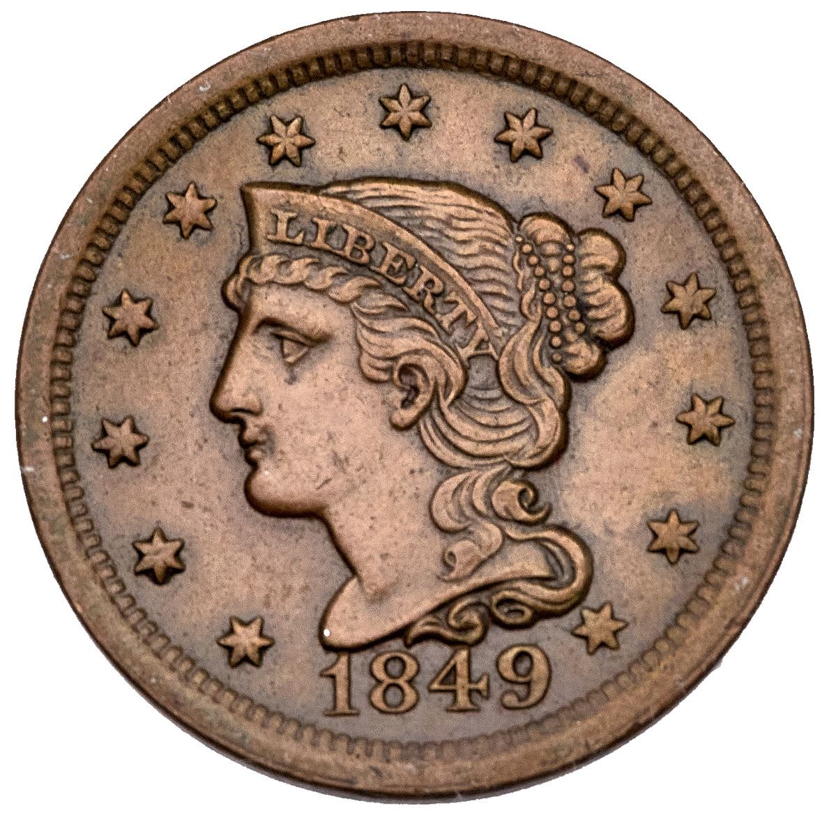 1849 N-17 R-3 VF35Five points sharper but there are nicks, hairline scratches, and a couple minor rim bruises. These include a nick before the eye, one on the lower cheek, wispy hairline scratches below CENT, and tiny rim bruises under 18 and over the last A in AMERICA. Glossy medium brown with darker brown covering the protected areas. MDS, die state b.