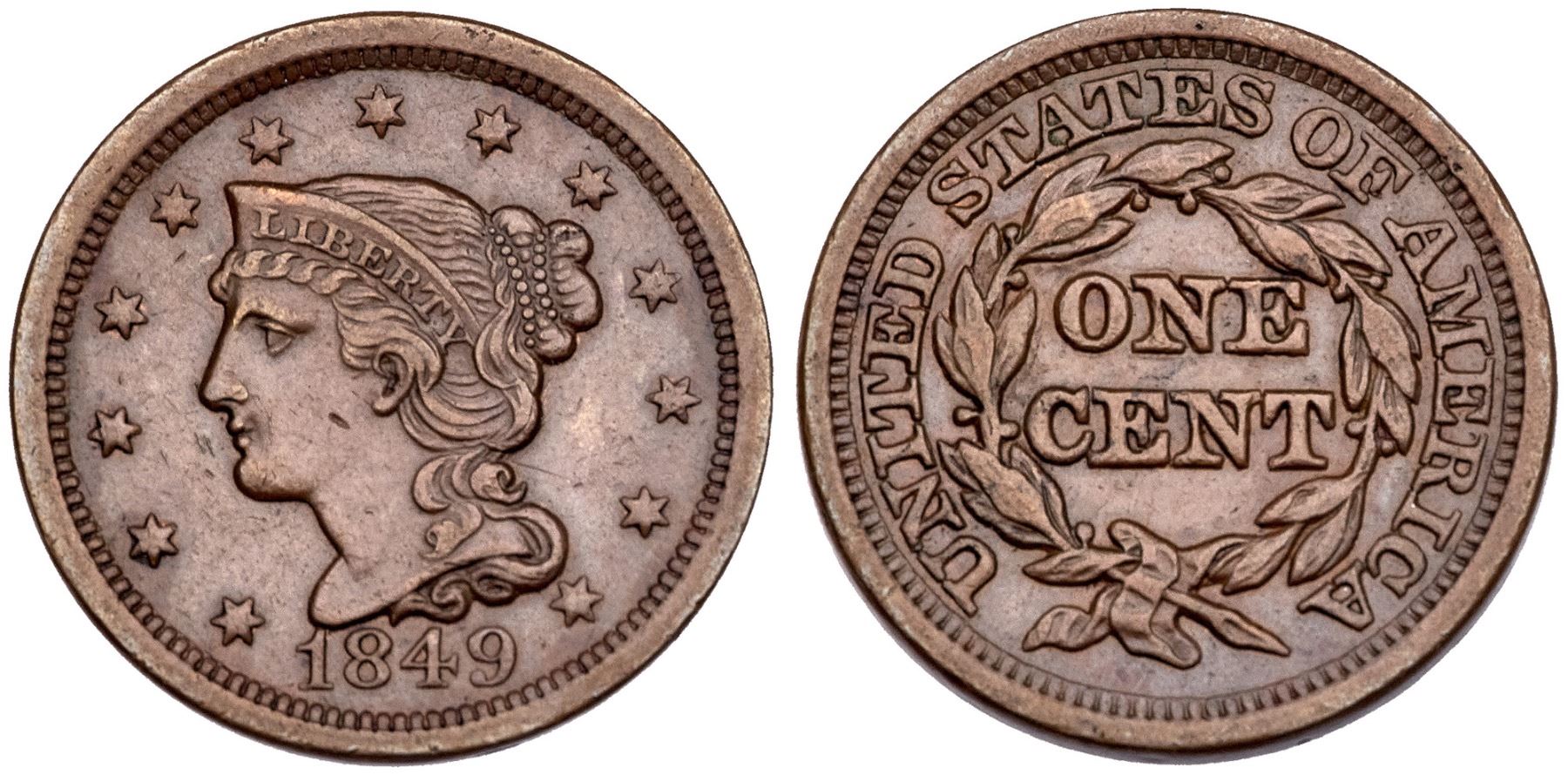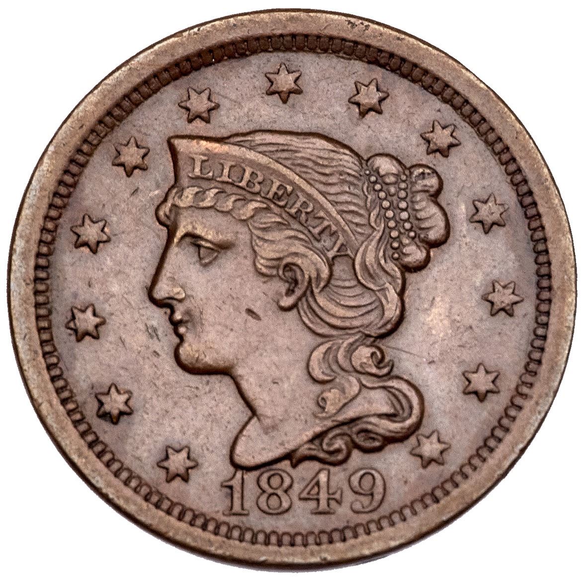 1849 N-19 R-5- VF30Five points sharper there are a few minor nicks on the obverse, the only worth noting on the lower cheek. Mostly medium brown with auburn brown tones on the reverse. EDS, die state a.