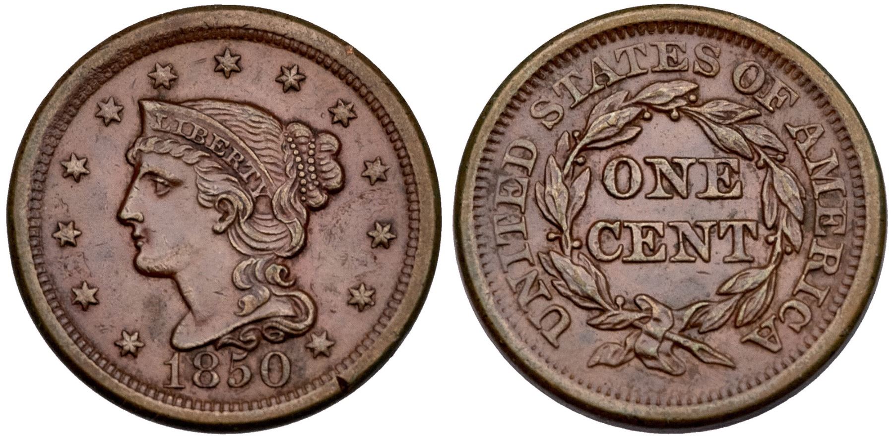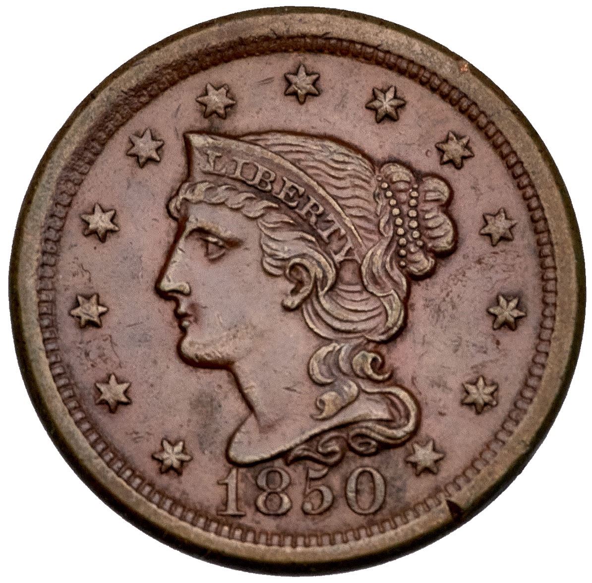 1850 N-7 R-1 EF40Five points sharper but there are a couple rim nicks at star 13 and between stars 9-10. There are also trivial marks and abrasions on the fields and devices.Glossy chocolate and ruddy browns. EDS, die state a.Ex; McLaughlin and Robinson Coins Inc