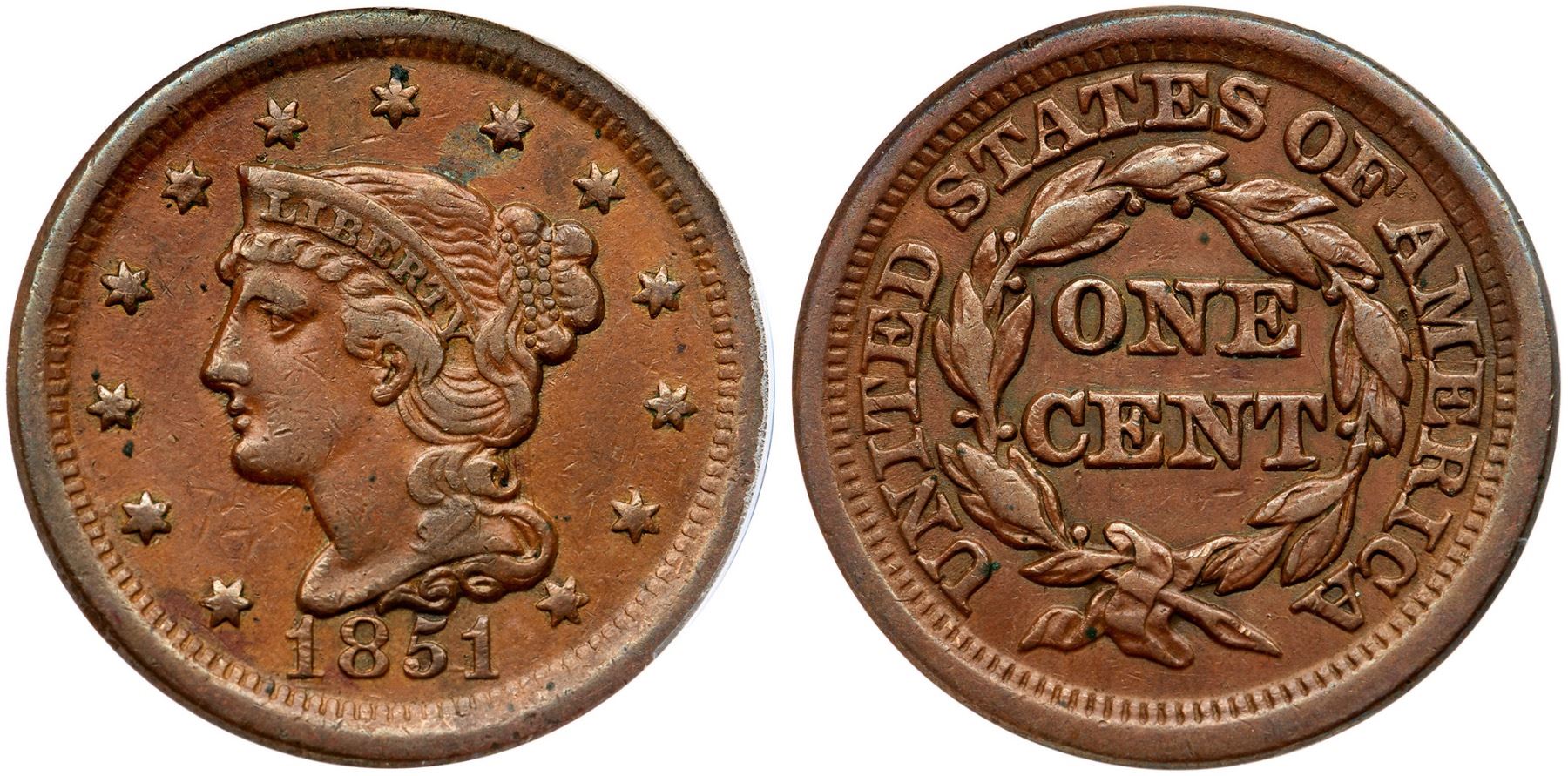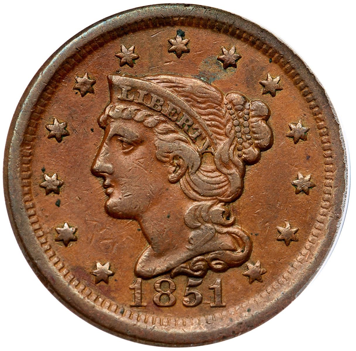 1851 N-4 R-1 ANACS VF35VF35 but there are scattered carbon specks scattered on the obverse, most notable at star 3 and atop star 7. Tan brown and light olive. Trivial marks and abrasions on the portrait and fields, nothing major. EDS, state a. 7341284