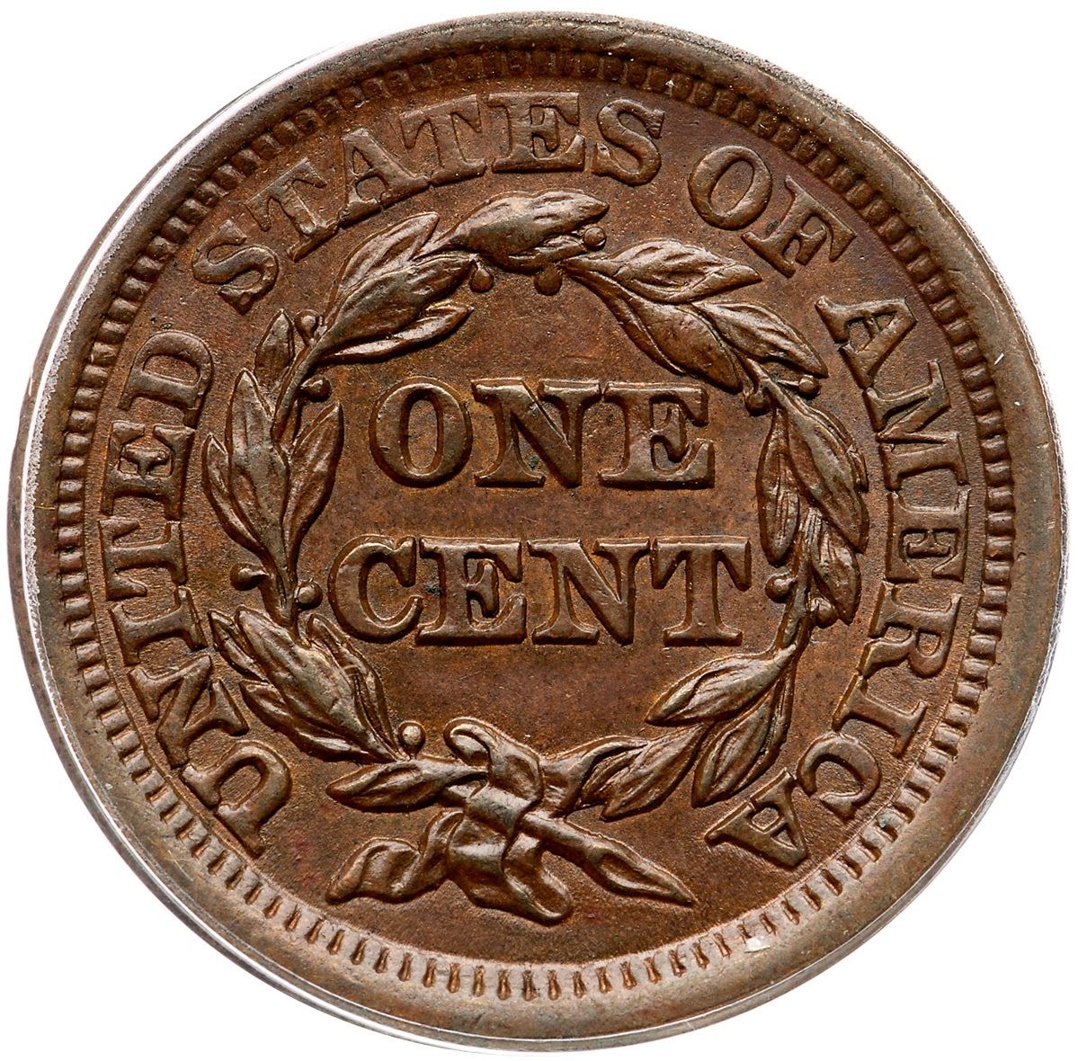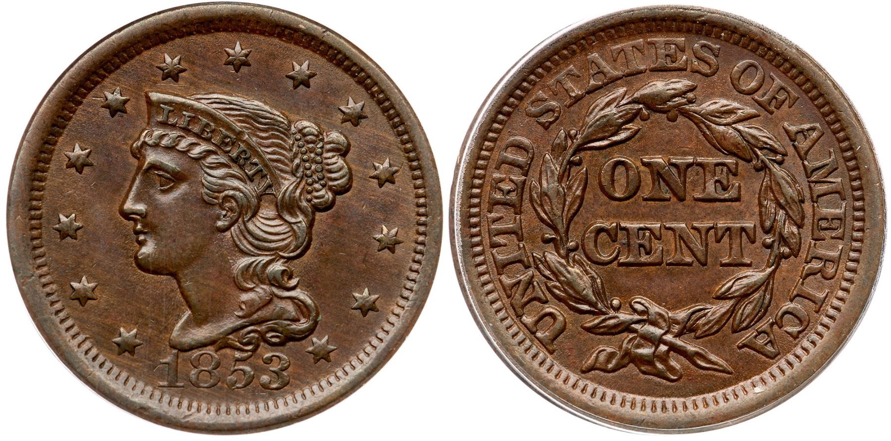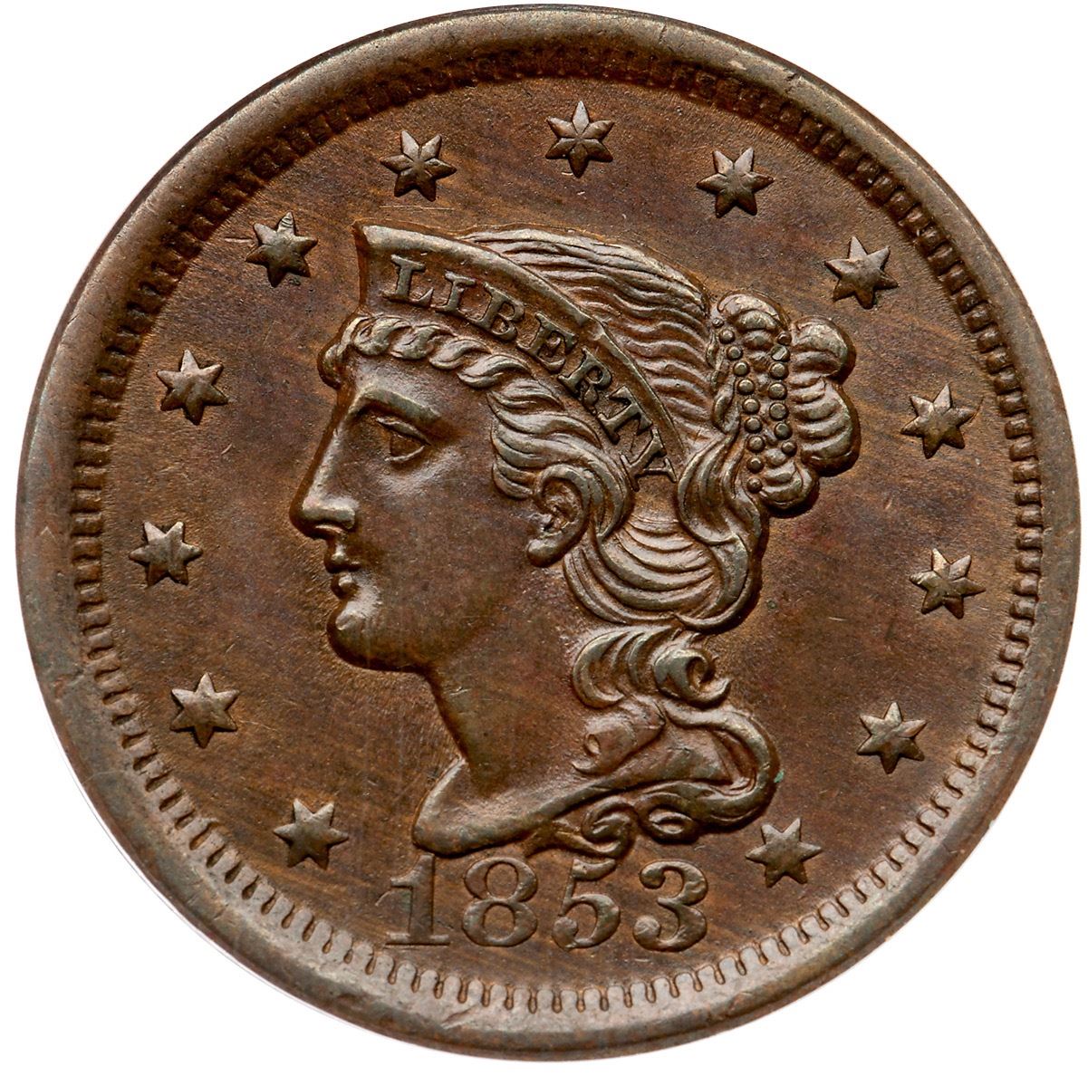 1853 N-25 R-1 ANACS AU58Attractive chocolate and olive browns with a diagonal, wood grain like pattern on the obverse. One trivial nick in the dentils below 8 is the best identifying mark. Lustrous surfaces. MDS, state b, with repunching below 1 visible. 7341298