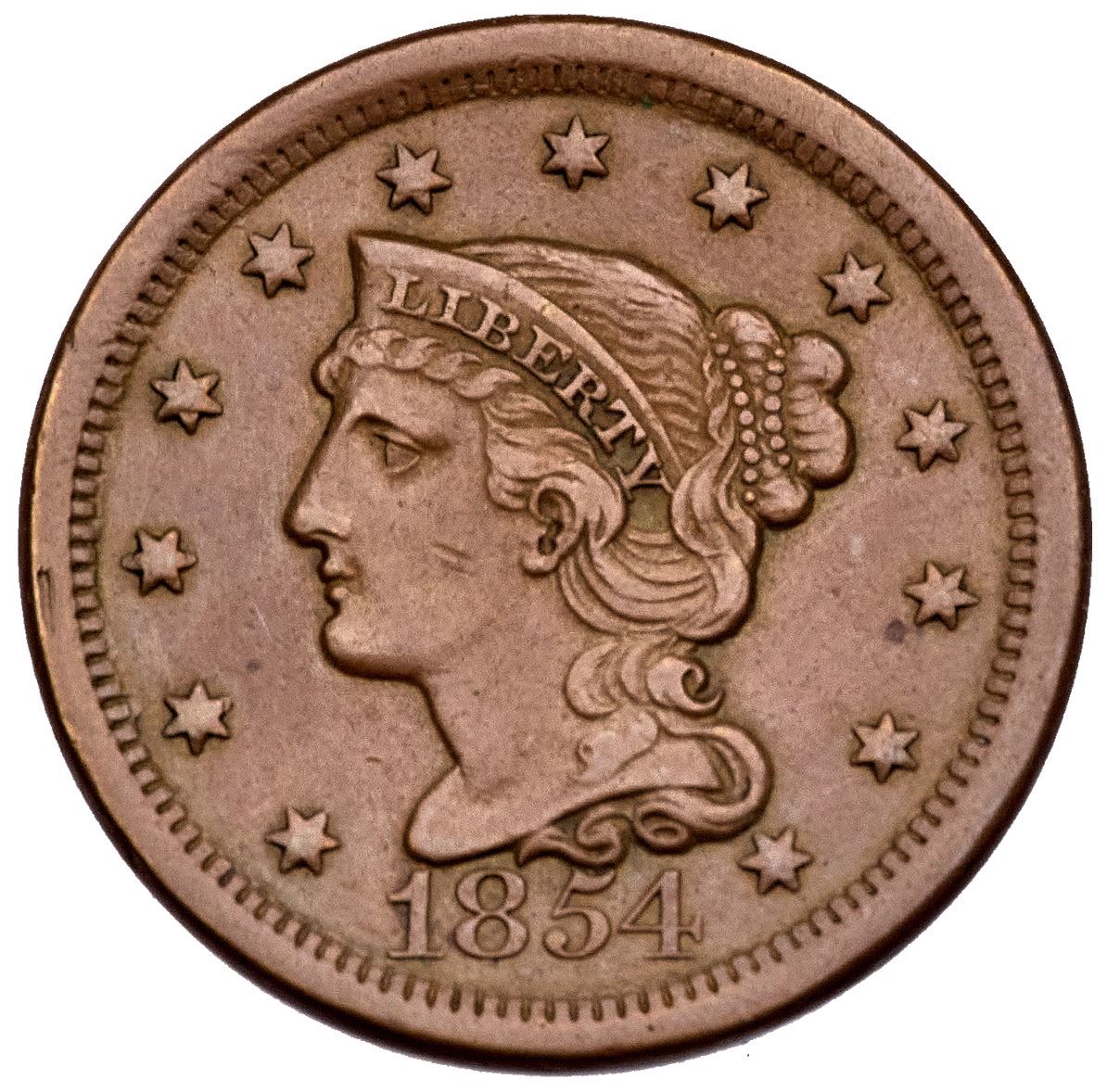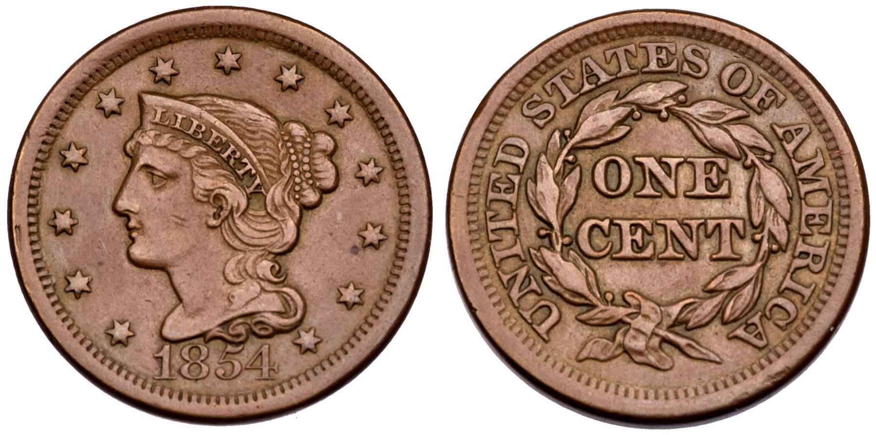 1854 N-20 R-3 VF25+VF30+ but there are very faint hairlines on the obverse visible under a glass, and a couple tiny nicks on Liberty's cheek. Attractive uniform light brown. E-MDS, state a+. Ex; Dick Punchard - Dan Holmes 2/2004