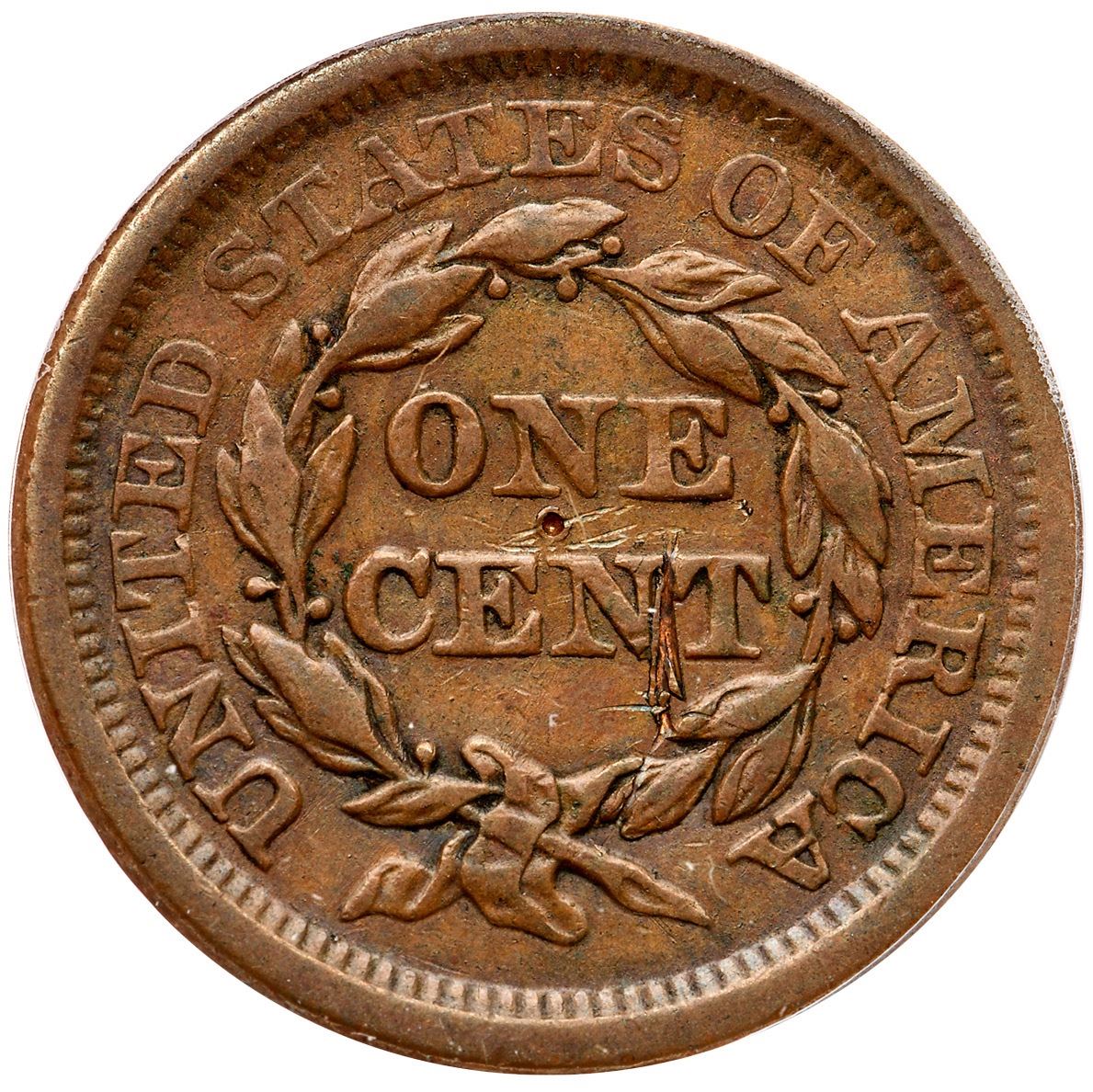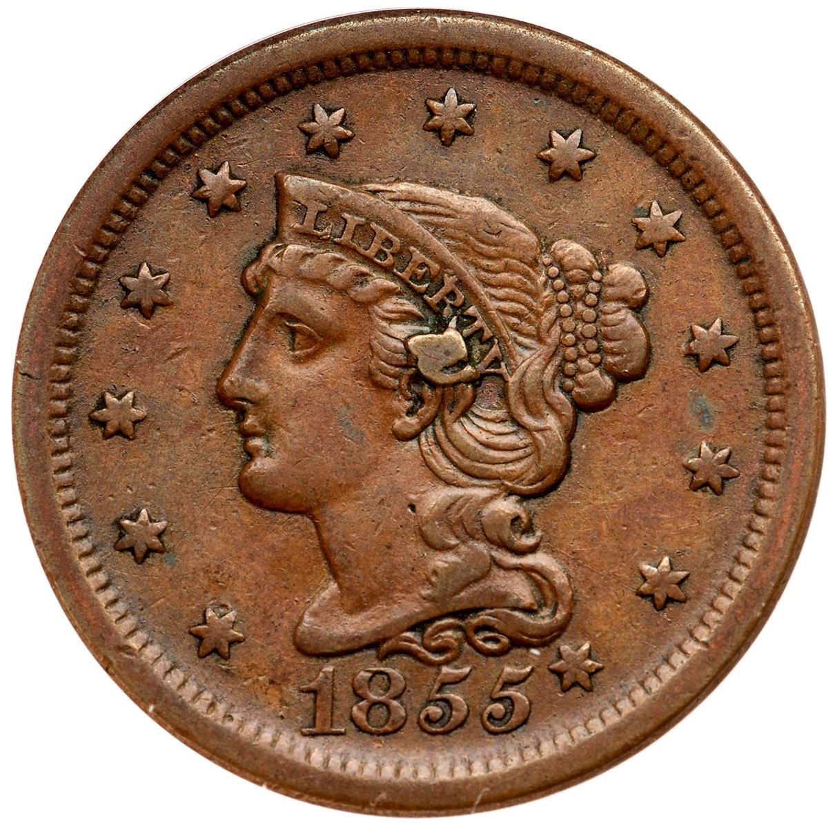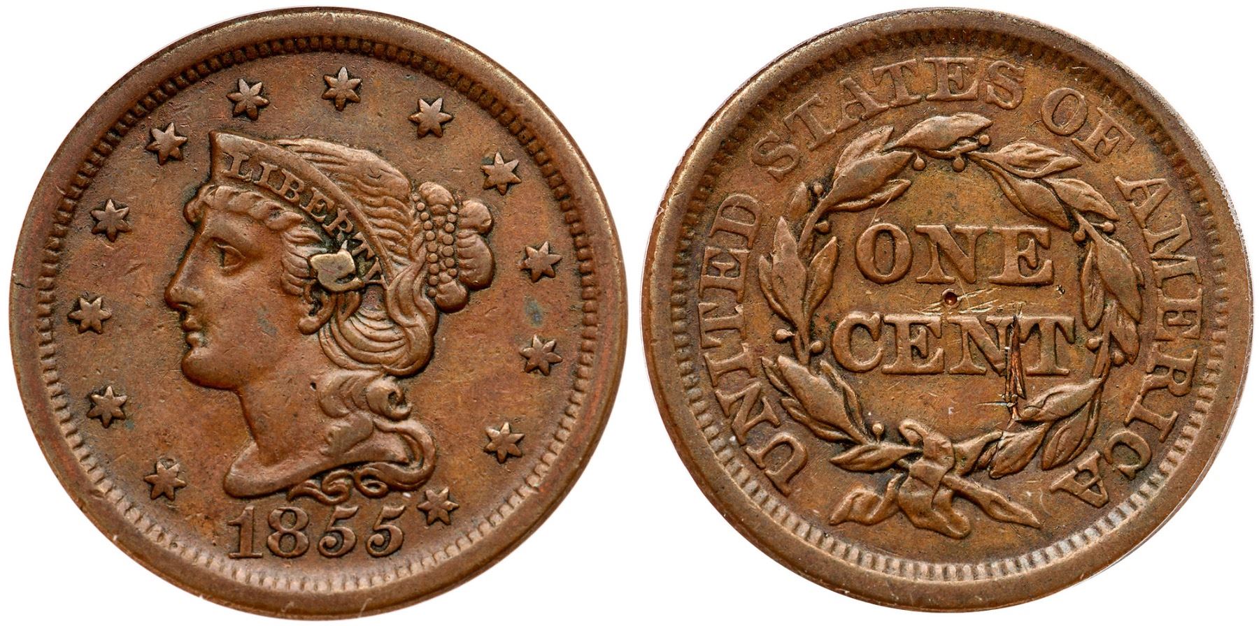 1855 N-9 R-1 Knob on Ear ANACS EF40 Details (Damaged)VF35 sharpness but there is a vertical scratch between NT in CENT and a pin point dig on the central reverse. Light olive brown. LDS, state f. Our grade is VF25.7341297