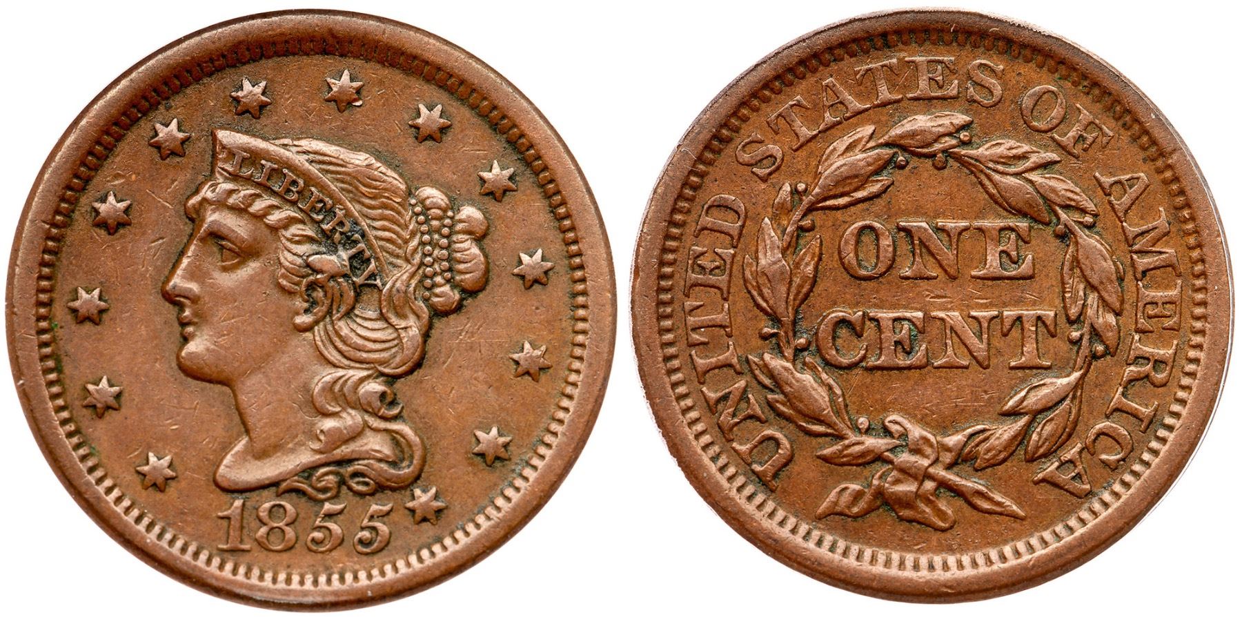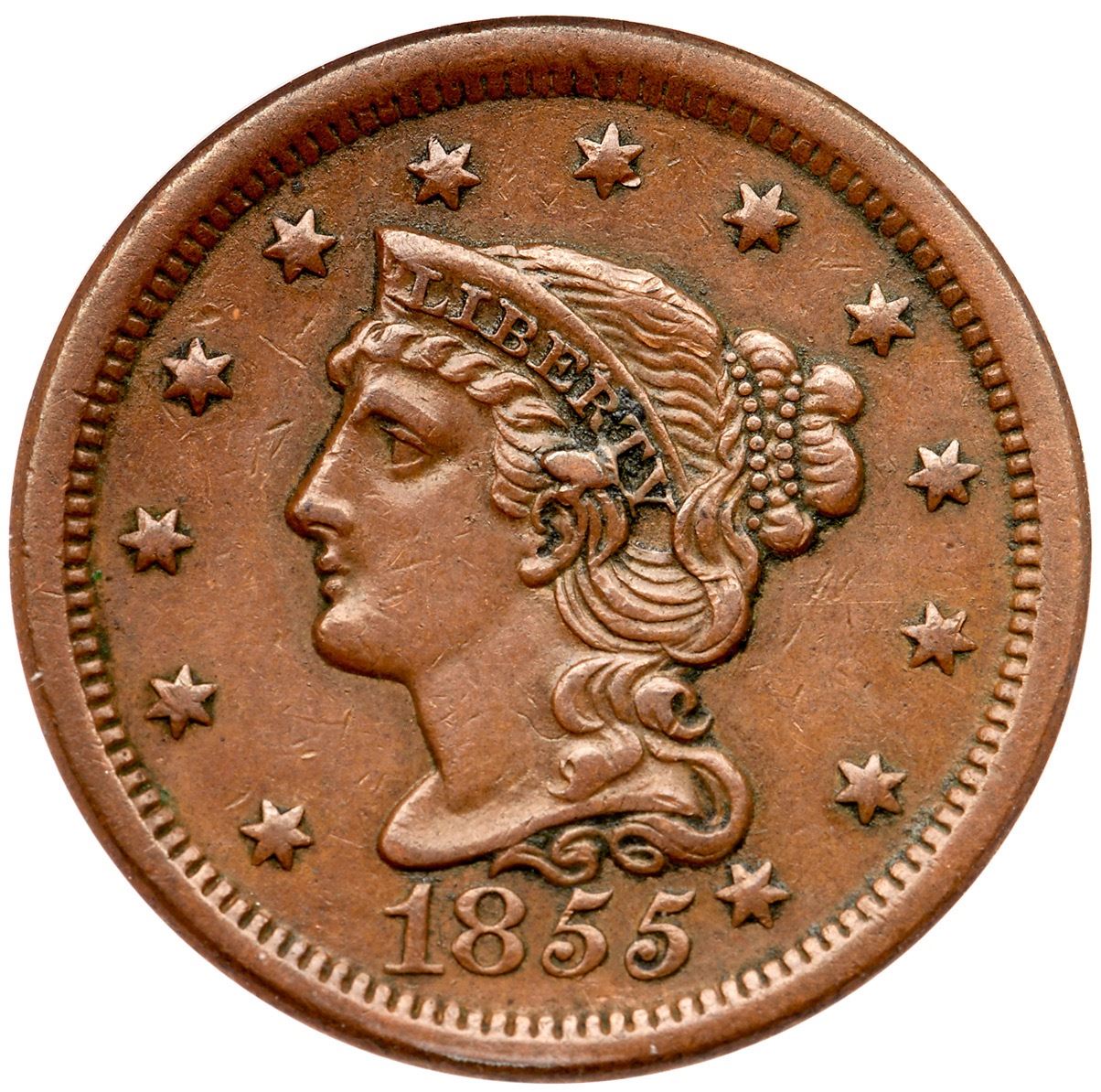 1855 N-9 R-1 Knob on Ear ANACS AU50Pleasing chocolate brown, though a bit dirty with dark grainy crud in some protected areas. Smooth surfaces, free of notable marks. MDS, state d. Our grade is EF45.7341294