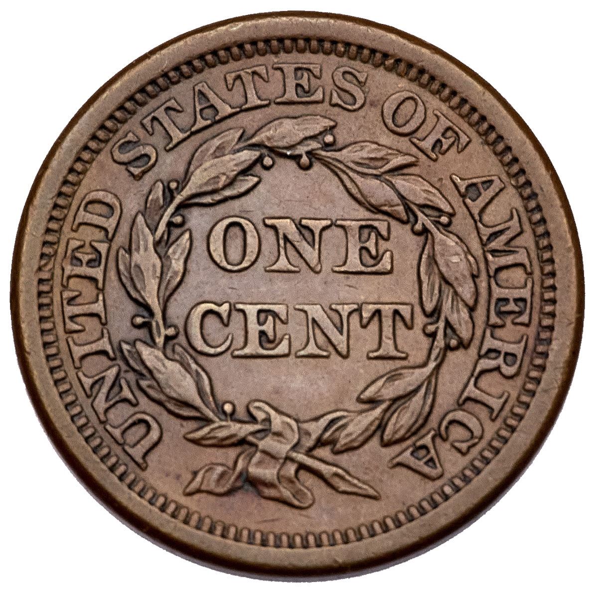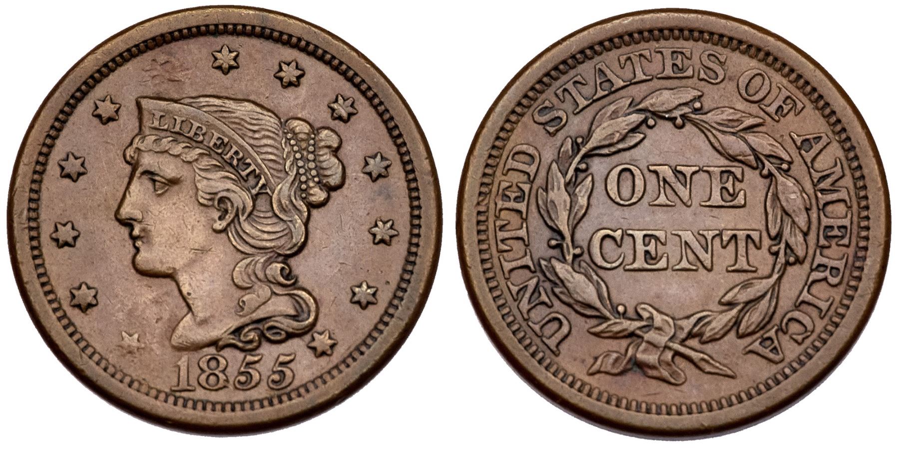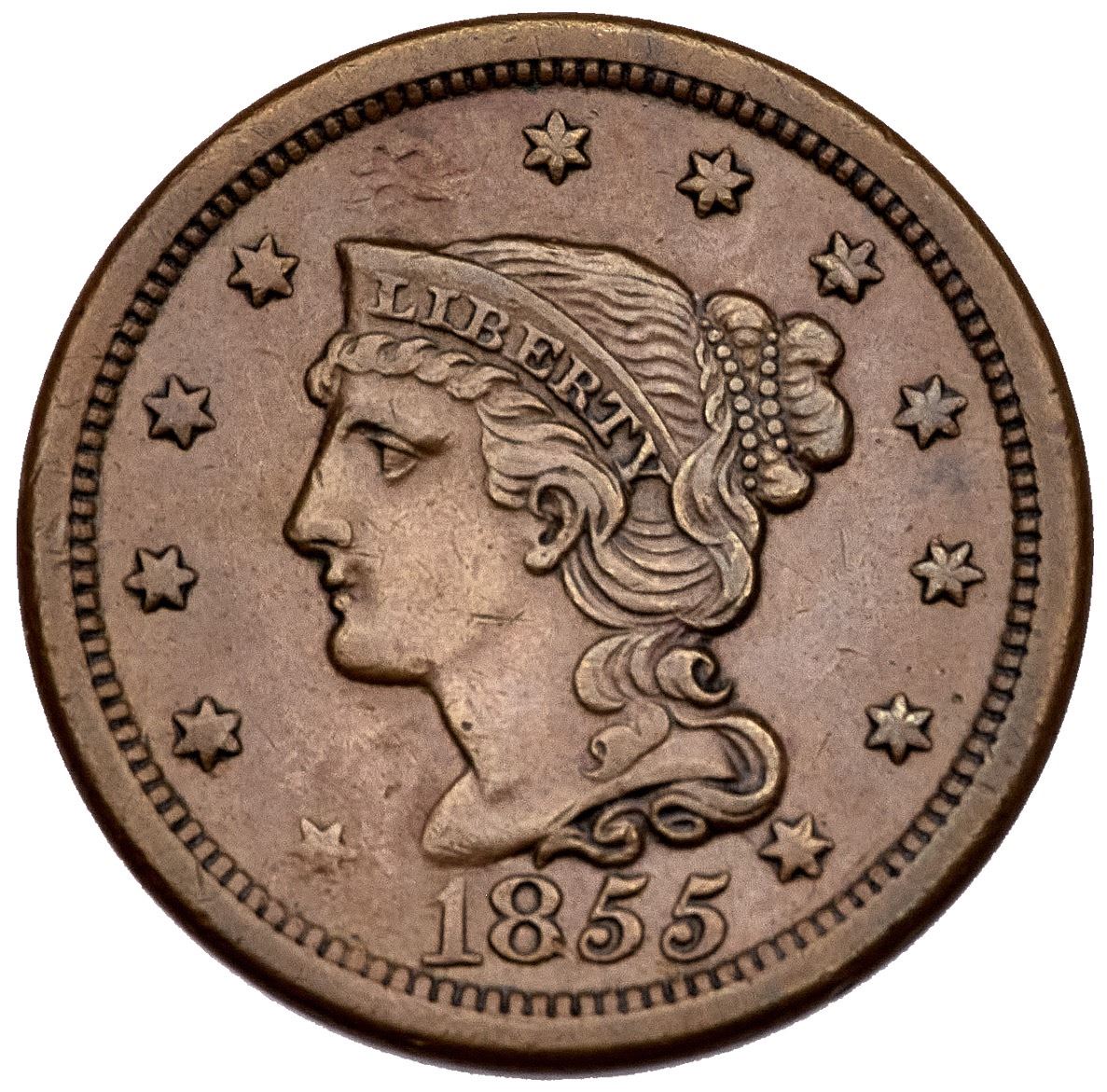 1855 N-10 R-1 VF35Glossy light brown and light olive. Only the most trivial of marks, nothing noteworthy. EDS+, state c, with obverse low spots from the bust tip to star 1 and at star 6, as struck, resulting in an 11 1/2 star die state. Ex; Kagins 5/6/1988:1309 - Dick Punchard - Dan Holmes 2/2004