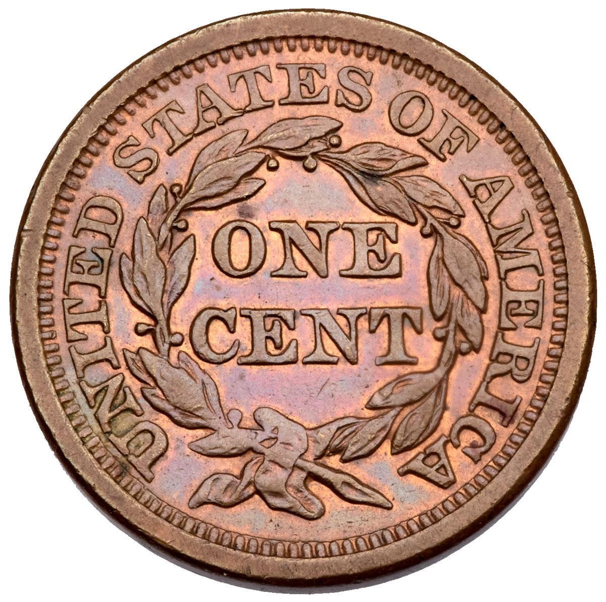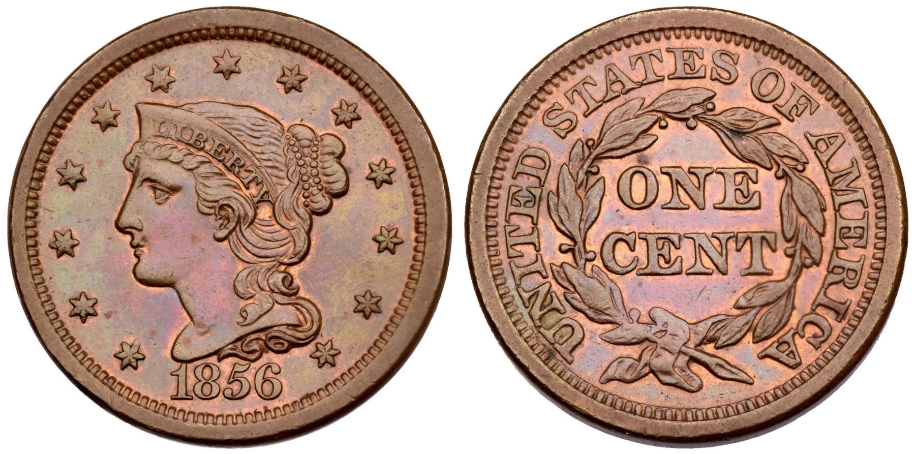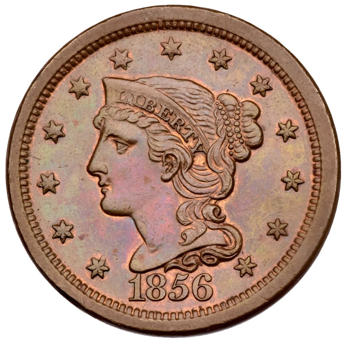 1856 N-3 R-1 EF45Five points sharper but there is a rim bruise at star 1, and the surfaces have been recolored and now are iridescent red, green, gold, and steel tones with underlying faded red in some protected areas. Smooth surfaces. MDS, state d. Ex; Star II Stack's 12/1984:1960 - Dick Punchard - Dan Holmes 2/2004