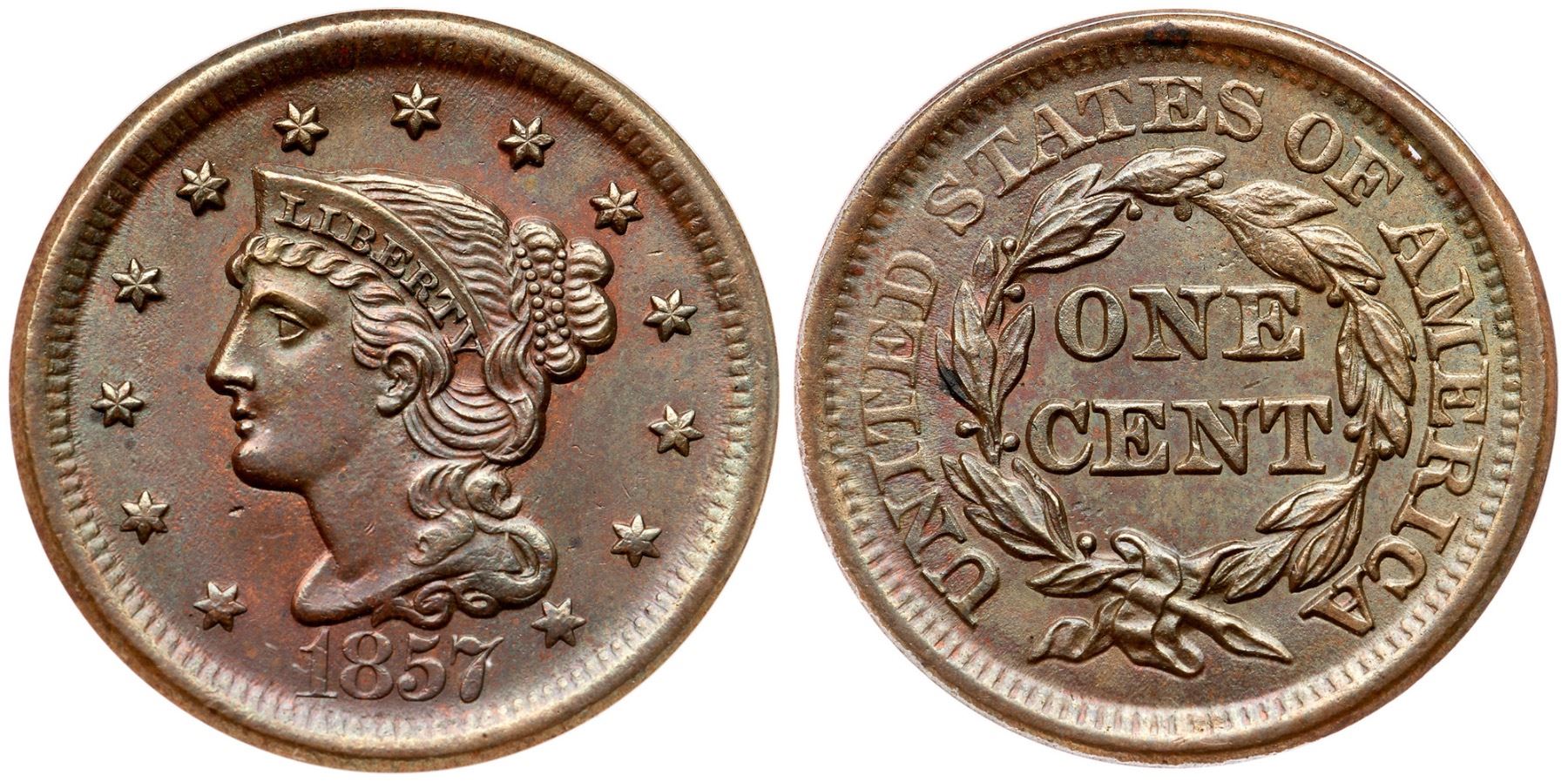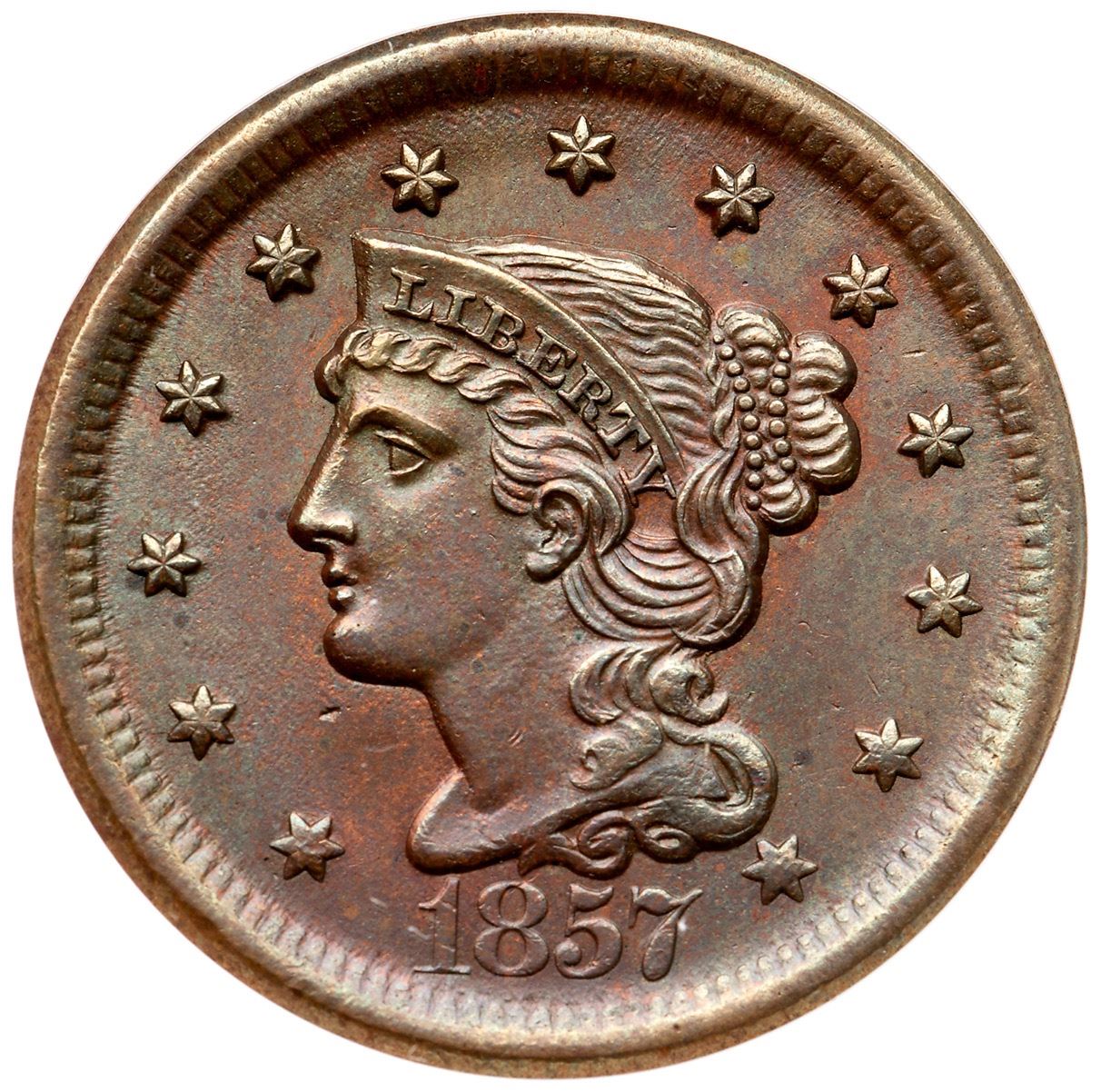 1857 N-1 R-1 Large Date ANACS MS62BNLustrous deep steely olive with underlying very faded mint red. The only mark is a pin prick below the chin. Satiny luster covering the surfaces. Our grade aligns with ANACS, MS 62.
