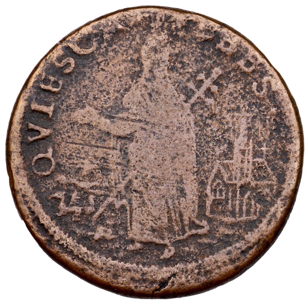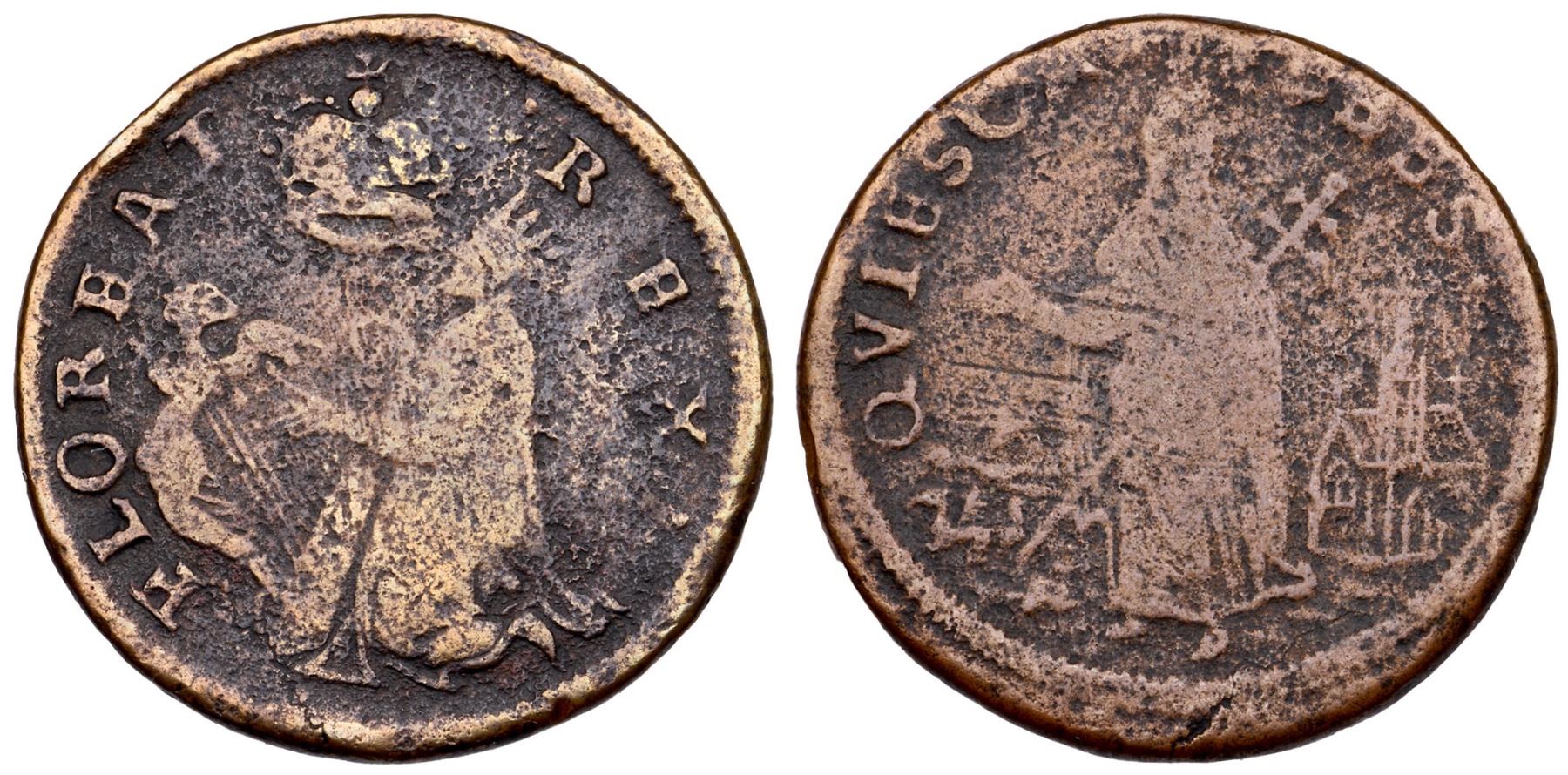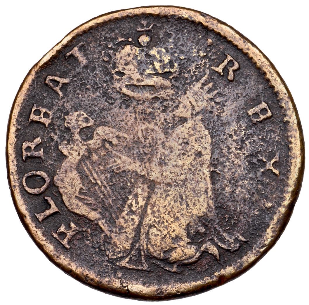 (1670) Breen-199 St Patrick Halfpenny VG10VF sharpness but fine to moderate porosity and roughness cover the surfaces. Semi-glossy medium brown and steel brown obverse, the reverse a couple shades lighter brown. The obverse is nicely centered while the reverse is slightly off center towards K-1. Strong legends. Ex; Doug Durasoff