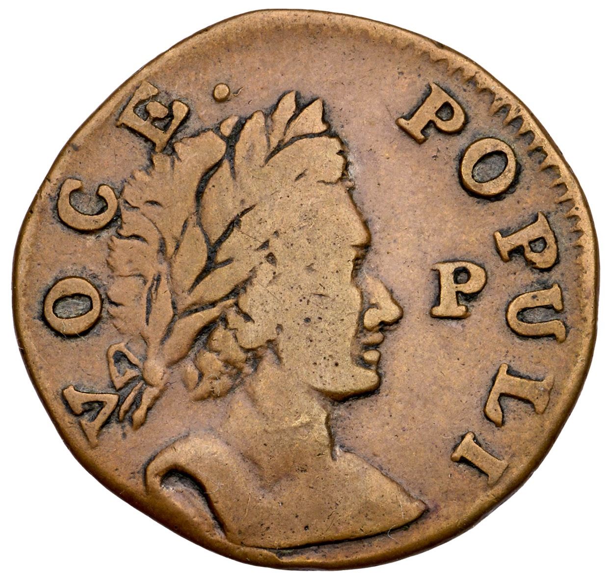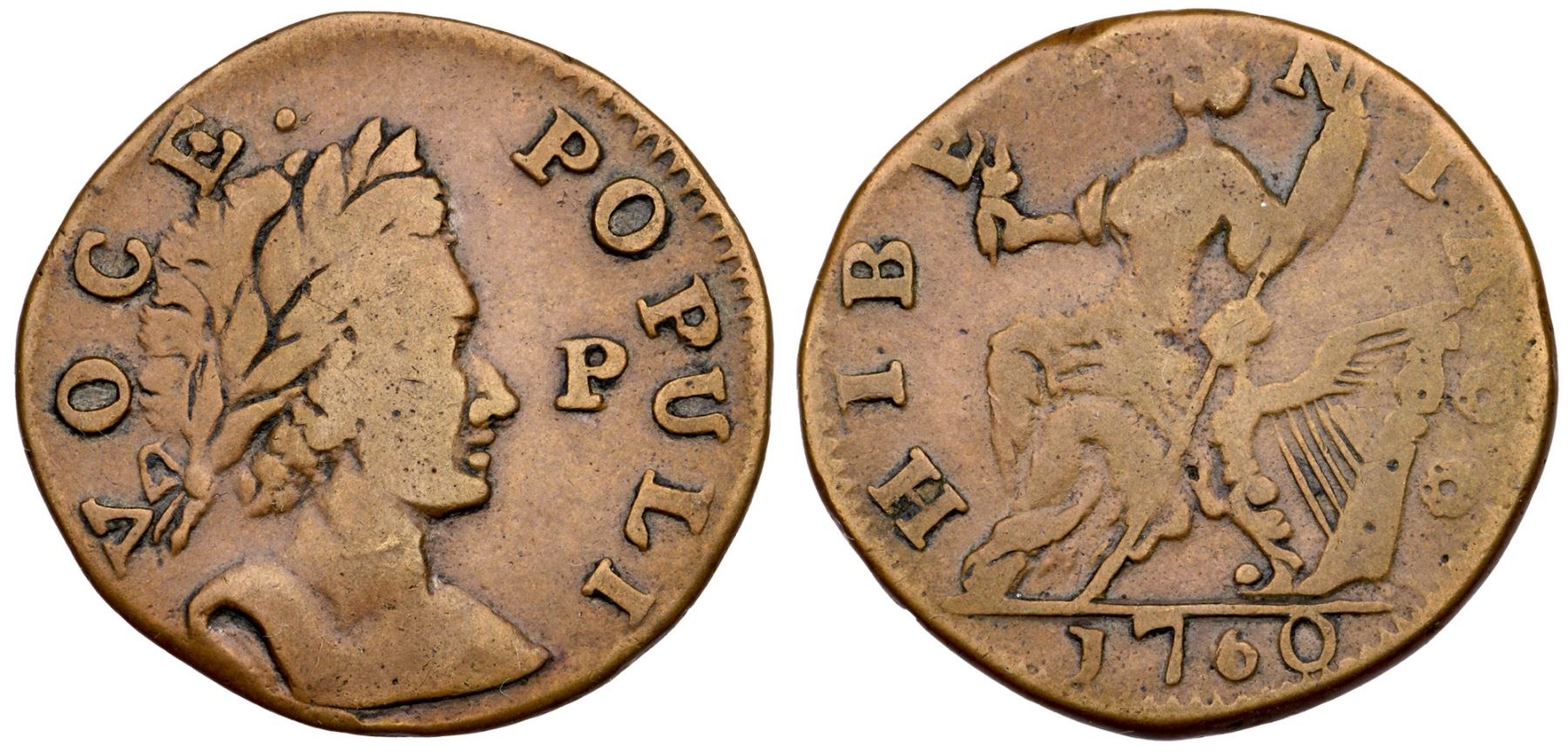 1760 Nelson-12 R-2 Voce Populi Halfpenny VF25P Before Face. Choice tan brown color. There is a bit of old crud in some protected areas but otherwise free of notable marks. No verdigris. Smooth, glossy surfaces. Ex; Paul Longvier 1995 - Bill MacK colleen 11/2008 - Doug Durasoff
