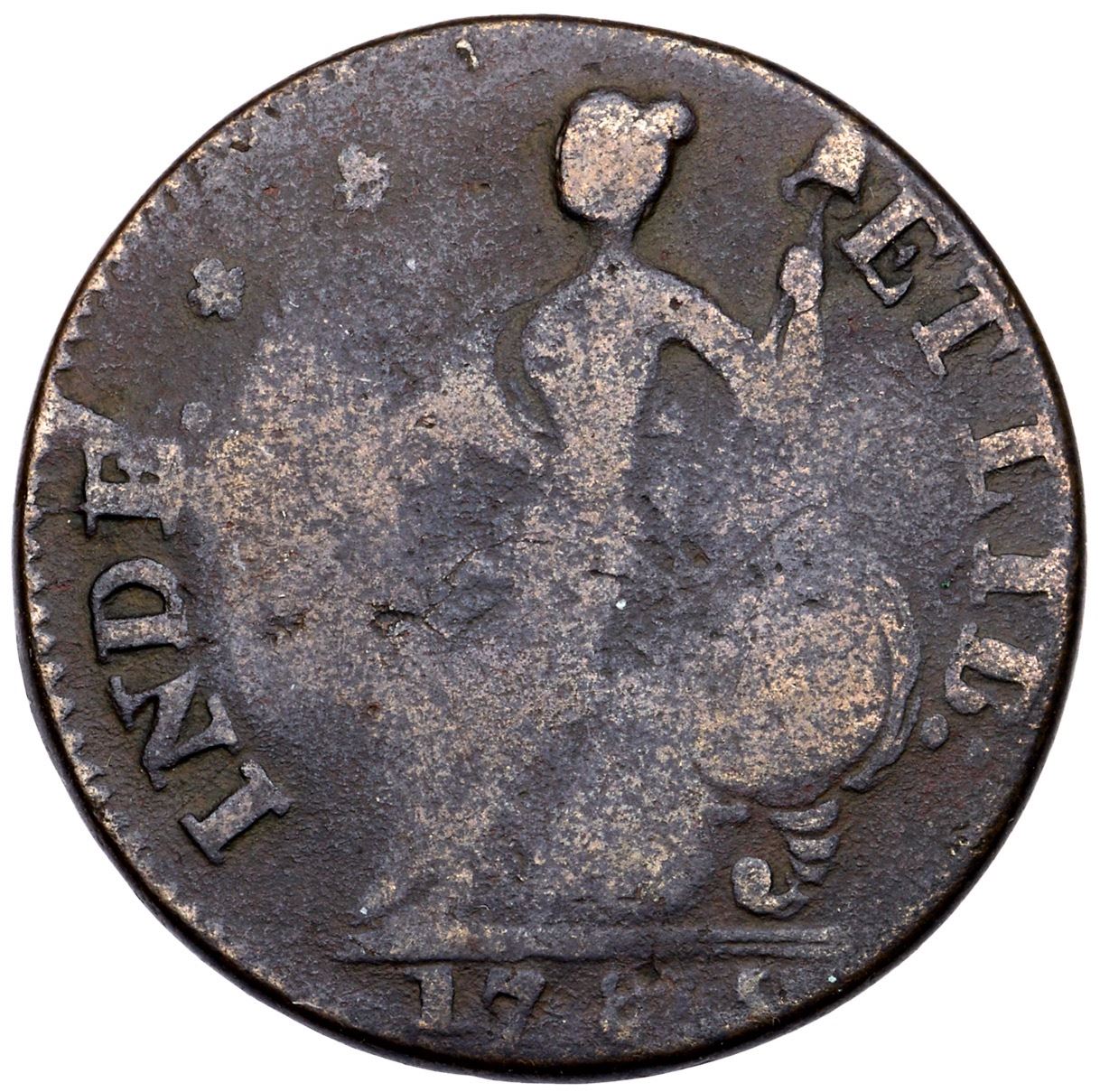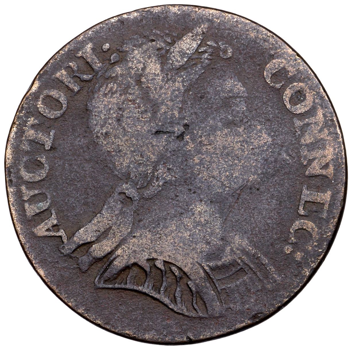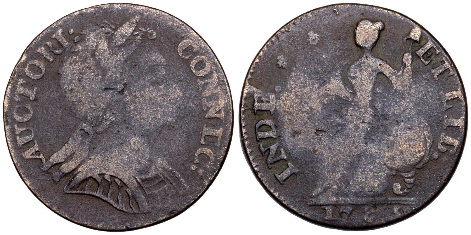1785 Miller 6.3-G.1 R-3 MBR Connecticut VG10Even dark brown planchet with fine granularity on the surfaces. Free of notable marks, choice for the grade. There is some weakness oat the chin on the obverse as well as the central areas of both sides due to die buckling. LDS, with a large die break at the redge to right of E in INDE and towards the front of it. 135.3 grains. Ex; C-4 Sale 11/2002:79 - CVM - Doug Durasoff