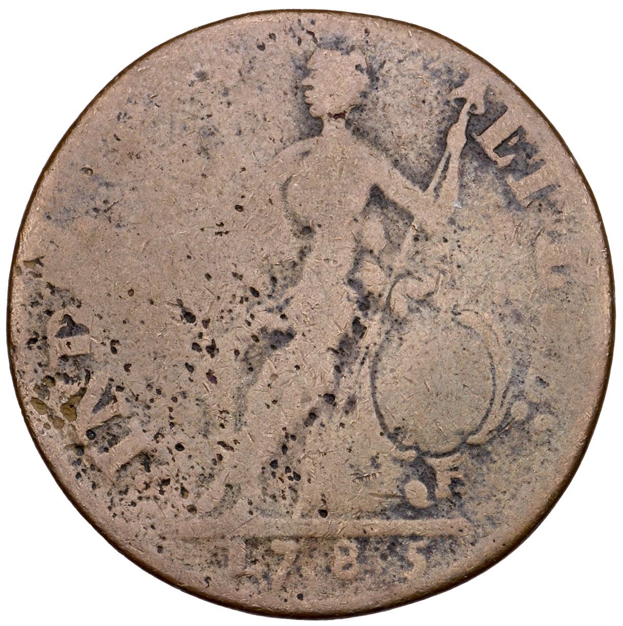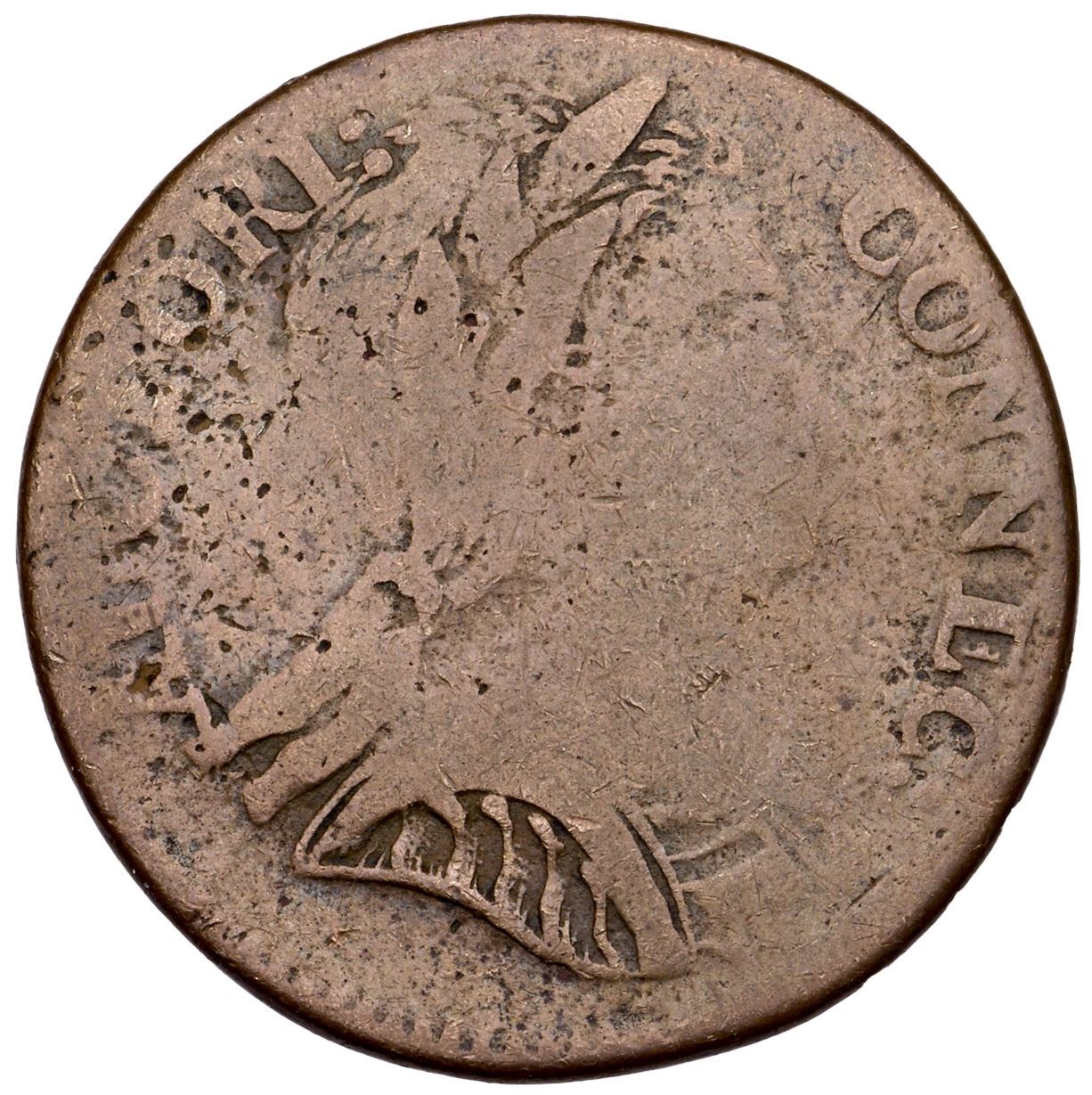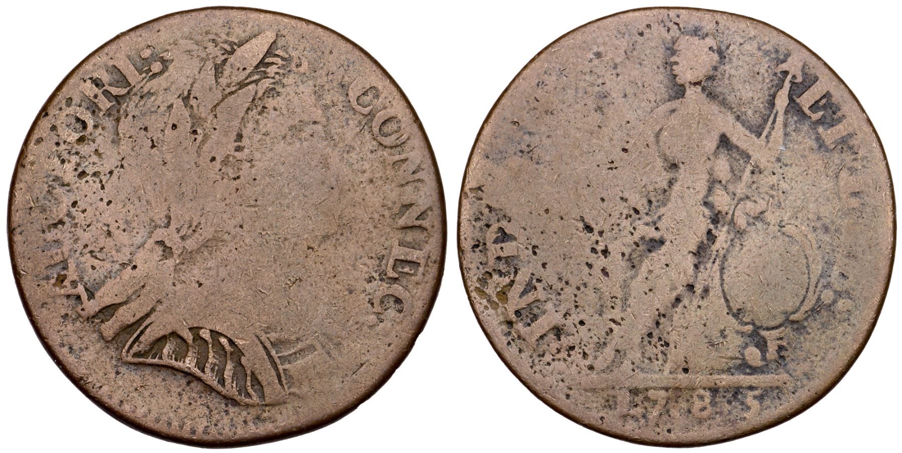 1785 Miller 6.3-G.2 R-5+ MBR Connecticut VG10Attractive medium olive and tan browns. There are several tiny pits scattered on both sides, most notably on the central to lower reverse and left obverse, Fairly smooth otherwise with no other notable contact marks. Partial but mostly readable legends, nice clear date. 132.0 grains.Ex; 1st C-4 10/20/95 Ken Mote Collection - Jeff Rock FPL 4/2003 Lot 190 - Doug Durasoff