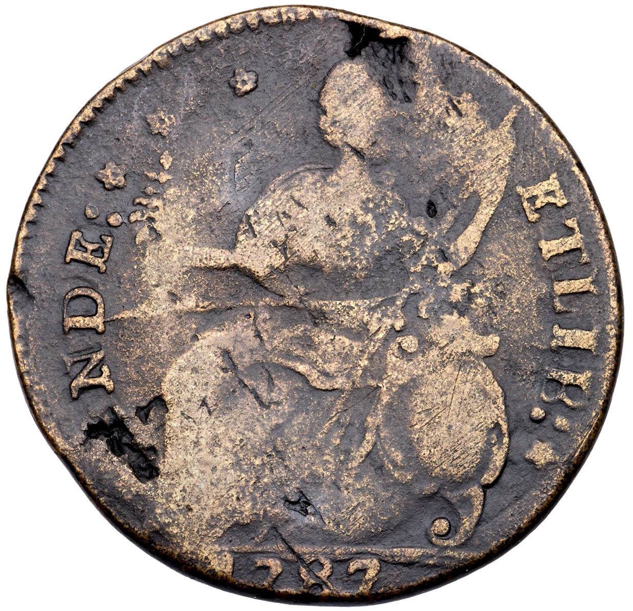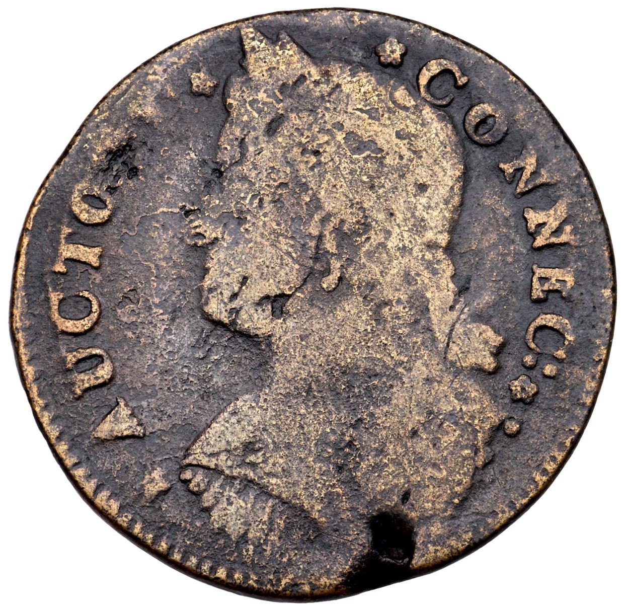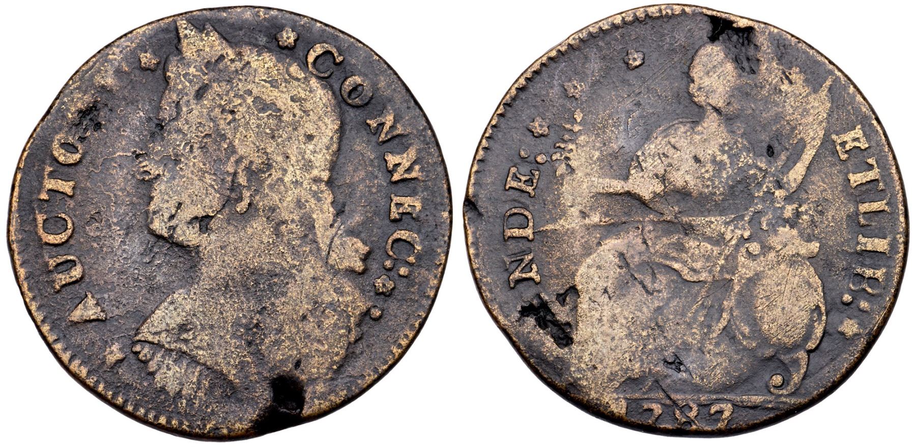 1787 Miller 33.2-Z.5 R-1 DBL Connecticut AG3VG sharpness but fine roughness covers the surfaces and there are several planchet flaws and voids on both sides. The most notable include a couple on the bottom obverse and upper reverse that don't quite extend through to the other side and another left of the legs. There is also a dig on the rim over D in INDE. A strong die break extends from D in INDE to the waist. Dark brown fields, lighter tan brown on some of the devices. Bold date and legendsEx; LW/DB - Doug Durasoff