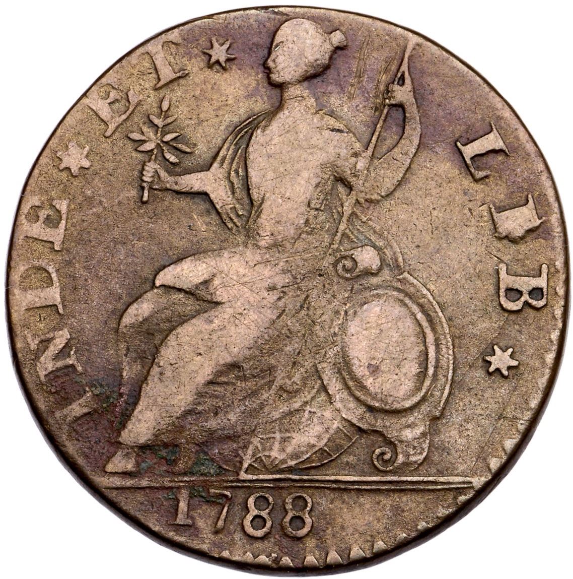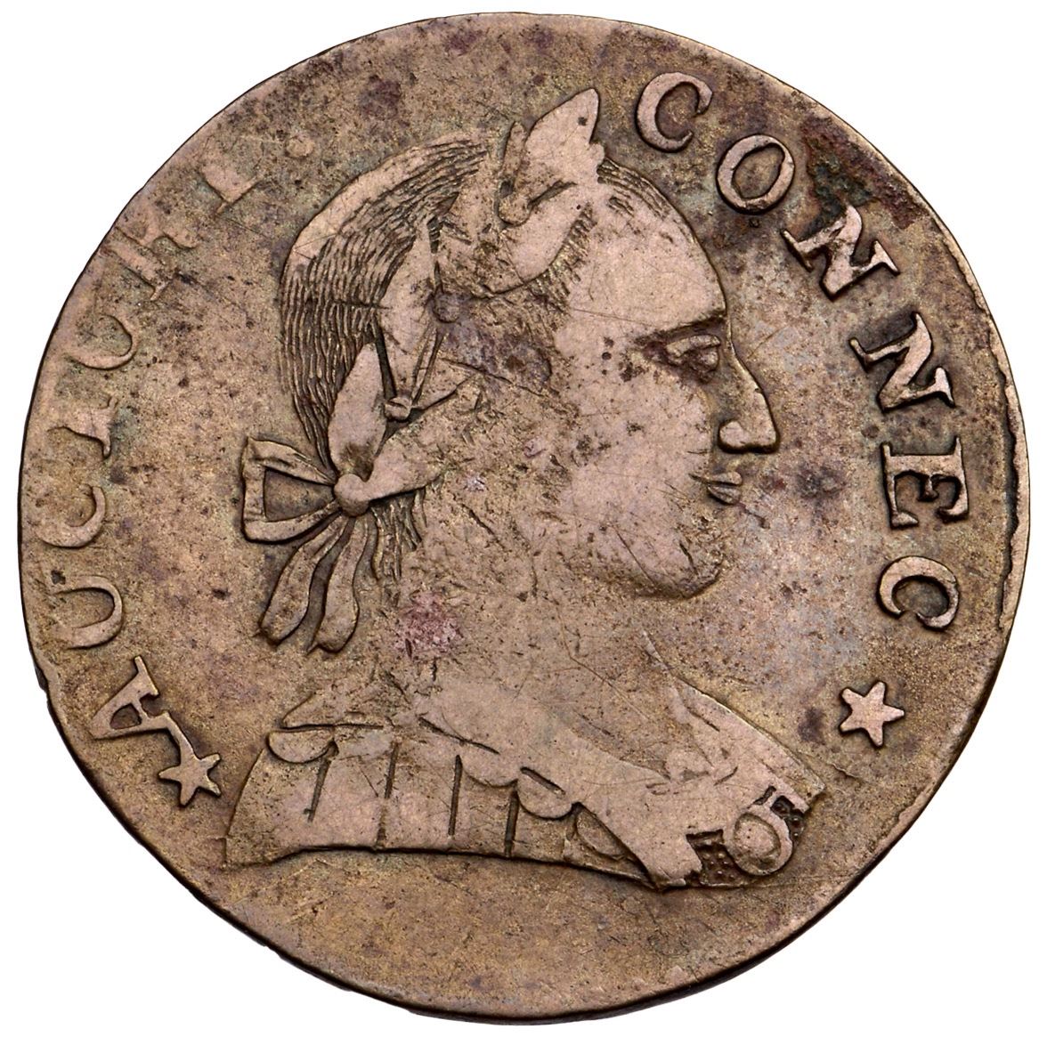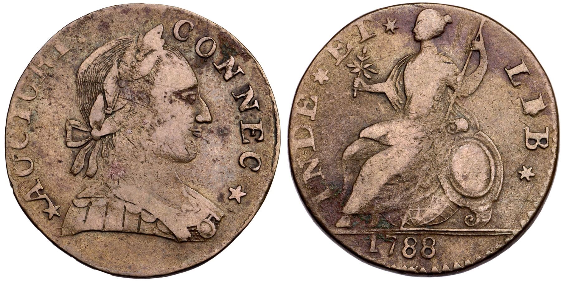 1788 Miller 2-D R-1 MBR Connecticut VF30EF sharpness but there are traces of old verdigris at the first N in CONNEC and from 17 to IN in the reverse, and a swipe of deeper crimson along the upper reverse. Uniform medium brown otherwise. There are fine scratches by the hand holding the pole, and a hairline scratch right of the shield. Well struck and nicely centered, with sharp details. EDS, before the heavy obverse cud at 7 o'clock. Ex; Robert Wyble 2/2013 - Doug Durasoff