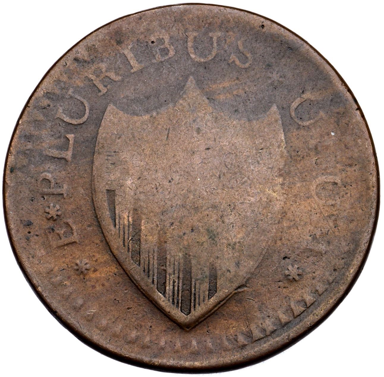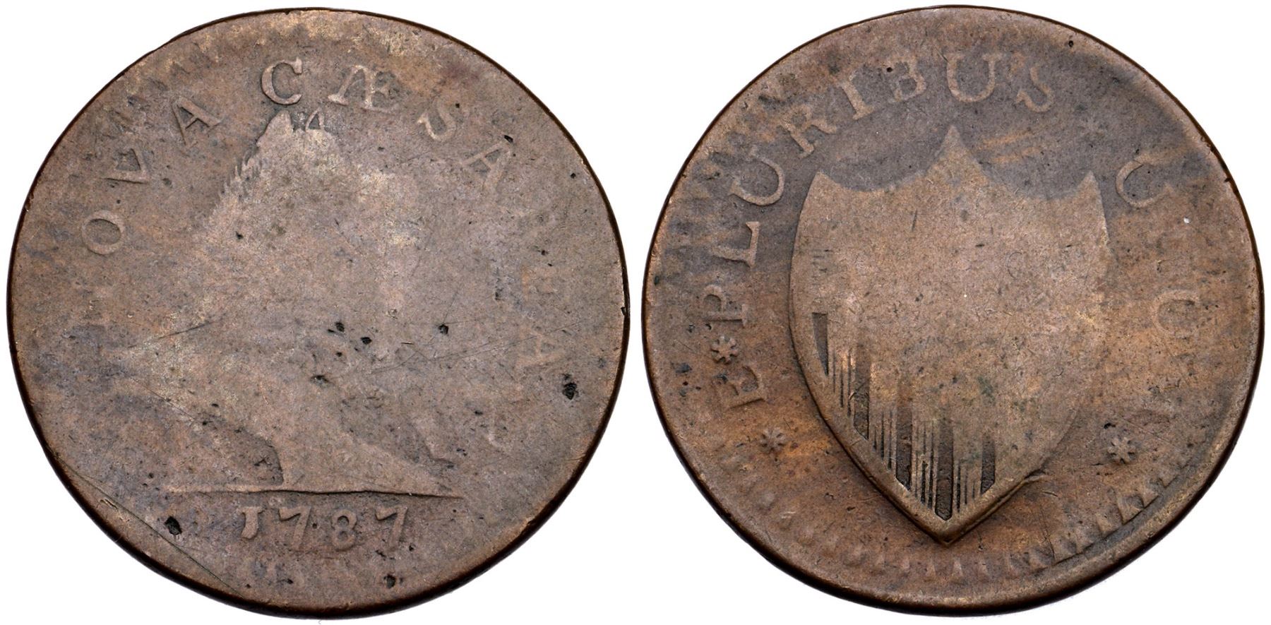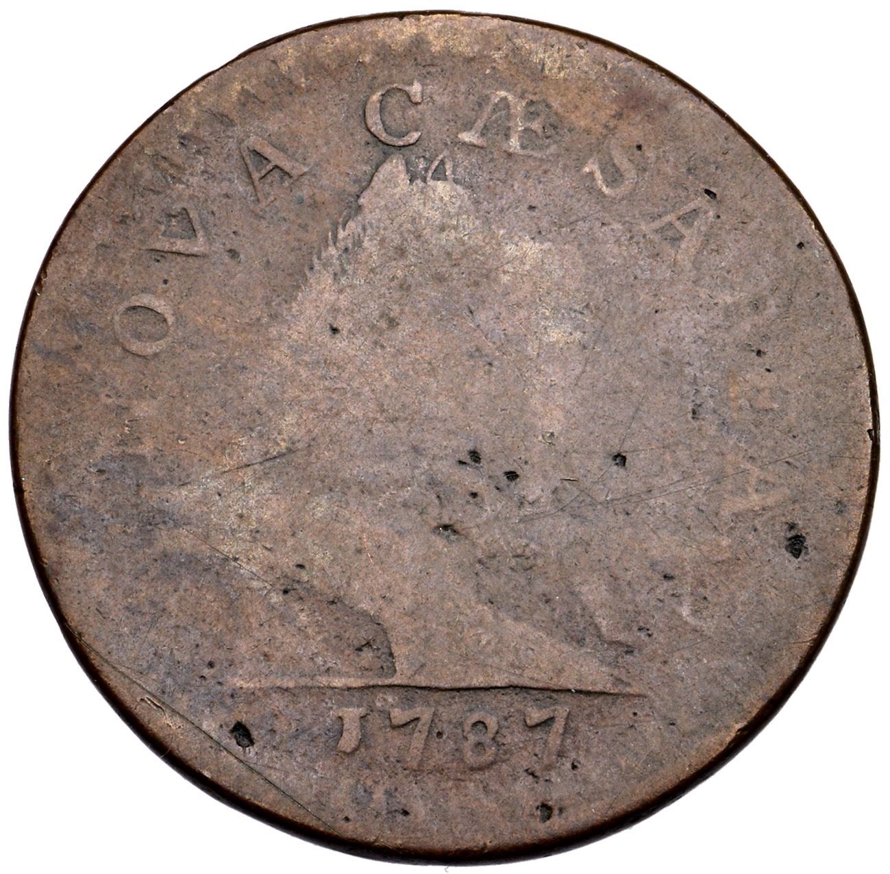 1787 Maris 64-t R-1 Large Planchet VG7An interesting piece, struck with bulging dies resulting in some areas being AG3 but others being near VF. There are some wispy pin scratches in the right obverse field, and one on the dentils left of the date. The legends and date are faint but completely readable, and the devices are mostly outlined. Rather glossy attractive tan and steel brown on smooth surfaces. Ex; Doug Durasoff