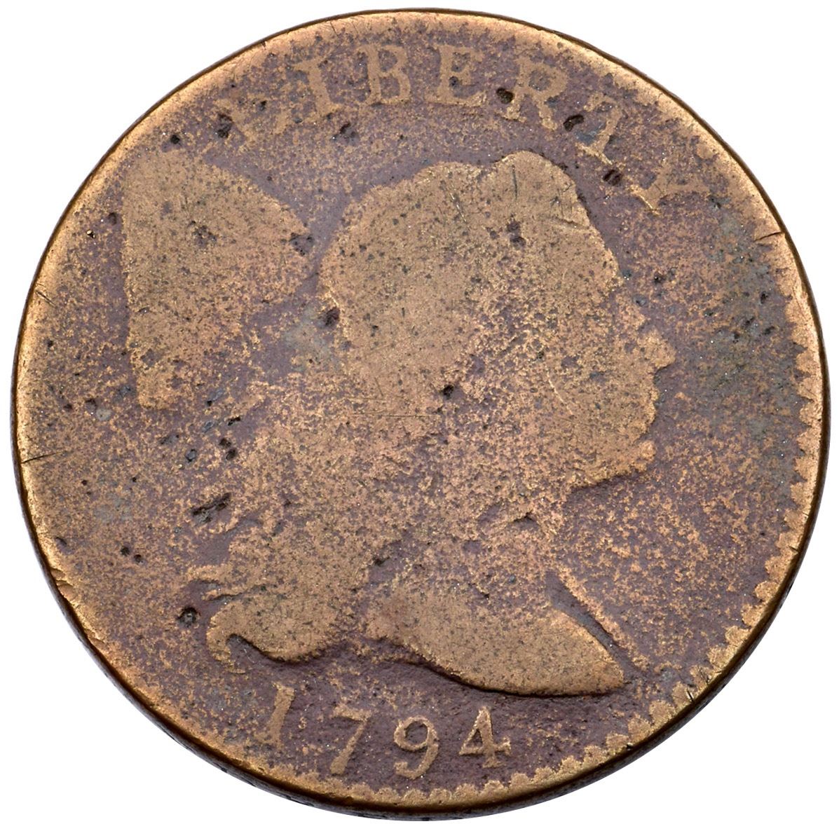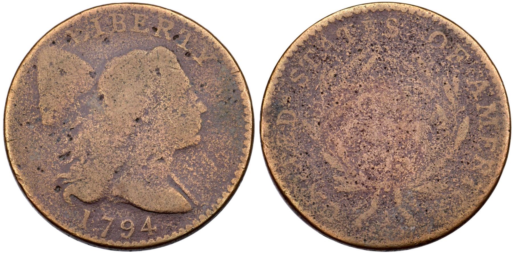 1794 S-66 R-5 AG3Slightly sharper, particularly on the obverse, but covered with fine roughness and a dozen very shallow, unobtrusive pits on the obverse. No verdigris or contact marks. Medium brown. The date is strong and the legends are mostly clear, but portions of the reverse are faint. EDS.Ex; Harry Weber 3/1975 - G. Lee Kuntz Superior 10/6/1992:74 - Dr. Ralph W. Rucker Collection Part 1 Lot 79 - Doug Durasoff