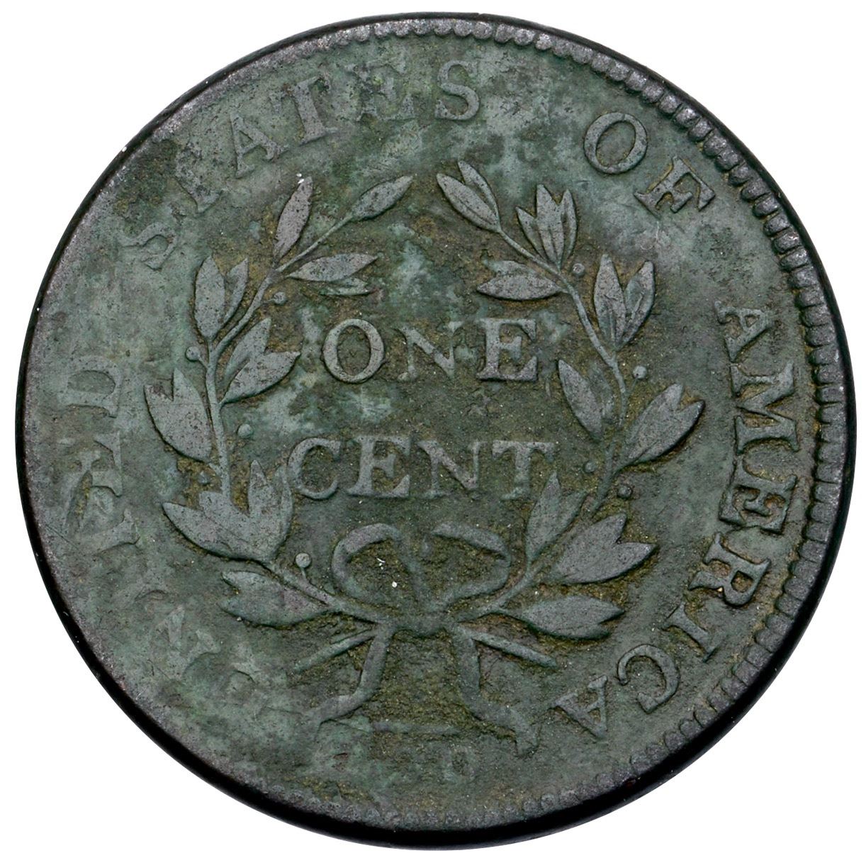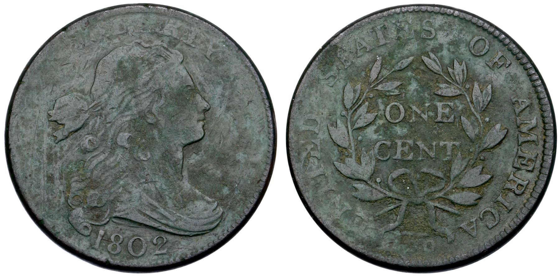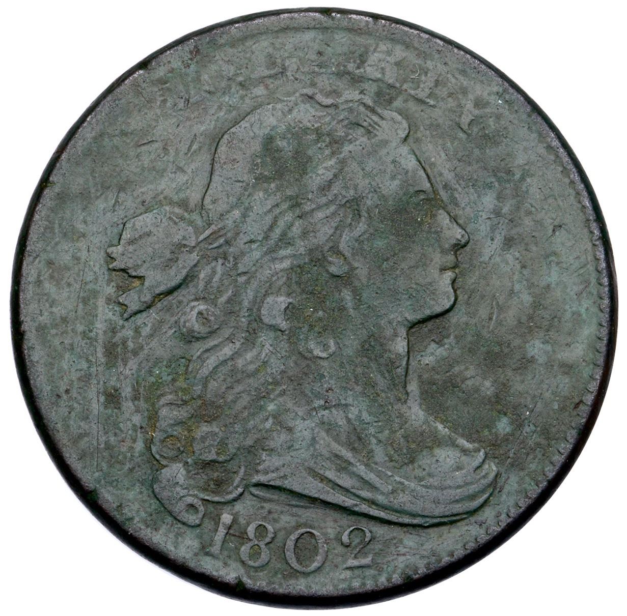 1802 S-238 R-4 G5Sharpness VG10 but dark olive and covered with greenish patina and verdigris. Most likely rescued from soil but the roughness is not severe. Some fine scratches hidden in the patina. The date and legends are complete and easily readable. MDS, Breen state II, with additional die cracks on the reverse.Ex; Dr. Ralph Rucker Collection Part II lot 327 - Doug Durasoff