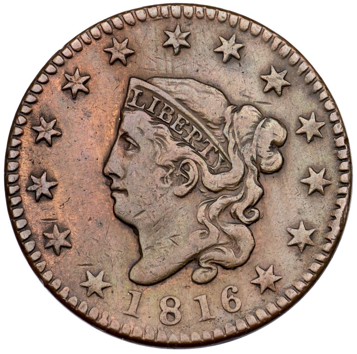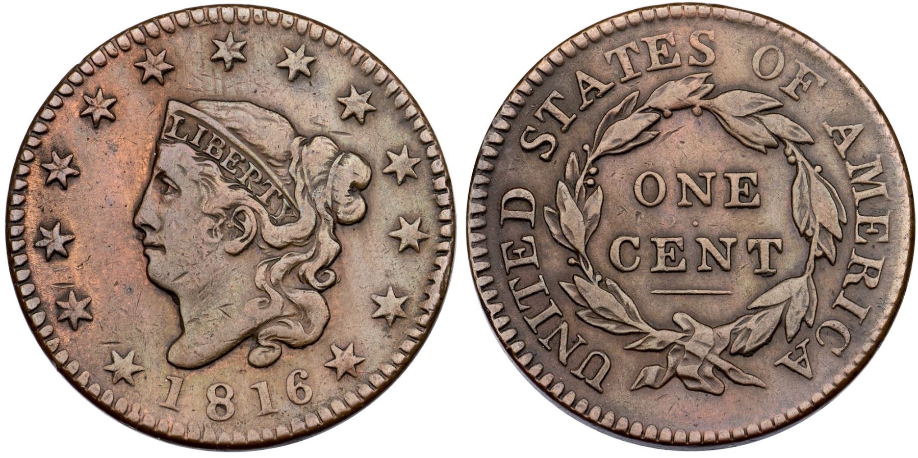 1816 N-8 R-1 VG10VF sharpness but cleaned and now toned steely olive brown with artificial orange underneath. There are a few minor nicks and faint hairlines on both sides, nothing major. MDS with a reverse die crack through the tops of NITED ST. Ex; Col. E.H.R. Green - Green Estate - Eric P. Newman / B.G. Johnson d.b.a. St Louis Stamp and Coin Co. - Eric P. Newman ($0.40) - Eric P. Newman Numismatic Education Society HA 11/2017:15363 - Doug Durasoff