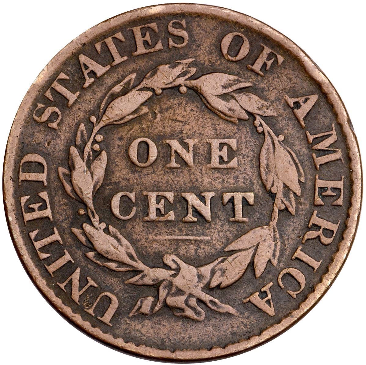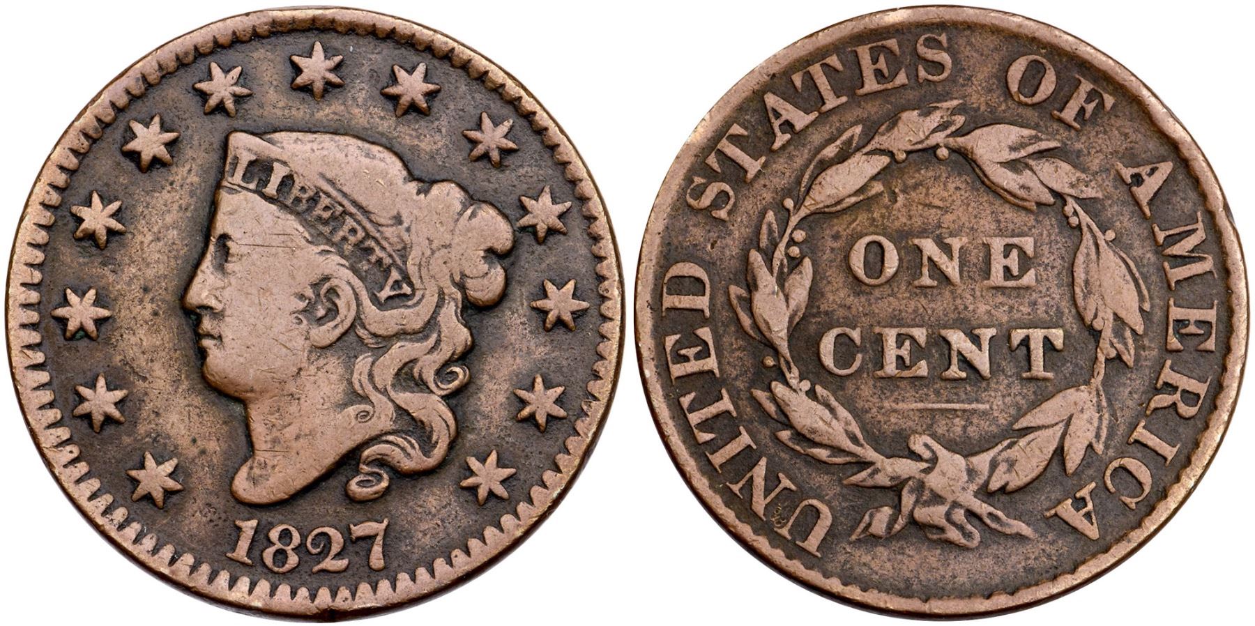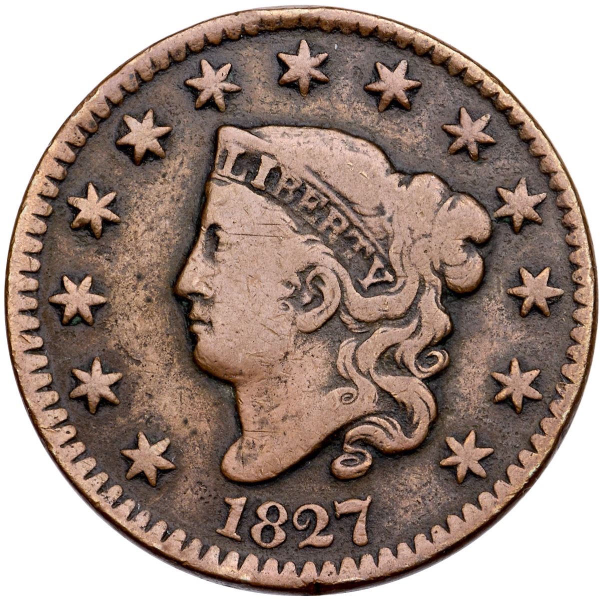 1827 N-4 R-2 VG7Semi-glossy attractive two tone tan brown with darker steel in the protected areas. There is very fine roughness in the fields and protected areas, smoother on the high points. The only marks are a rim bruise at star 7, a rim nick under 2, and horizontal tiny pin scratches behind the eye and on the lower neck. Bold date and legends. Ex; Burress 10/1985 - Doug Durasoff