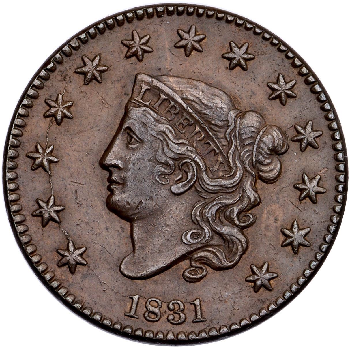 1831 N-9a R-2 VF35AU sharpness but there is a light layer of oxidation dulling the natural gloss, especially on the reverse, and scattered nicks and abrasions on the obverse. The most notable marks are a couple nicks behind the chin, a couple before the chin, and one below the gap between stars 6-7. Light chocolate and olive brown. EDS.Ex; Doug Durasoff