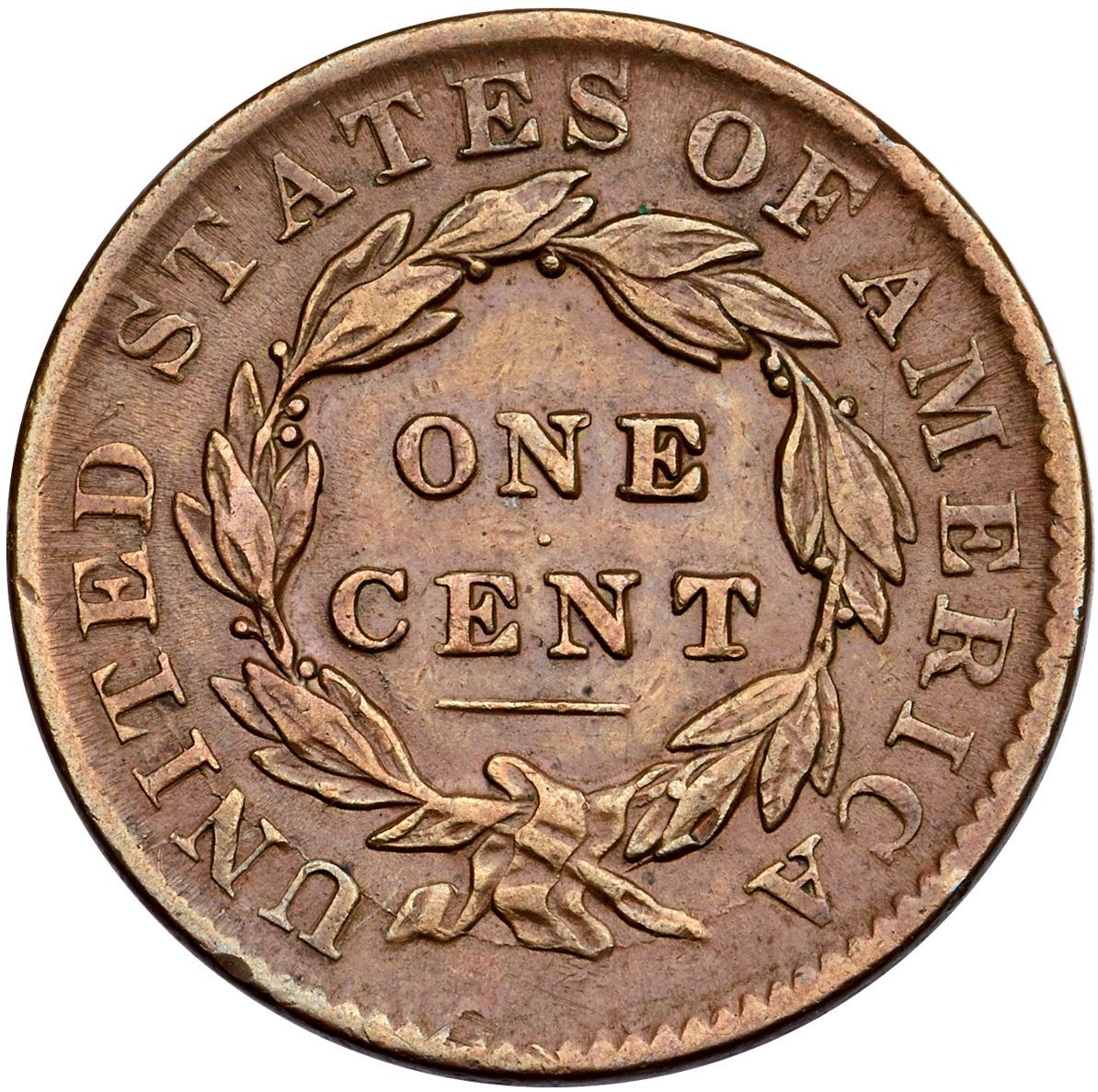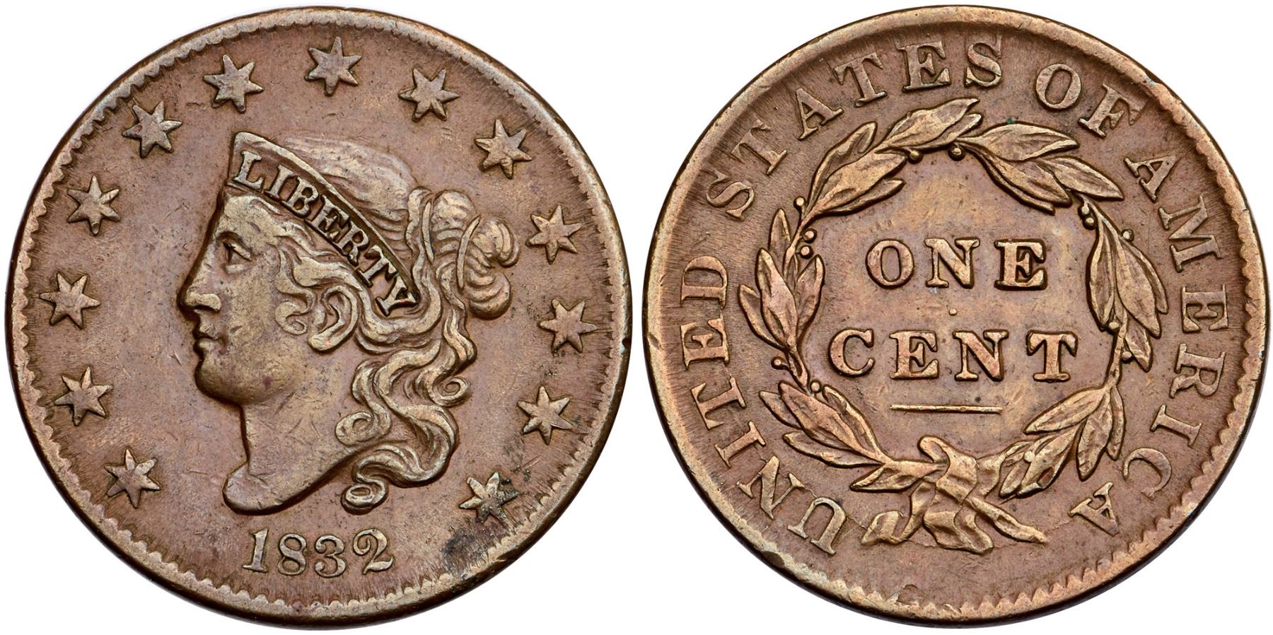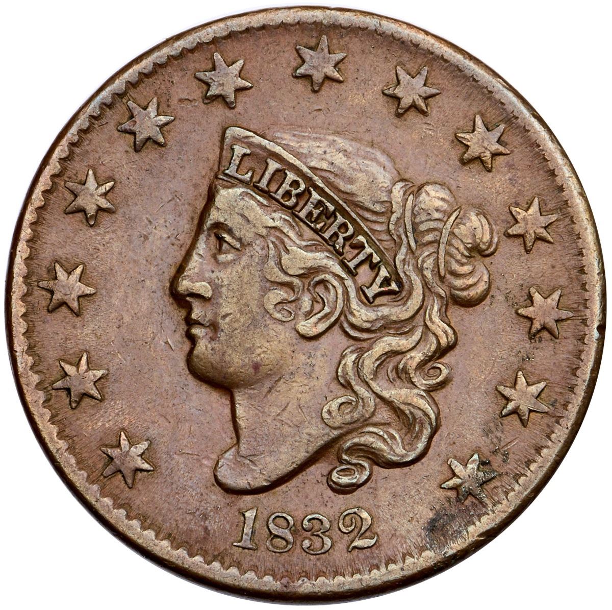 1832 N-1 R-2 Small Letters Reverse VF30Ten points sharper but there are a few minor oxidation spots minimized by a retoning. Those include trivial spots on the nose and behind the lips visible under a glass, and a more notable granular spot at star 13. Only a few trivial ticks, including one on the neck, and on the rims at star 11 and U and E in UNITED. Attractive light brown and light olive with subtle steel tones highlighting the devices. Smooth surfaces. LDS.Ex; Doug Durasoff
