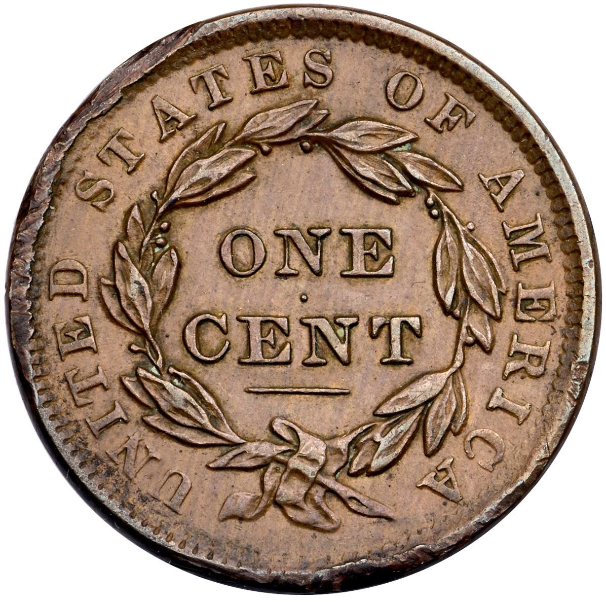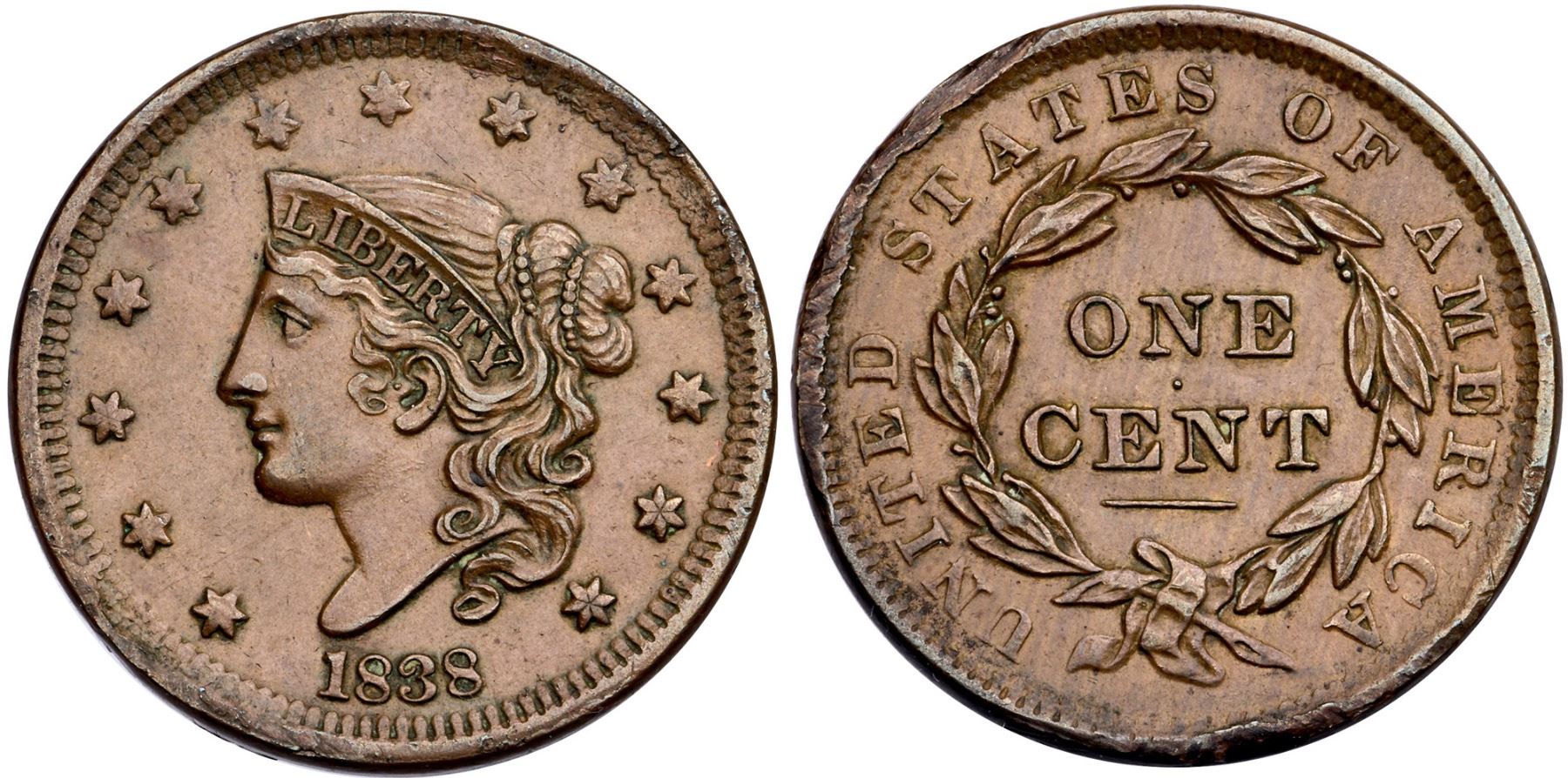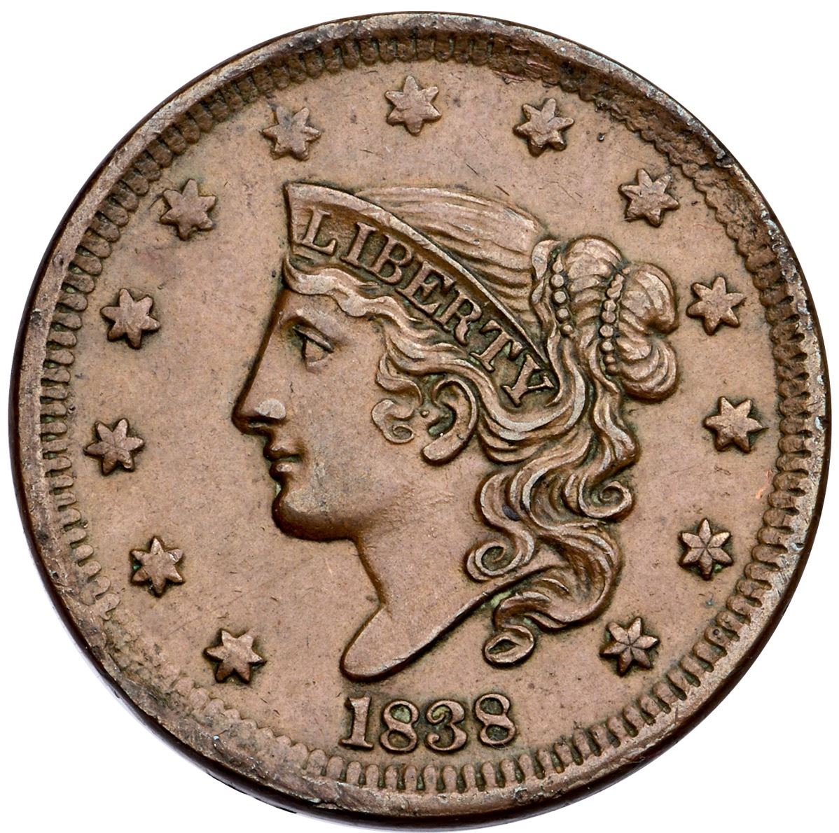 1838 N-1 R-1 VF30EF sharpness but there is notable damage along the rims over TED-STAT and from CA to below the ribbon. Otherwise smooth and attractive with choice light brown surfaces, subtle wood grain like patterned on the reverse. E-MDS, with crumbling at the right base of N in UNITED, and narrow rim cuds at stars 6-7 and star 1. Ex; Tom Reynolds - Doug Durasoff