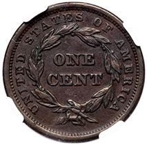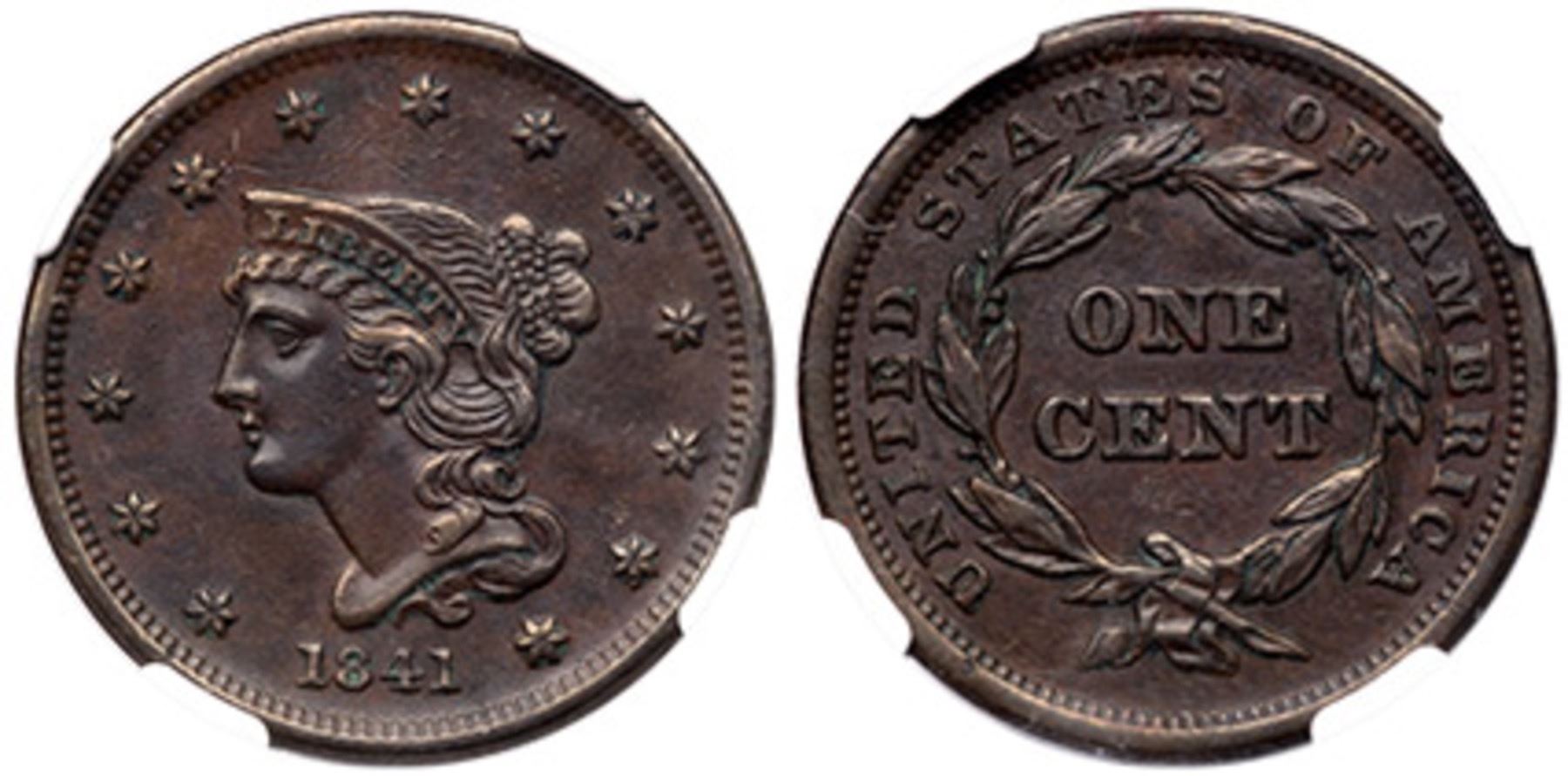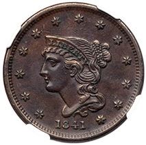 1841 N-6 R-1 NGC AU53EF40 sharpness but there are traces of old verdigris in the protected areas of the laurel and some stars. Glossy chocolate and dark browns. Original mint frost covers the protected areas, particularly the reverse. E-MDS, die state a. Our grade is VF35.3838450-021Ex; Bob Klosterboer
