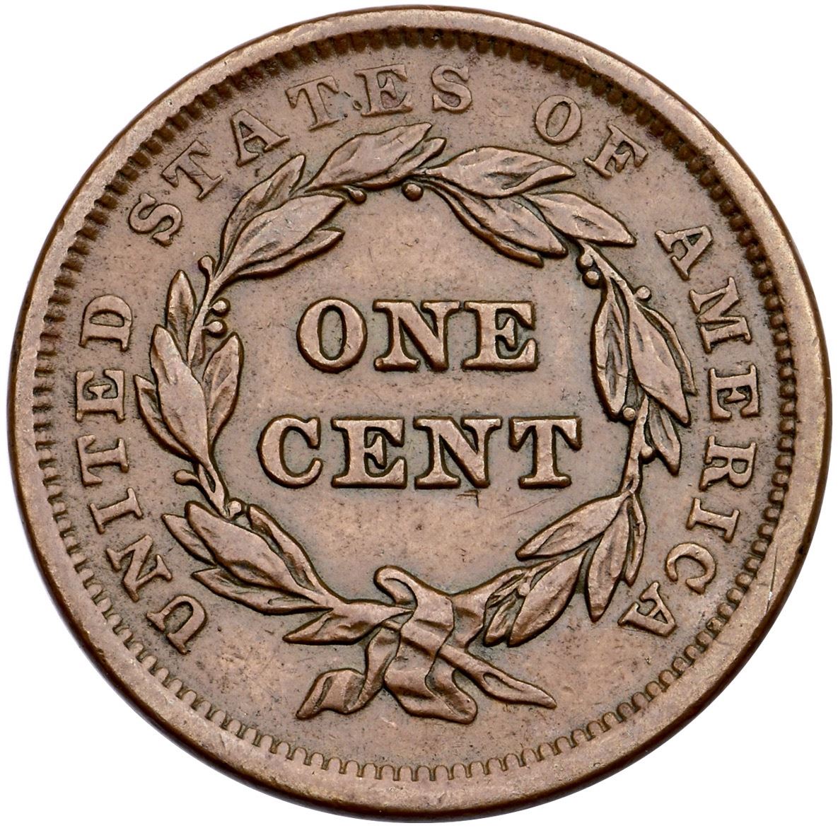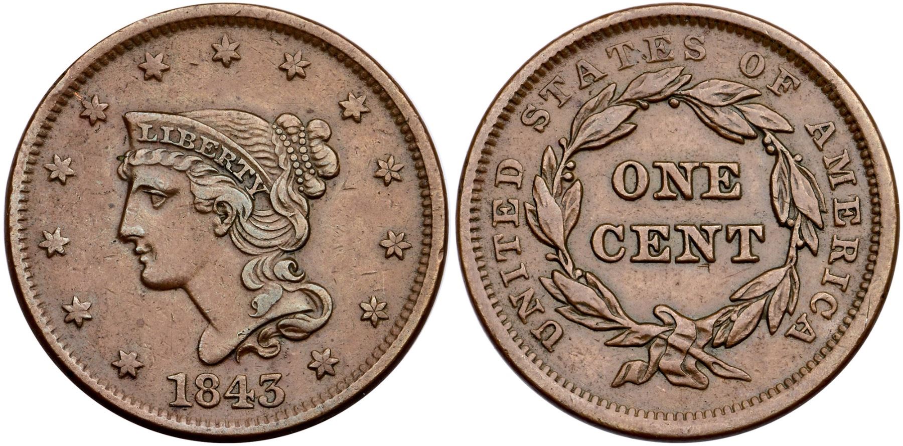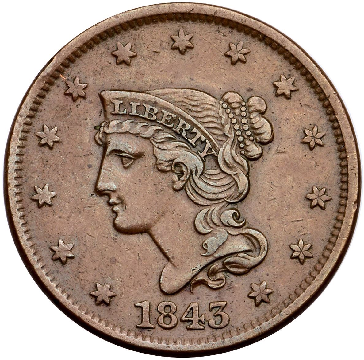 1843 N-11c R-2 EF40Choice glossy medium brown. There are a few trivial marks, the only worth noting is a rim bruise at star 5. Smooth, glossy surfaces, M-LDS, die state c with the very faint die crack from the dentils through I and the wreath towards T in CENT. Ex; Doug Durasoff