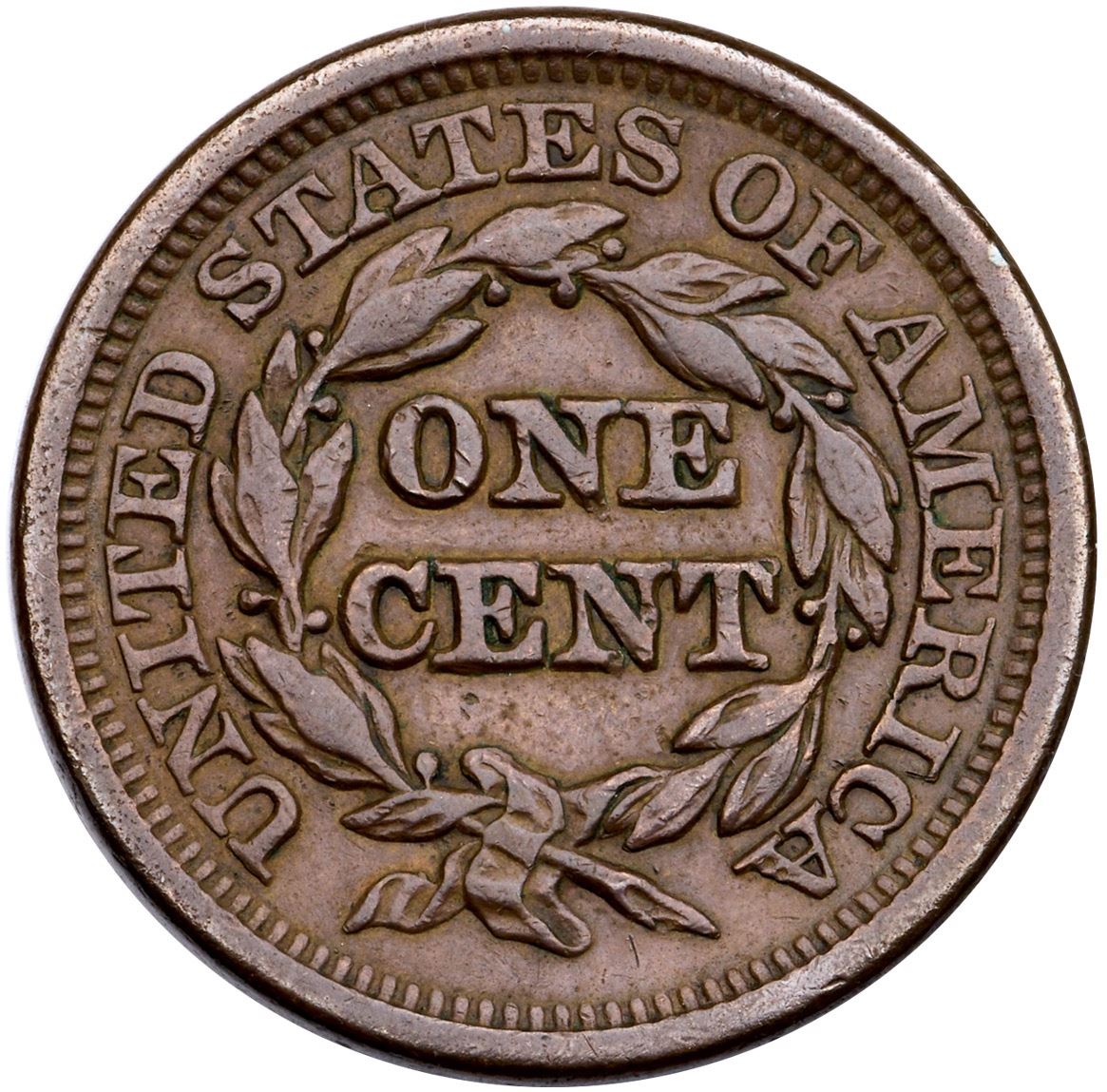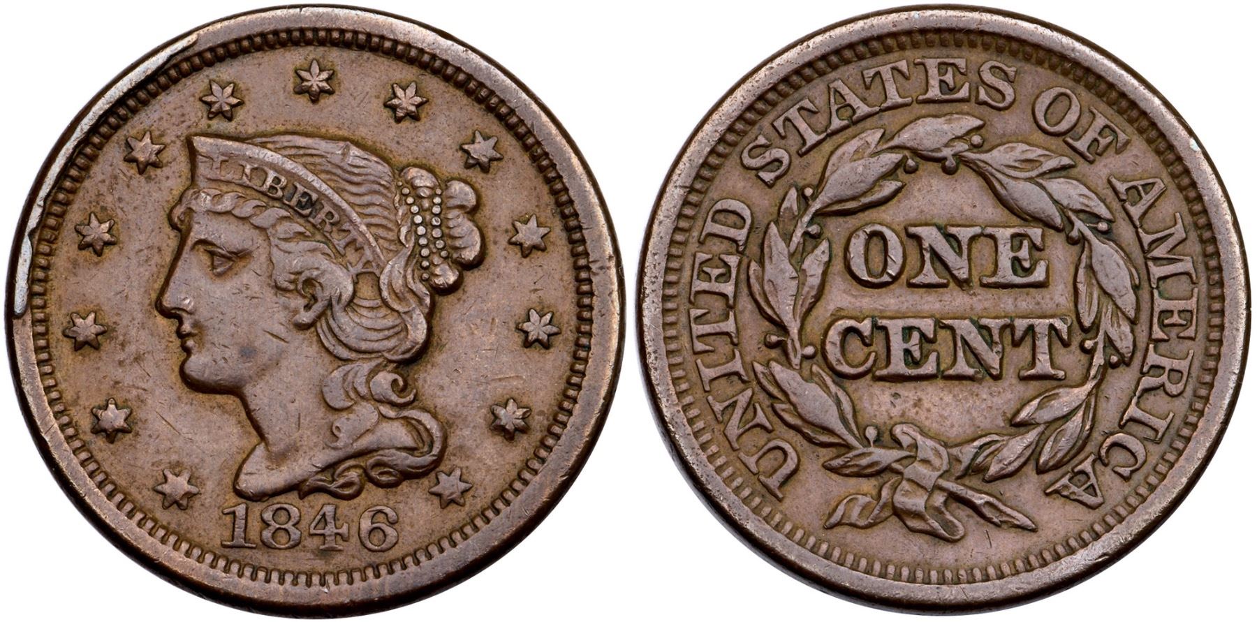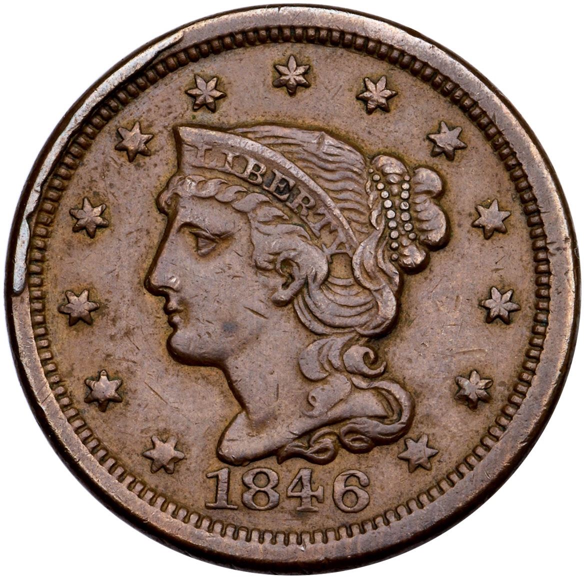 1846 N-10 R-4 VF30Near EF sharpness but there are several scattered nicks and a bit of old crud in the protected areas. THe notable marks include a nick atop the hair, one on the cheek, and a couple in the fields over stars 1 and 12. chocolate and olive browns. LDS, die state b, with the large obverse rim cud from stars 3 to 6. Ex; Kevin Vinton - Doug Durasoff