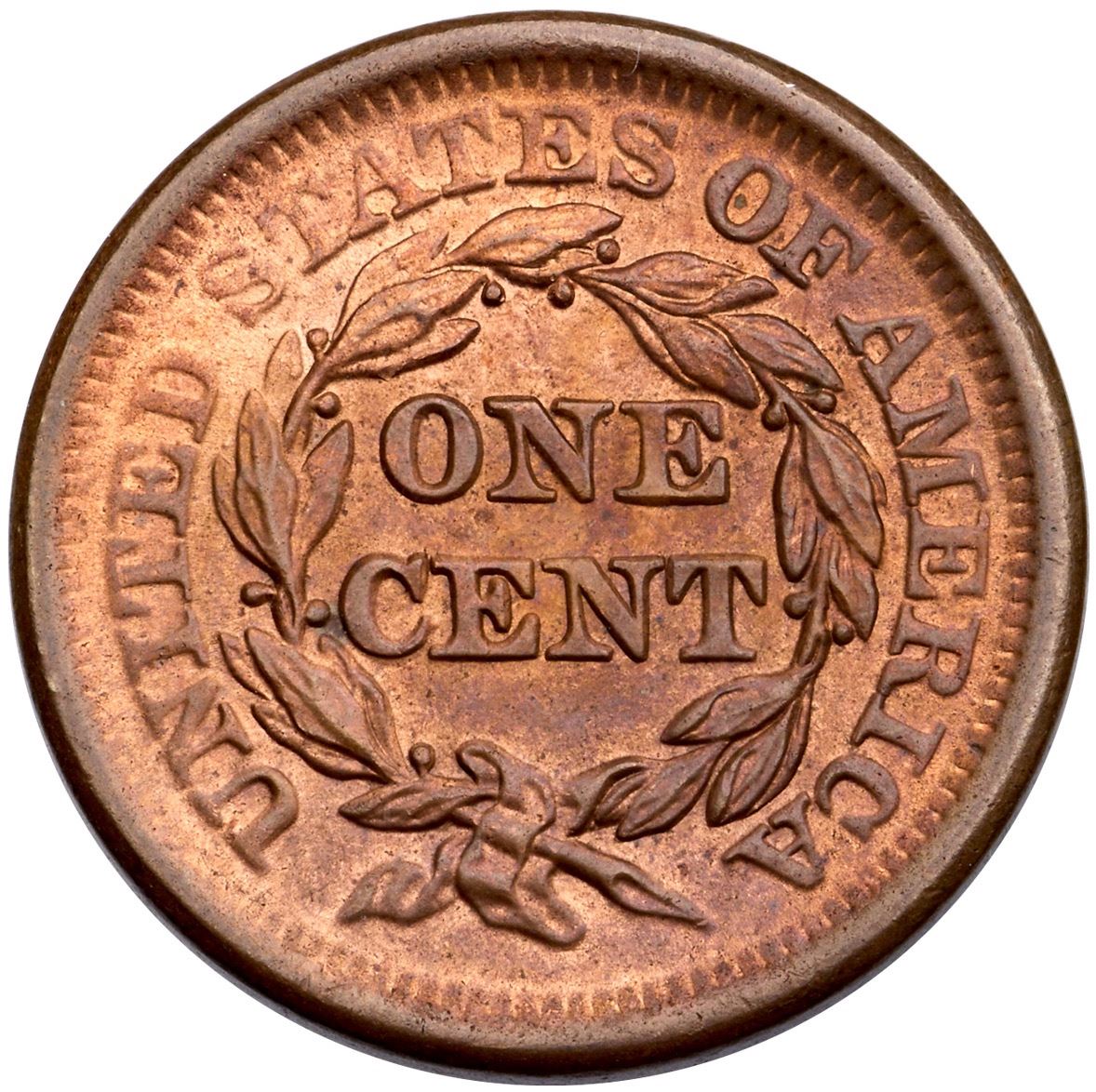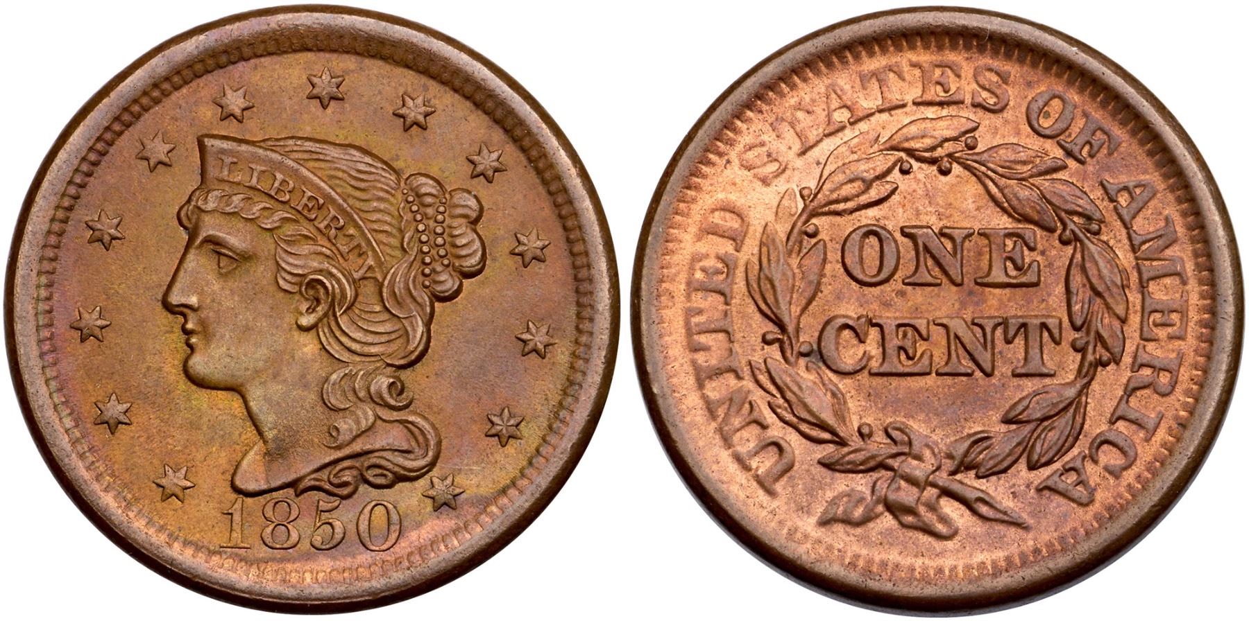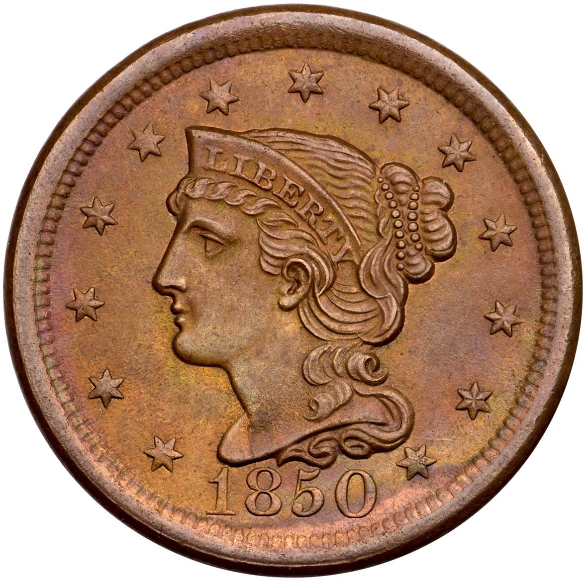 1850 N-7b R-1 MS60Unc sharpness but retone long ago and now toned mellowed olive and steel with iridescent gold and olive tones and faded mint red underneath on the obverse. The reverse is faded mint red and light steel. Free of notable marks. Subdued but lustrous surfaces. M-LDS, die state b.Ex; Kevin Vinton - Doug Durasoff