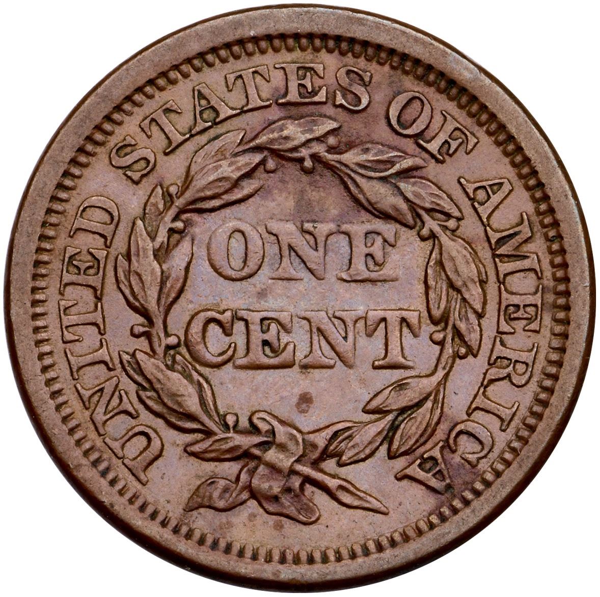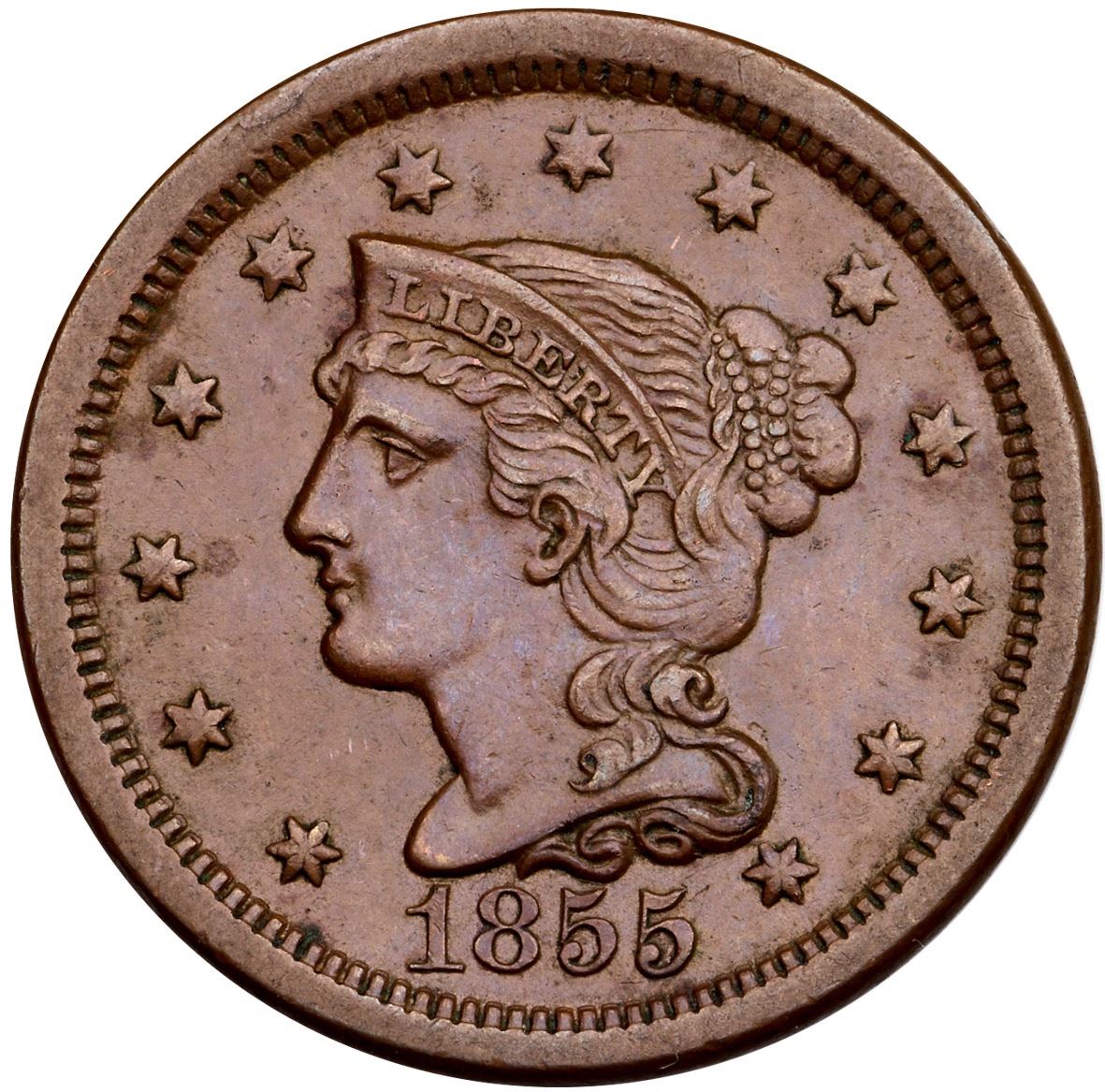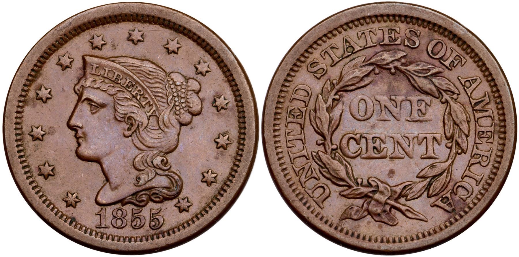1855 N-12 R-1 EF45AU sharpness but there are a couple areas of very fine roughness along the wreath under ES in STATES, and at CA in AMERICA. There is also a low spot under the right base of N in CENT, as struck. Glossy, smooth medium brown surfaces otherwise. EDS, die state a. Ex; Doug Durasoff