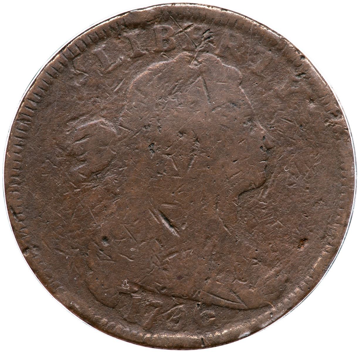 1796 S-119 R-3 ANACS G4 Details (Damaged)G4 sharpness but there are several notable nicks, marks, and rim bruises on both sides. The most notable include a nick above the shoulder, one in the hair above the forehead, and bruises at IB in LIBERTY and below the date. Full date and readable legends. Smooth surfaces. Reverse of 1797. Our grade is AG3.7447034Ex; Frank Kuhn eBay 2024 - Dennis Fuoss