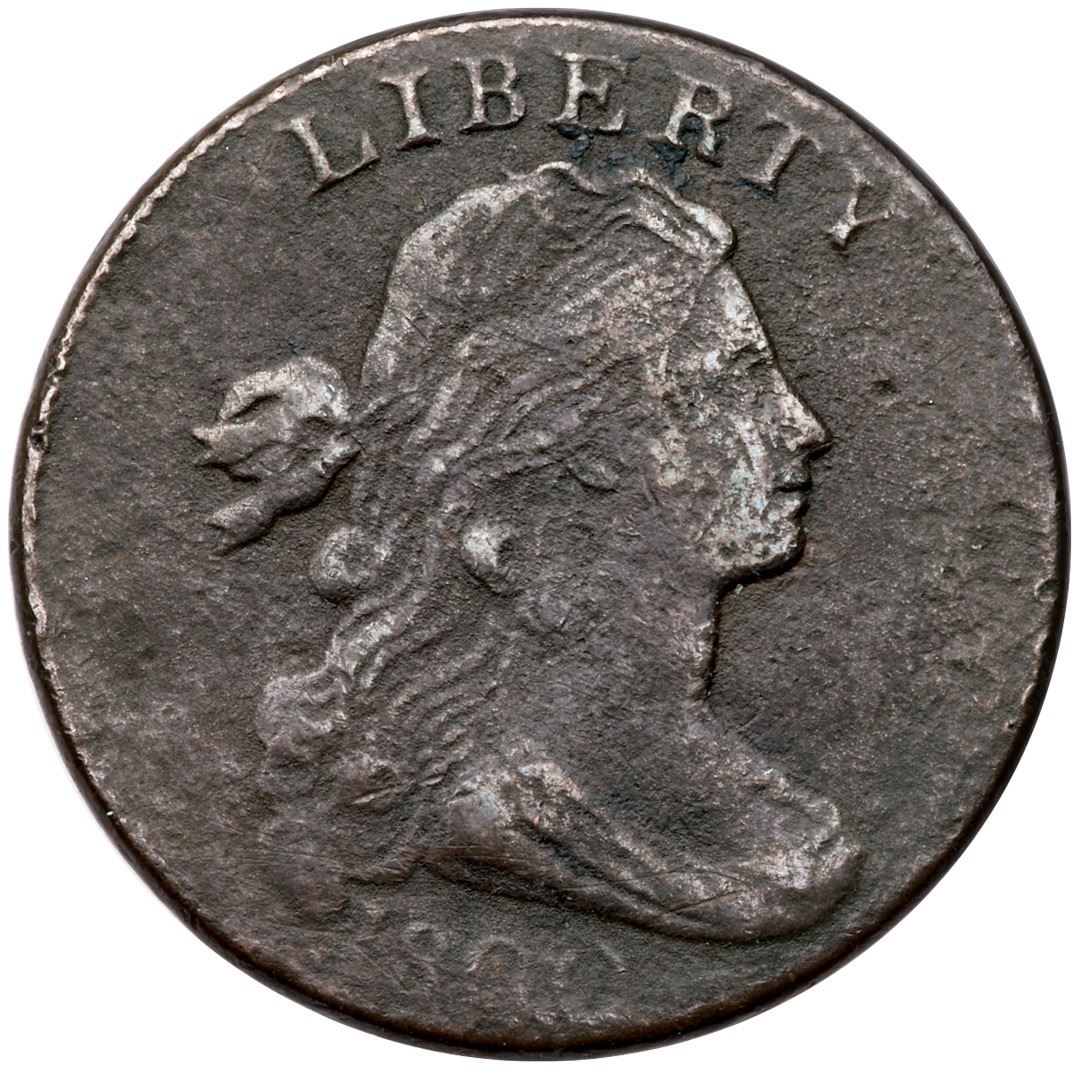 1800 S-210 R-5 VG8VF sharpness but corroded with granular surfaces. A dull hairline scratch in the hair and a deeper scratch at the wreath below ERI are the notable marks. Full date and legends. Ex; Henry Hettger