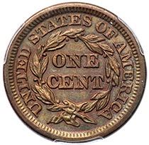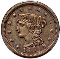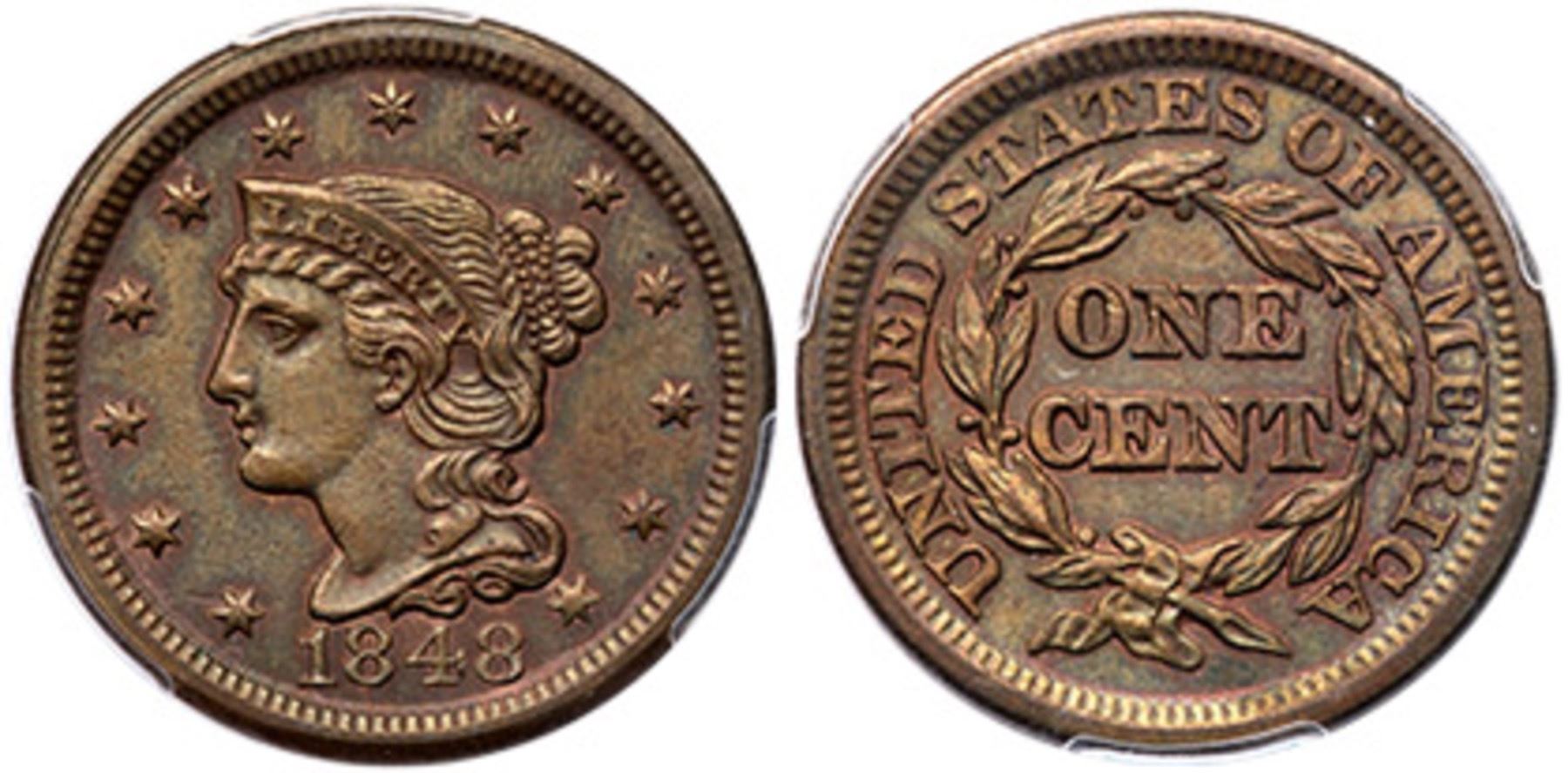 1848 N-9 R-1 PCGS AU58AU55 sharpness but recolored and now golden olive brown with underlying faded red. Only the most trivial of marks and abrasions, nothing noteworthy. E-MDS, die state b. Our grade is AU50. 1883.58/33521012Ex; Bob Klosterboer