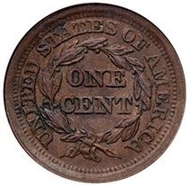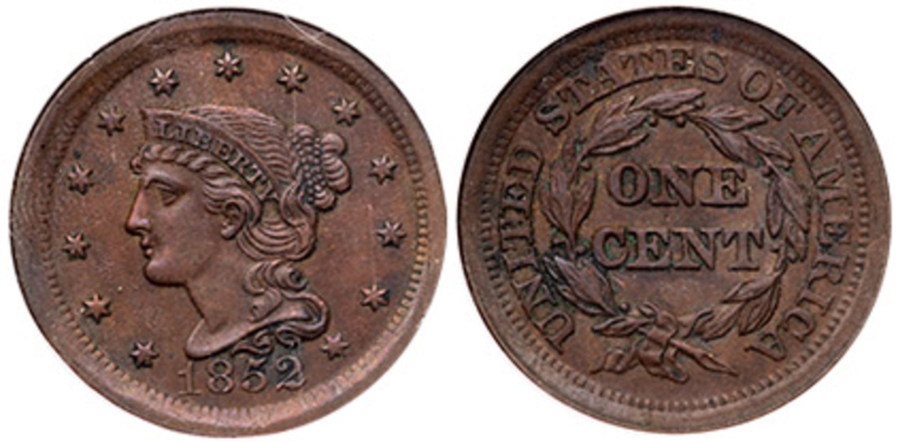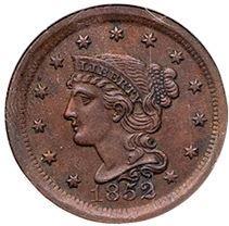 1852 N-22 R-1 NGC MS61BNAU sharpness but there is dark crud and traces of verdigris built up in the protected areas. Otherwise smooth surfaces. Mostly chocolate with puffs of darker steel around the peripheries. E-MDS, die state b. Our grade is EF45.1279558-002Ex; Bob Klosterboer