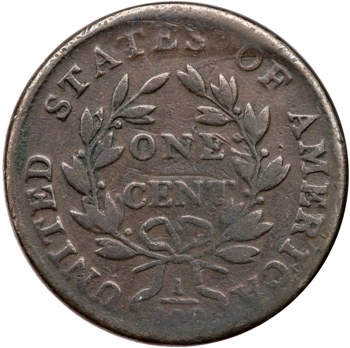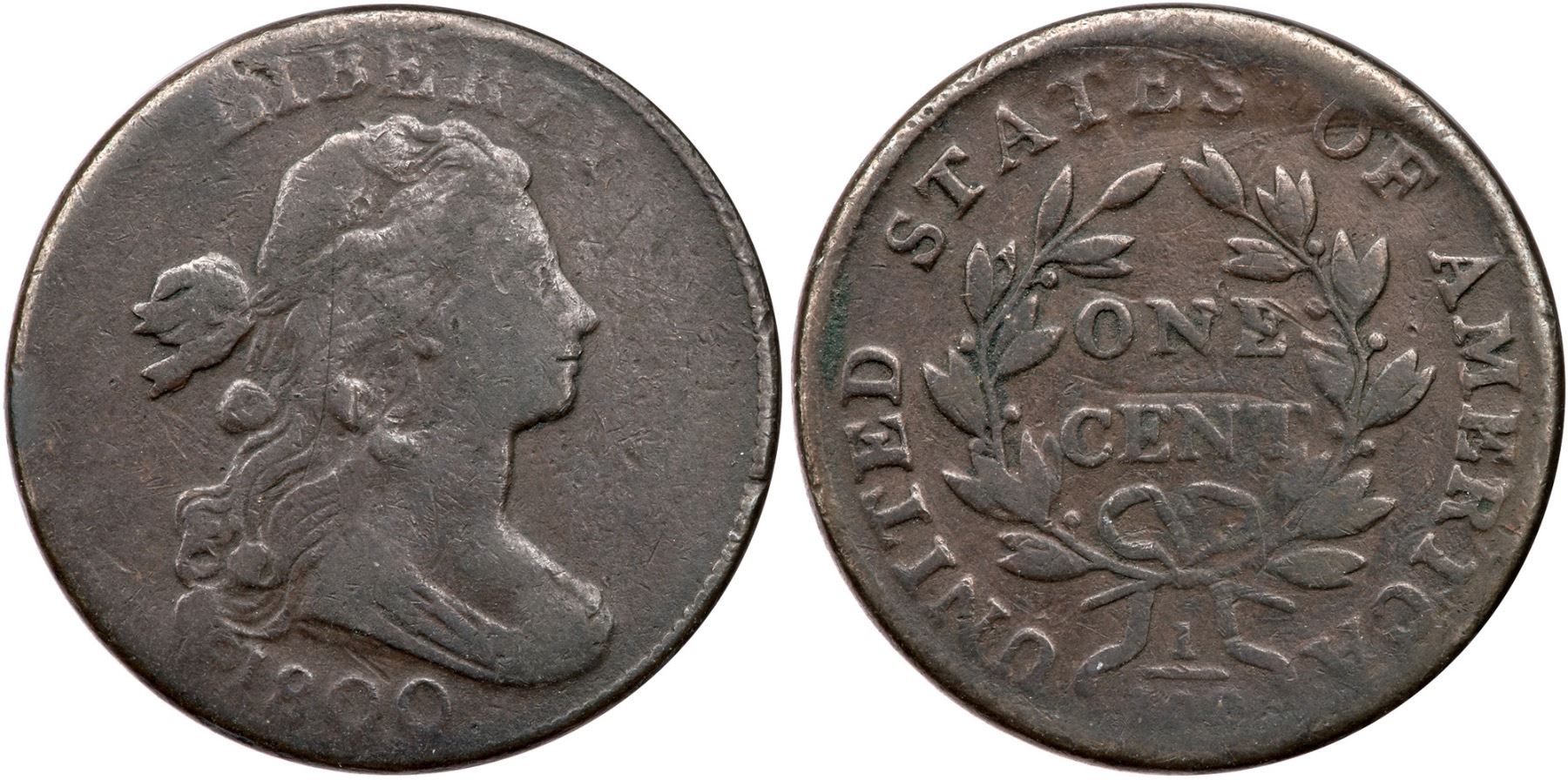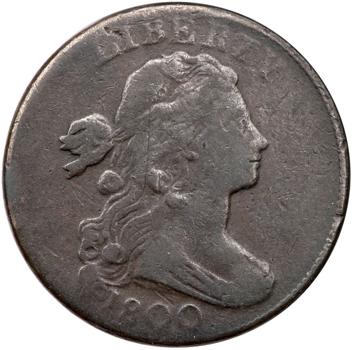1800 S-203 R-3 VG10Semi-glossy dark chocolate and olive browns with traces of old crud in some protected areas, most notably over ED in UNITED and the left wreath below. There are also a couple vertical hairline scratches on the hair and neck, and a horizontal one over CENT. Full date and legends. Ex; Tim Paquette