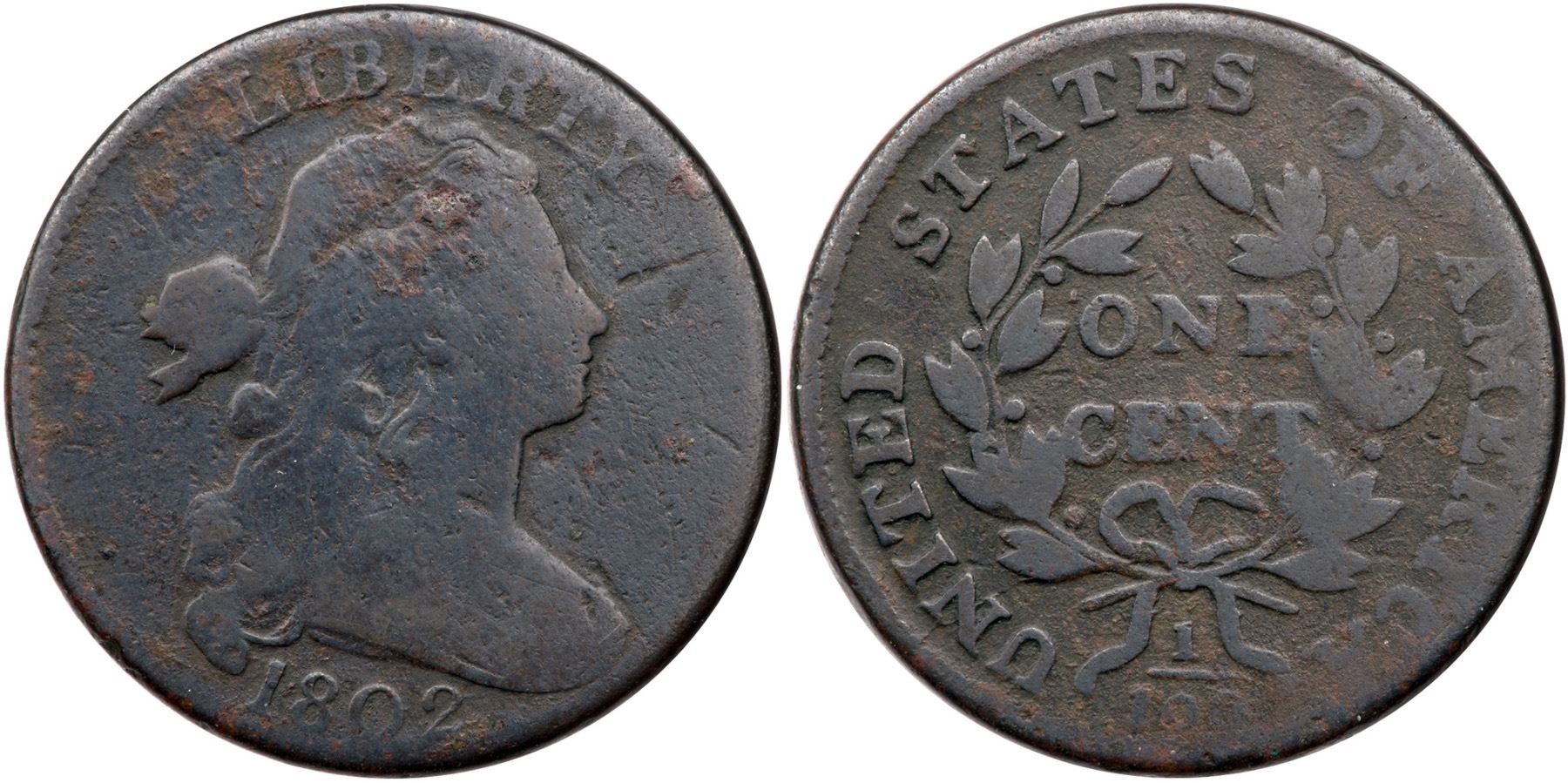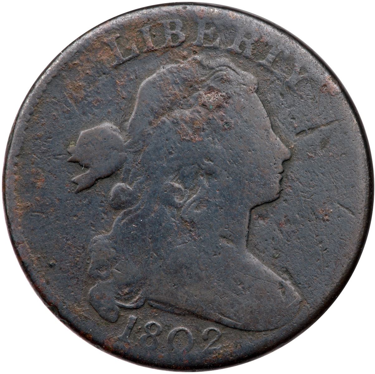 1802 S-237 R-2 G5A point or so sharper but there are scattered pits and ruddy old scale on either side, most notably in the upper hair and before the neck. Otherwise dark steel and olive surfaces. Full date and legends.Ex; Tim Paquette