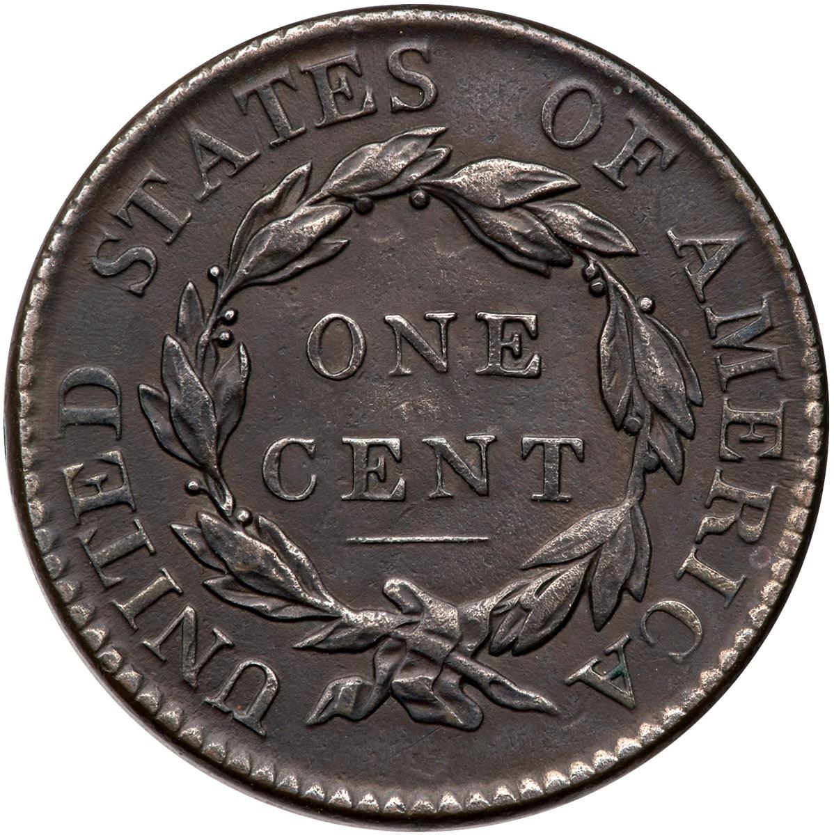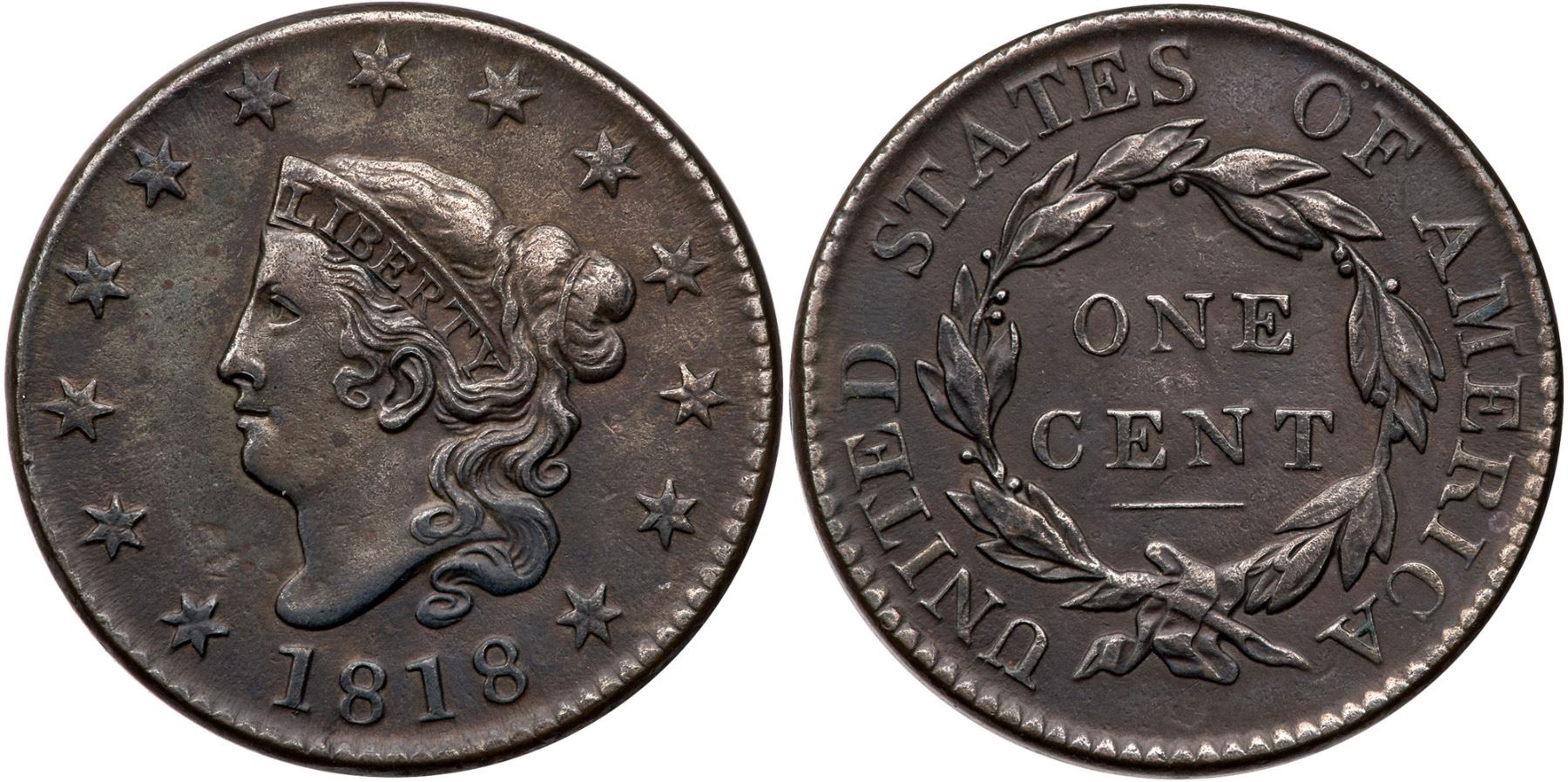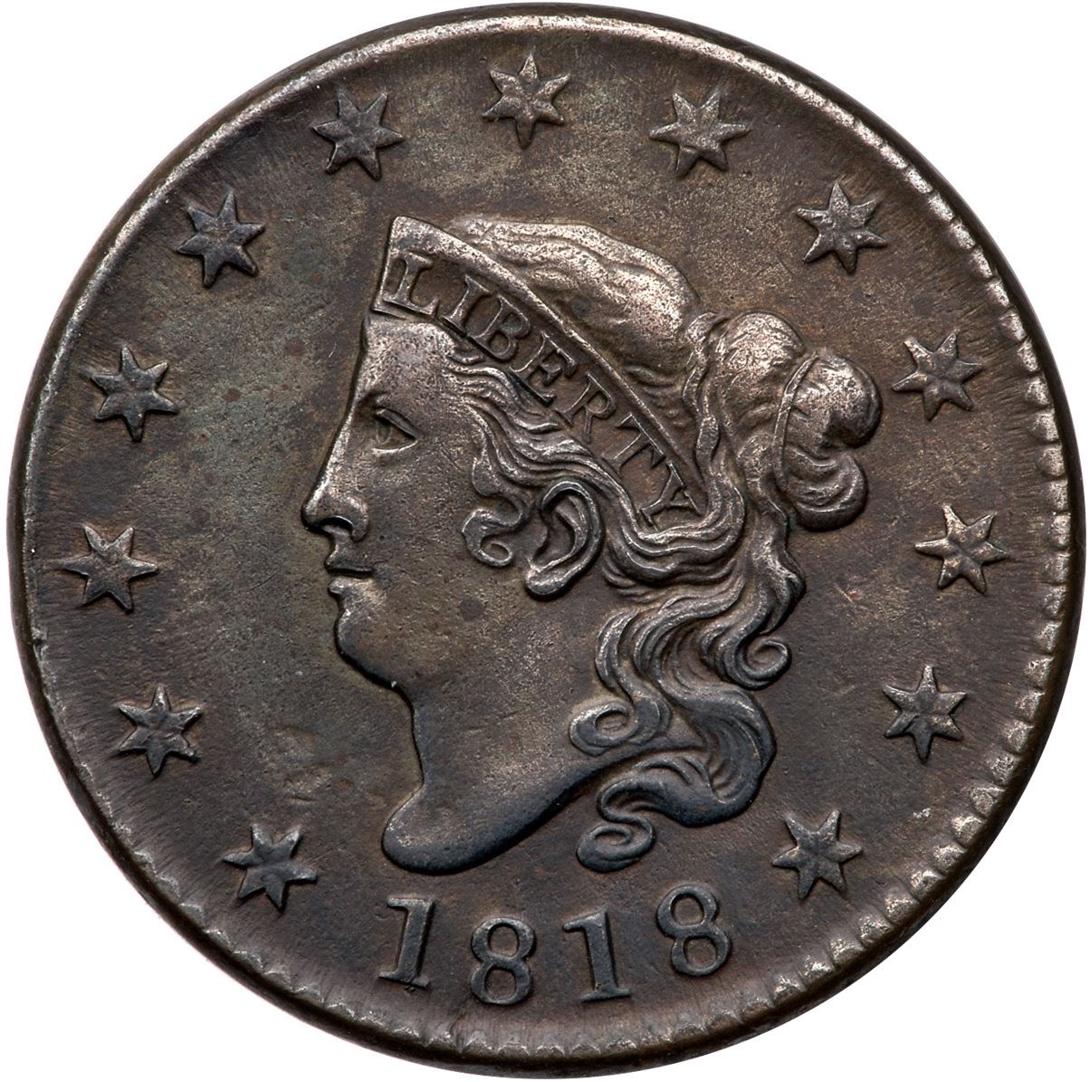 1818 N-9 R-3 VF20VF35 sharpness but fine microgranularity is visible under a glass, and the surfaces have been recolored and are now deep olive and steel. There are also a couple low spots inside the upper wreath, as struck. Otherwise free of notable marks or detractions, no verdigris. Ex; Tim Paquette