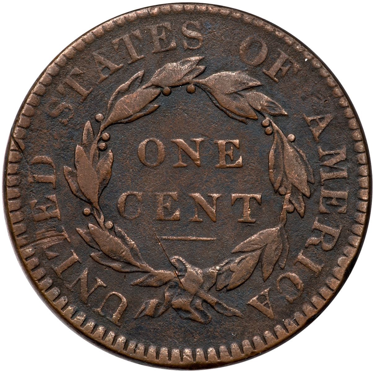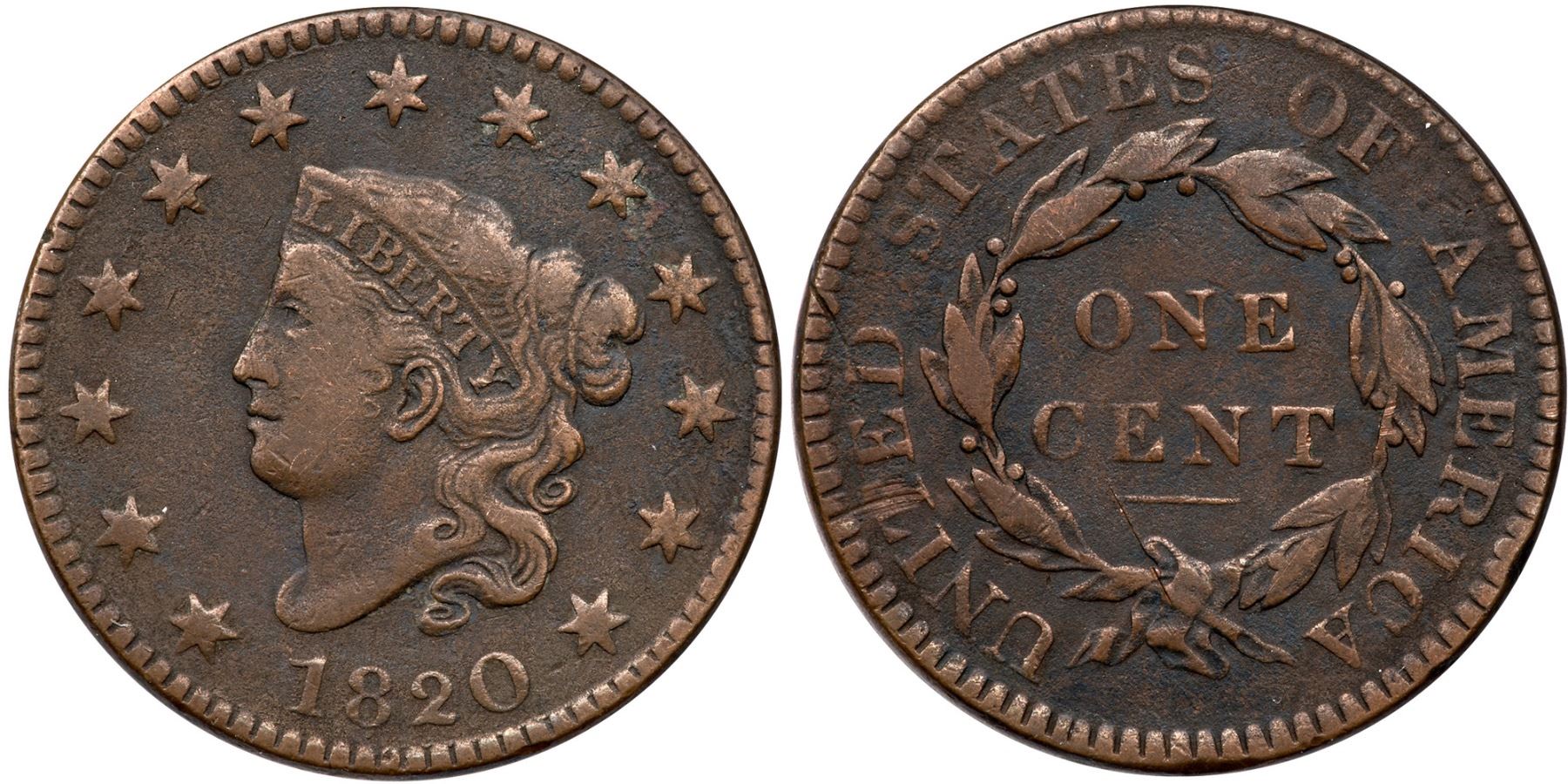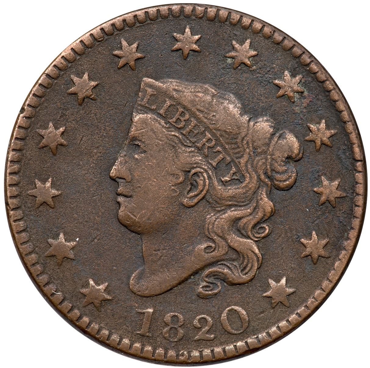 1820 N-11 R-2 VG8F15 sharpness but fine granularity covers the surfaces except the highpoints, and there are a couple old scratches. Those include one through D in UNITED, another from the ribbon to the bar above, and a scrape on T in UNITED. No verdigris. Chocolate brown and steel surfaces.Ex; Tim Paquette