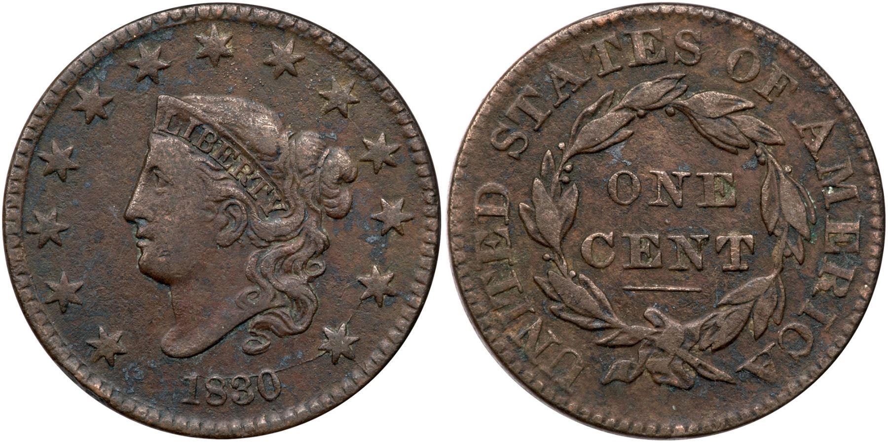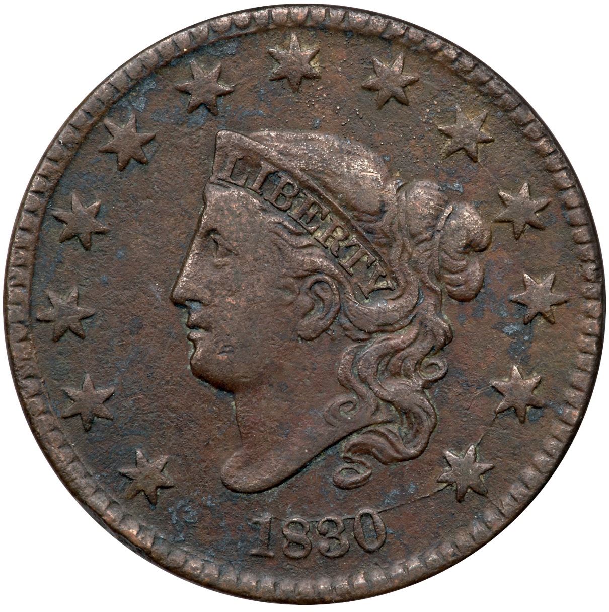 1830 N-2 R-2 VG8VF20 sharpness but lightly corroded with granular surfaces and traces of old verdigris and scale in some protected areas. The only marks are some faint hairline scratches in the field before the profile that blend in well. The usual die crack through the date and all the stars is clear. Ex; Tim Paquette