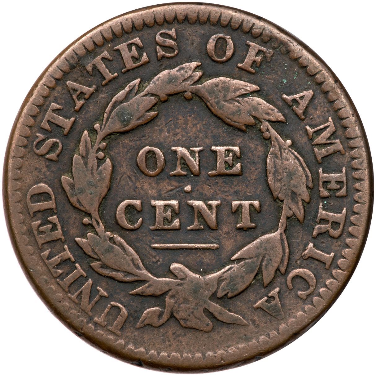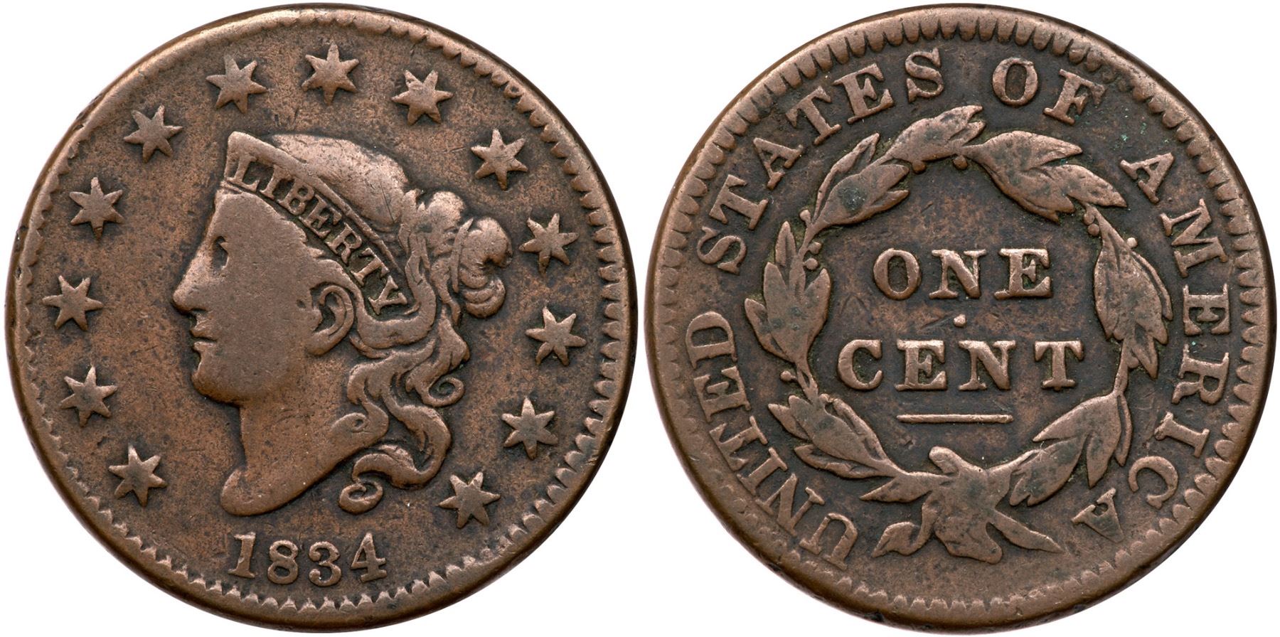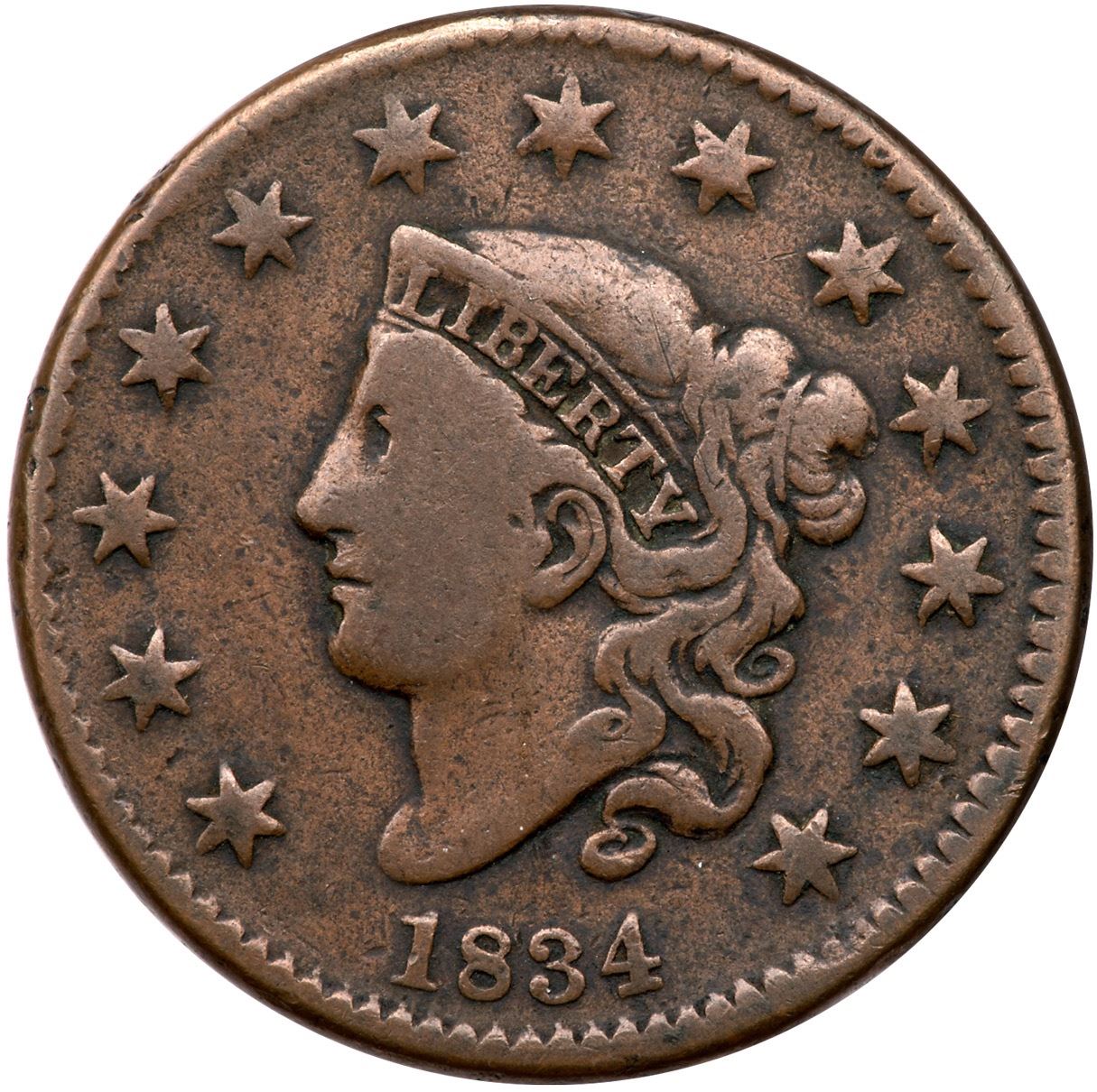 1834 N-2 R-1 VG8Medium olive brown, darker in some protected areas. A bit dirty with dark old crud atop the wreath and in some protected areas, otherwise free of notable marks. Nice bold date and legends.Ex; Tim Paquette
