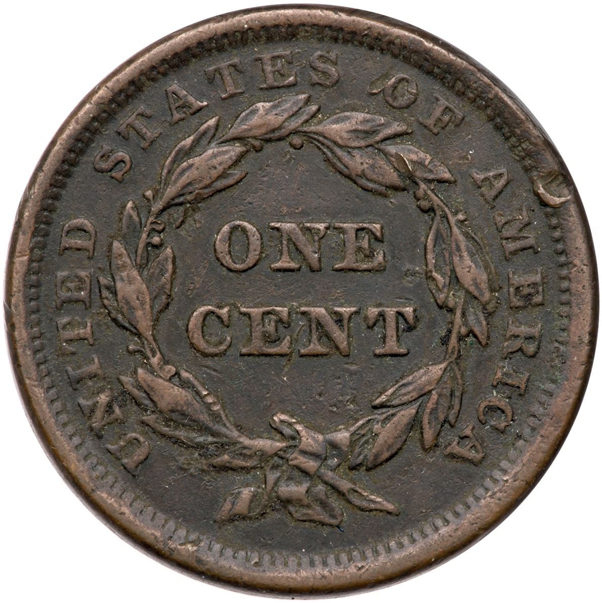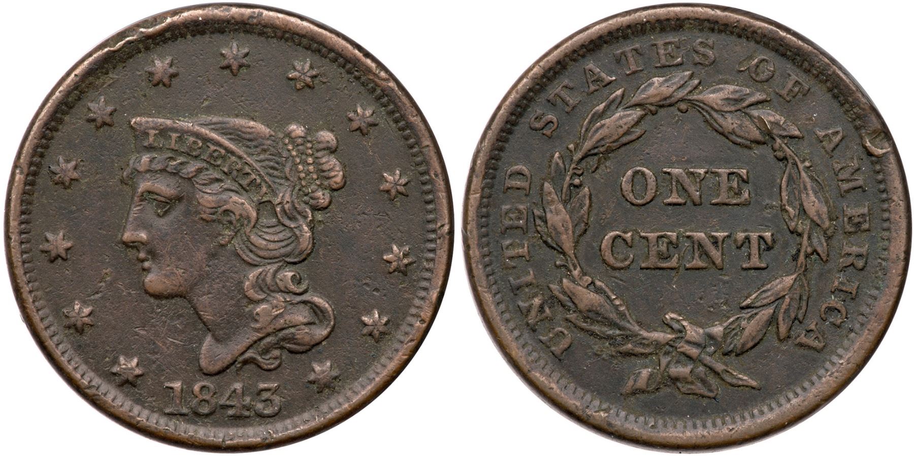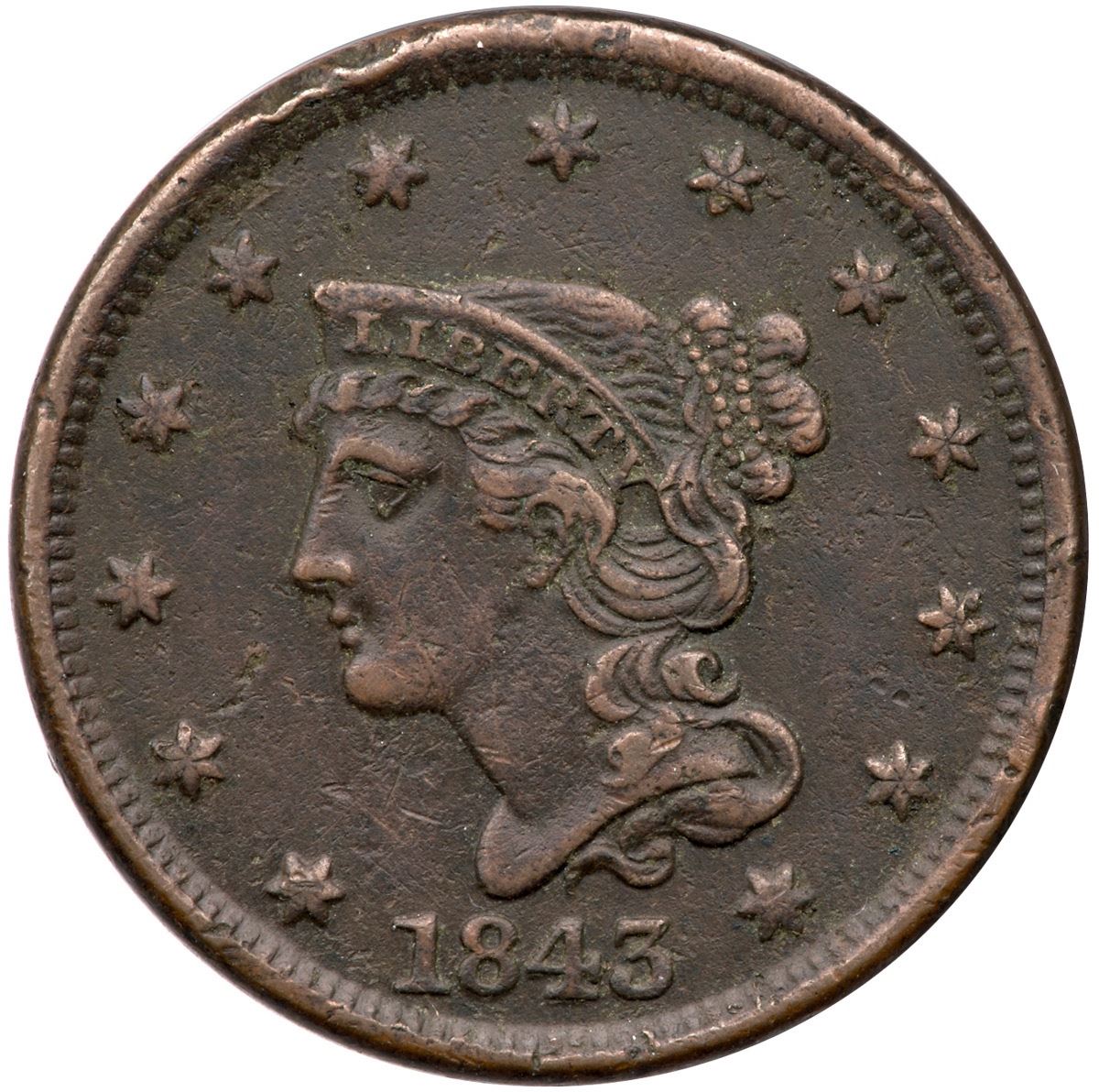 1843 N-9 R-3 F15EF40 sharpness but corroded with scattered microporosity and old crud in the protected areas. The notable marks include rim bruises above star 6, a dig above AM in AMERICA, and minor nicks before the chin. Dark chocolate brown surfaces with lighter brown on the high points. Ex; Tim Paquette