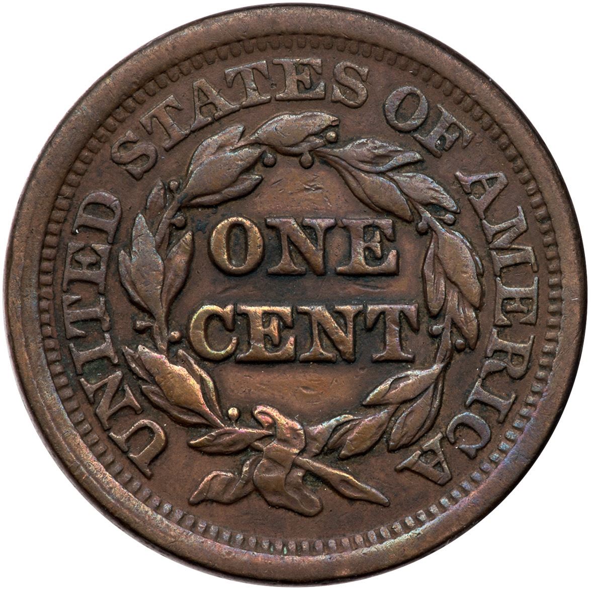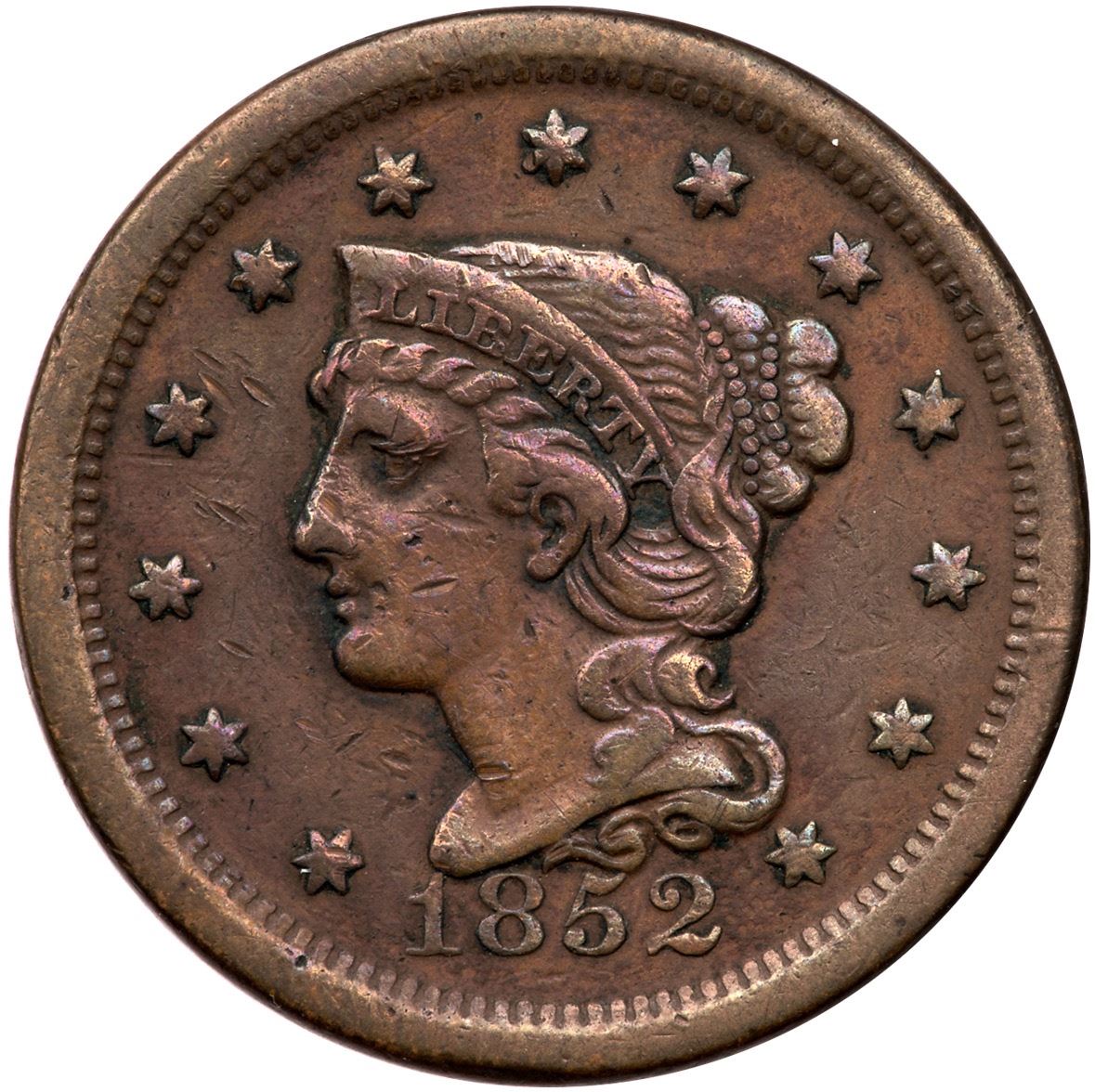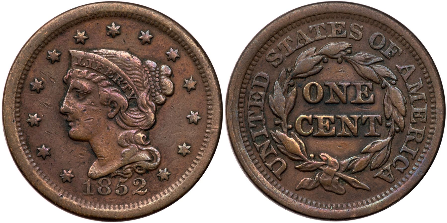 1852 Braided Hair Cent VG10F15 sharpness but the surfaces have been recolored and there numerous marks on the portrait and fields. Now toned a mixed medium brown, olive, and ruddy brown patina with iridescent red and bluish steel tones. Ex; Tim Paquette