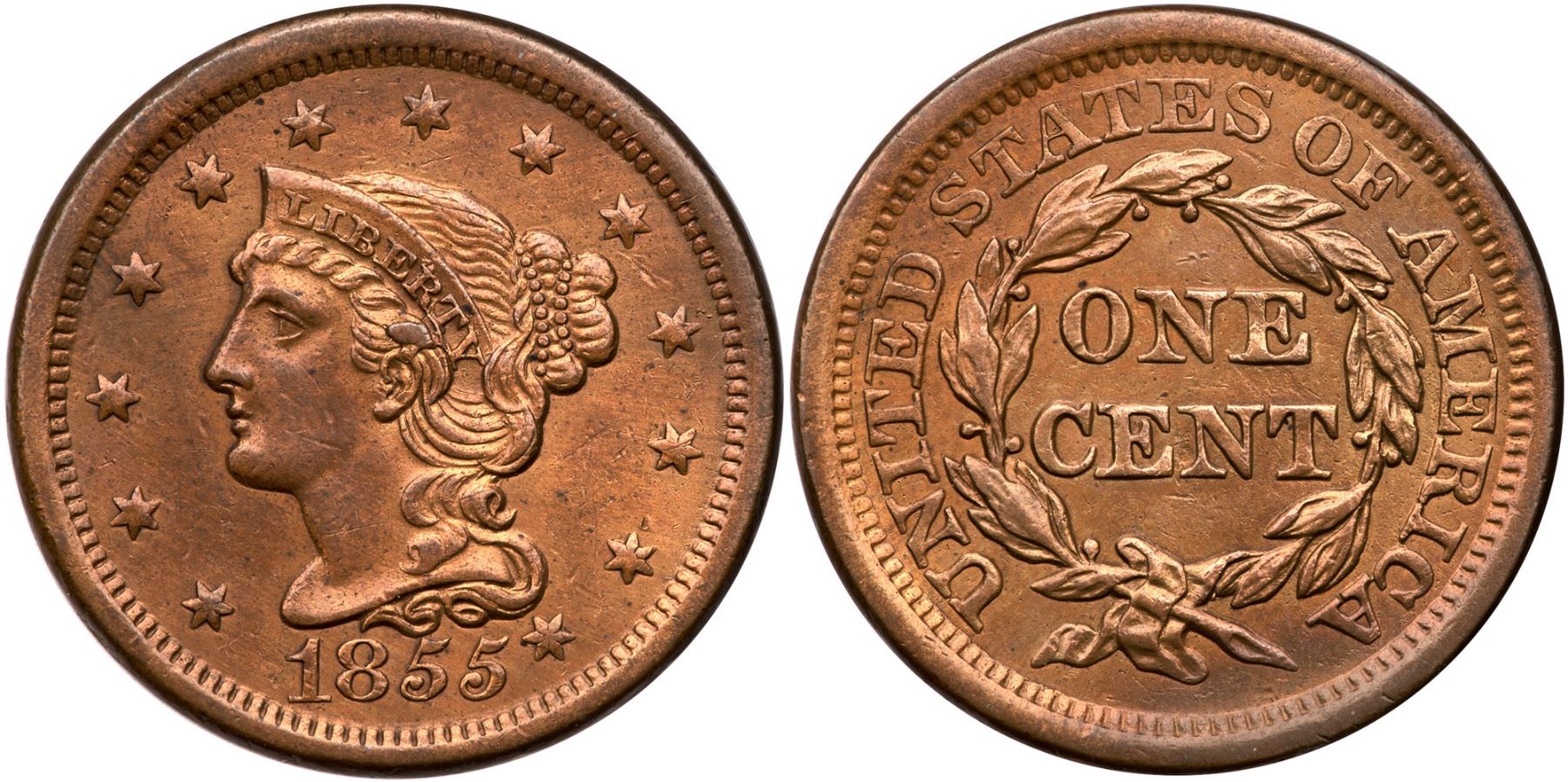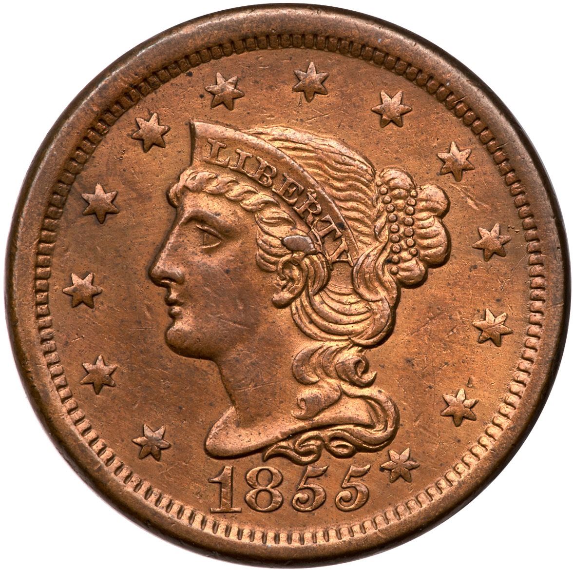 1855 N-9 R-1 Knob on Ear VF20EF40 sharpness but harshly cleaned and now artificial orange, gold, and steel tones. There are trivial marks on the portrait and fields, nothing major. Smooth surfaces. Knob on Ear. Ex; Tim Paquette