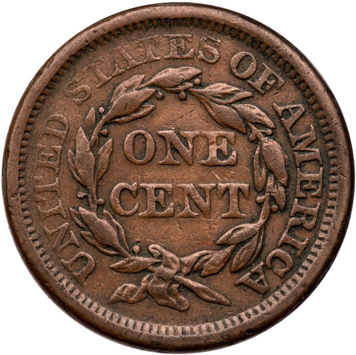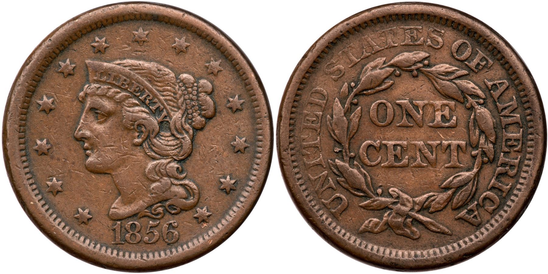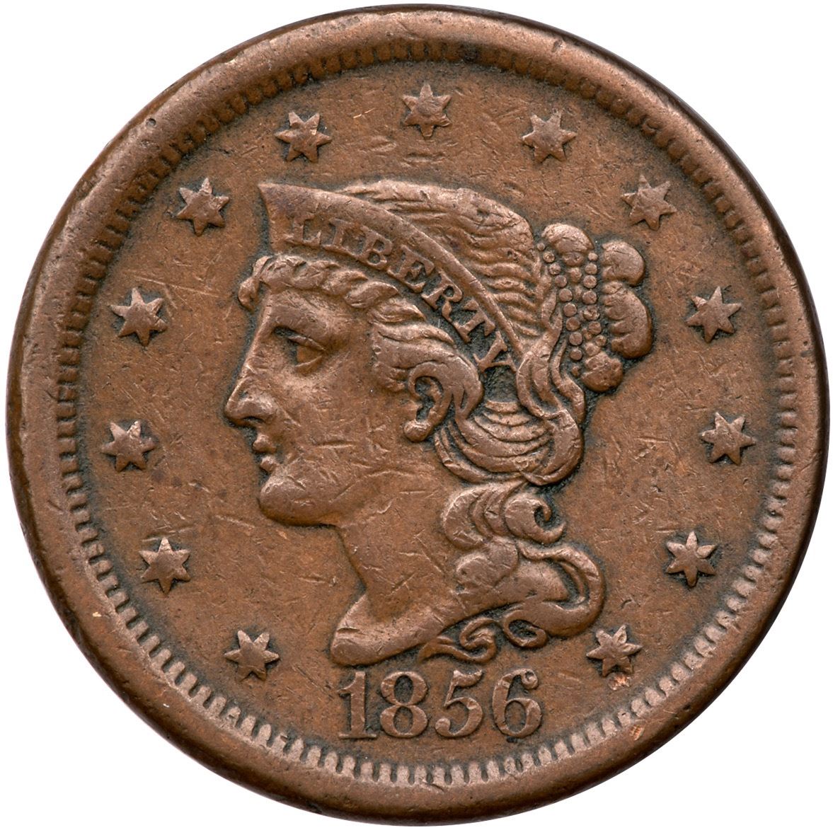 1856 Braided Hair Cent F15Five points sharper but there are numerous nicks on the portrait and fields, nothing major but enough to prevent the higher grade. There is also old crud in some protected areas. Glossy uniform medium brown surfaces. Ex; Tim Paquette