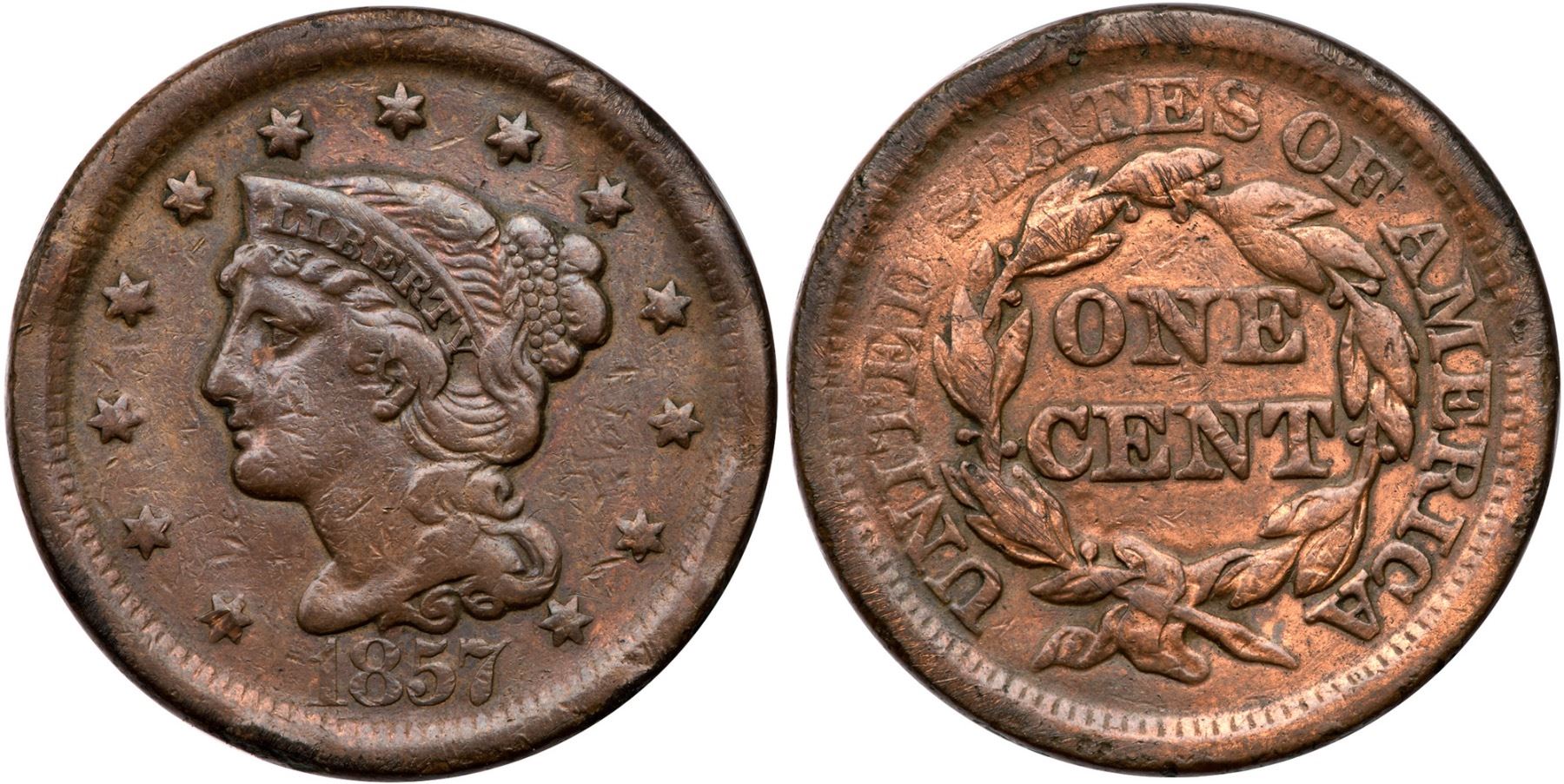 1857 N-1 R-1 Large Date VG8F15 sharpness but there are numerous rim dents along both sides, and the surfaces have been recolored. Now toned olive brown with hints of artificial red underneath on the obverse, the reverse faded orange and steel. Ex; Tim Paquette
