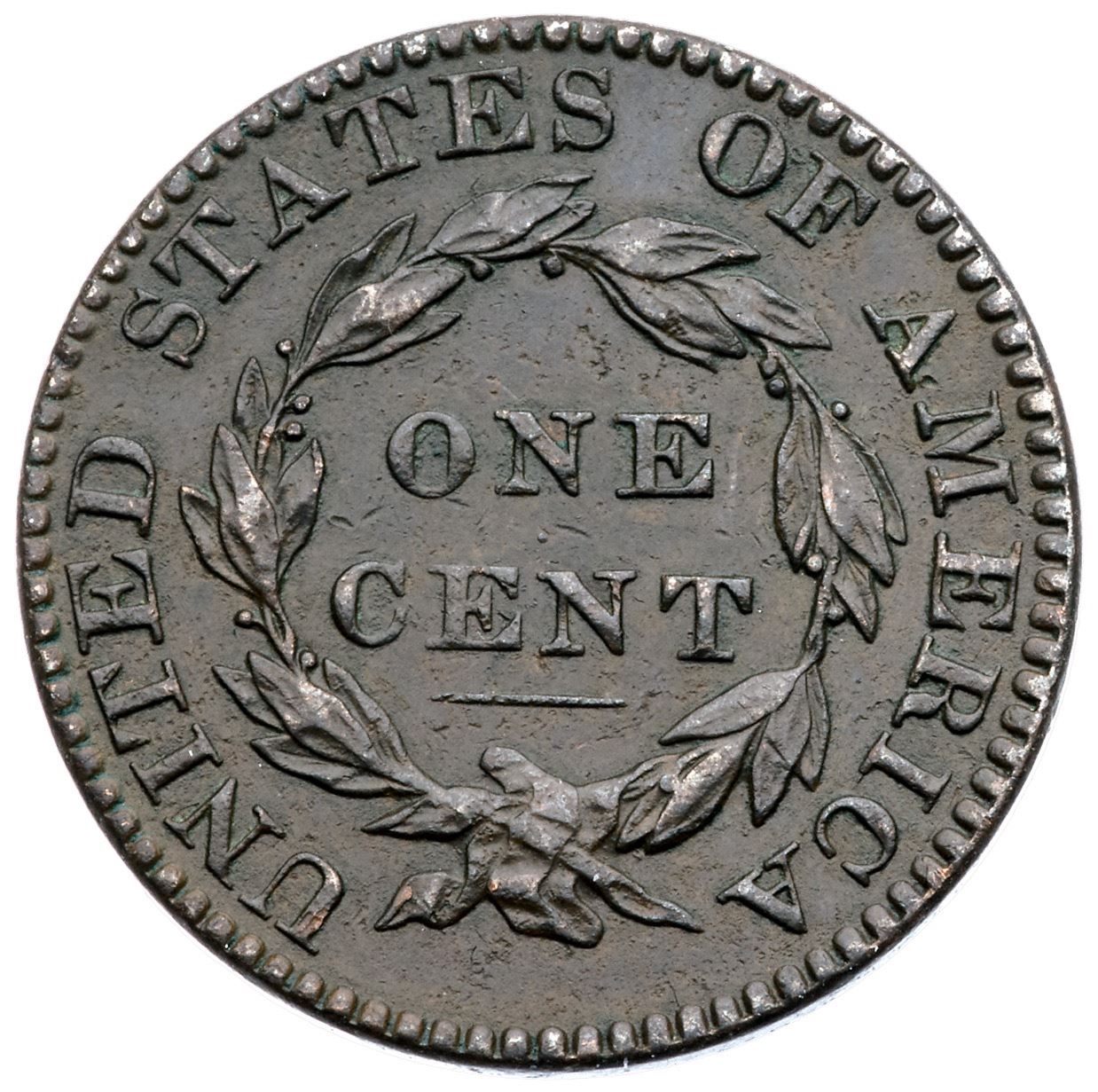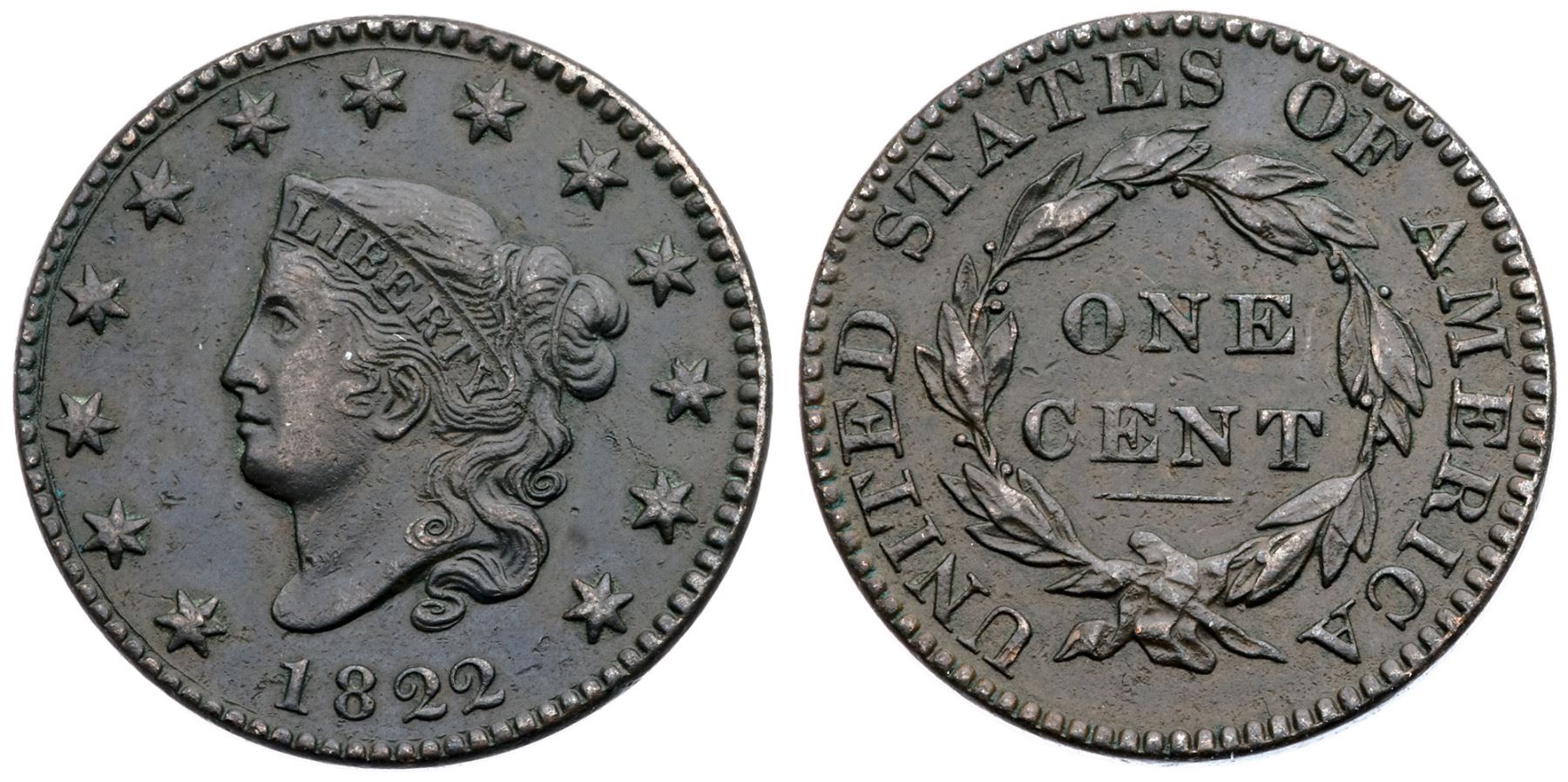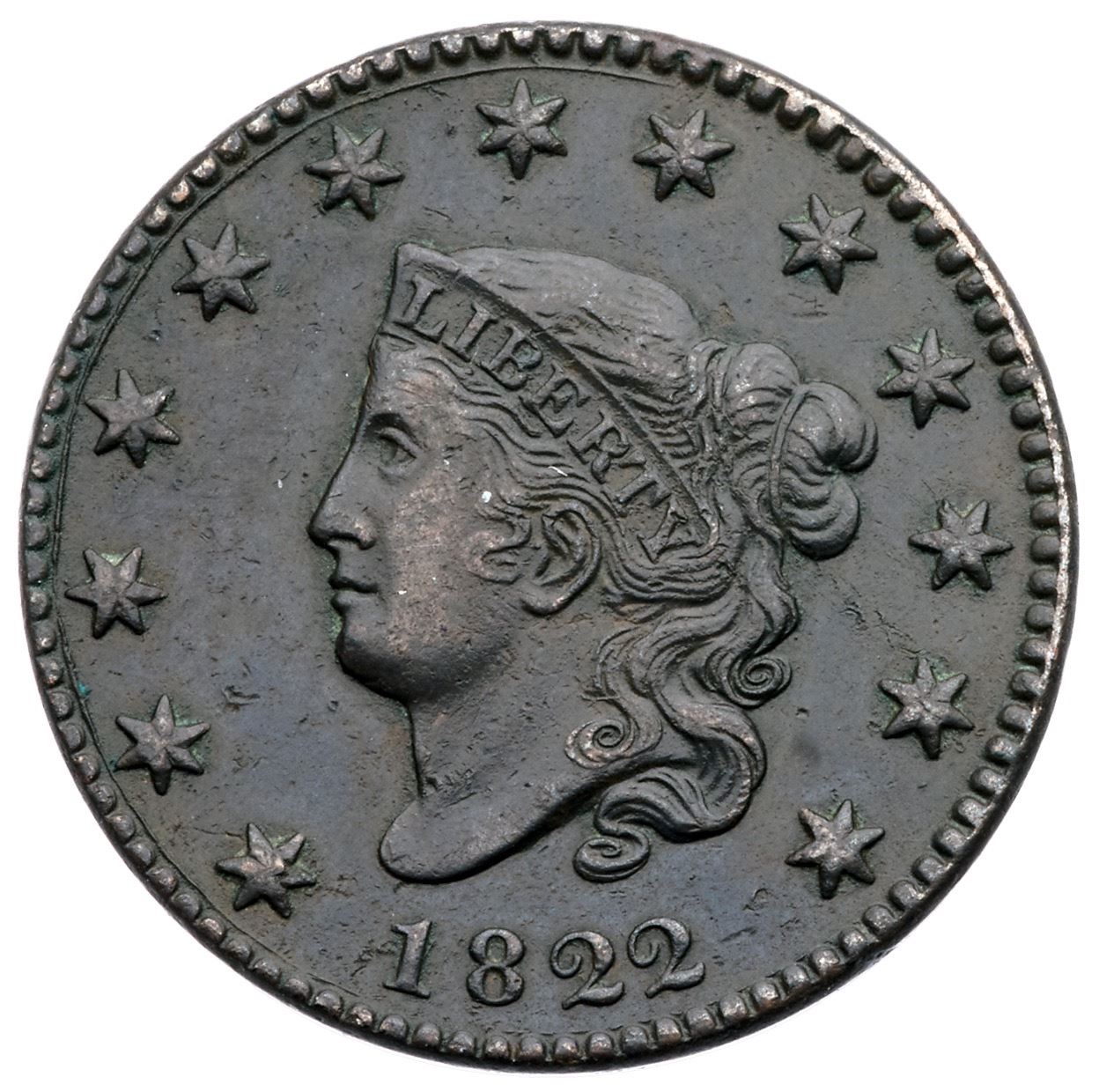 1822 N-3 R-2 VF25XF sharpness but dark with traces of verdigris in the protected areas. Otherwise only the most trivial of marks or abrasions. Glossy dark brown and olive. EDS, die state b-.