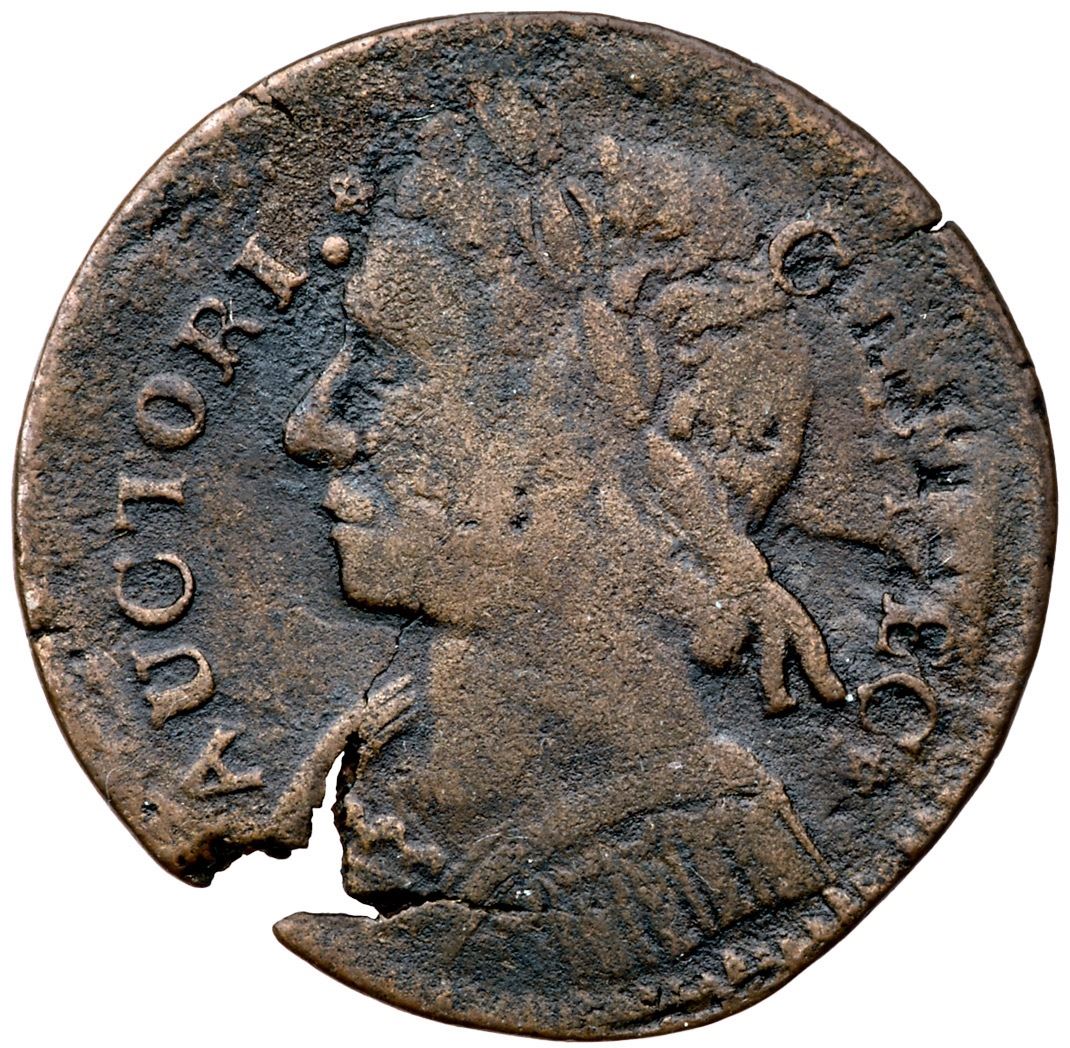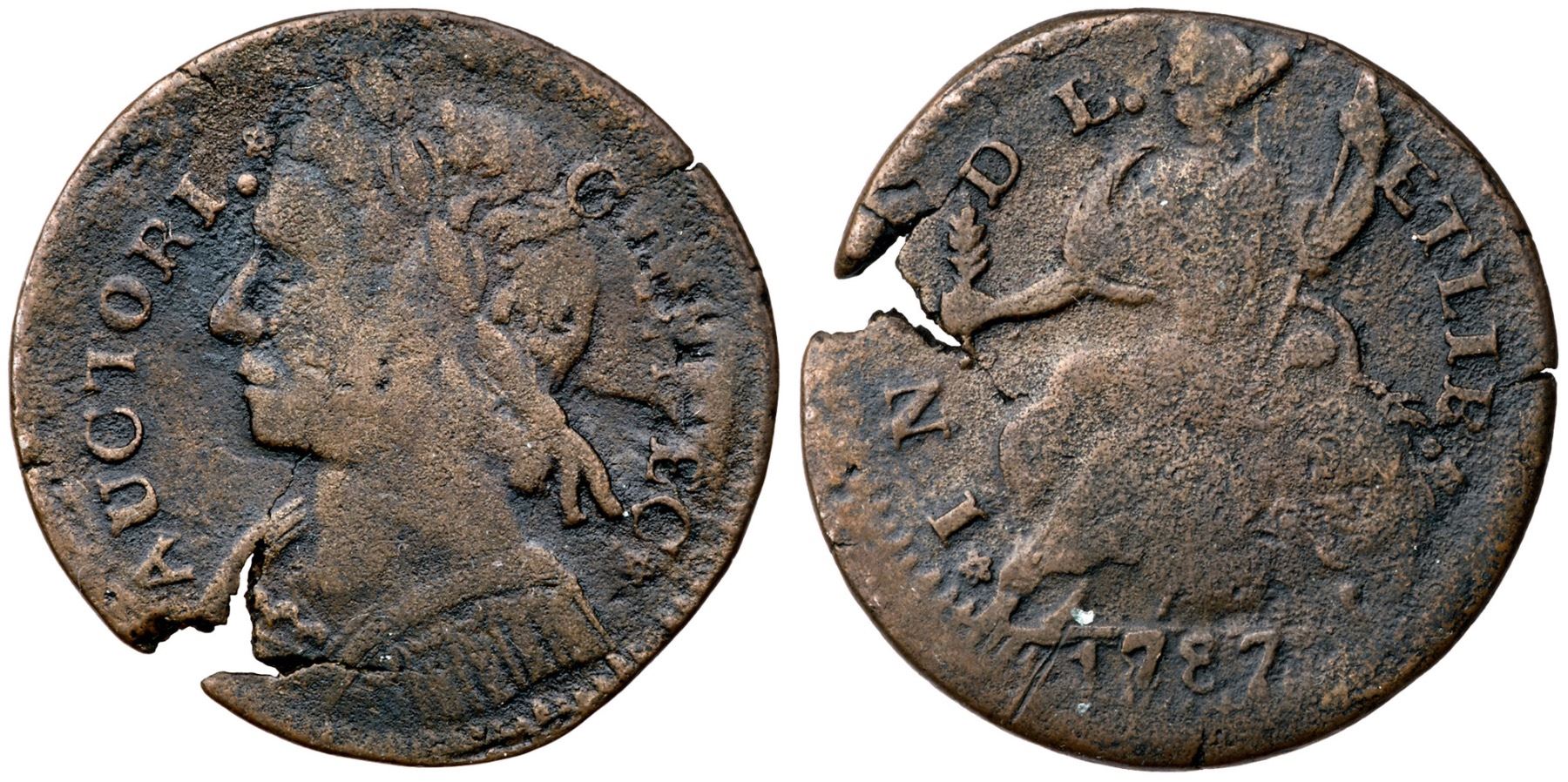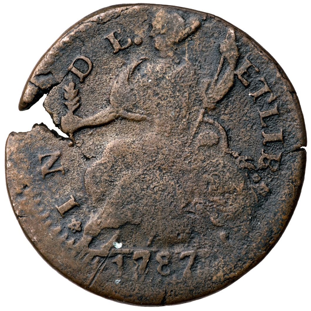 1787/1887 Miller 12-Q R-3 Connecticut VG8Mailed Bust Left. Glossy olive with deeper charcoal in some protected areas and micro granularity on the surfaces. There is a major planchet flaw at 7 o'clock on the obverse, and heavy die clash marks on CONNEC. The date and legends are strong, with clear overdate feature. 84.0 grains. Ex; Chris Young - Tom Webster