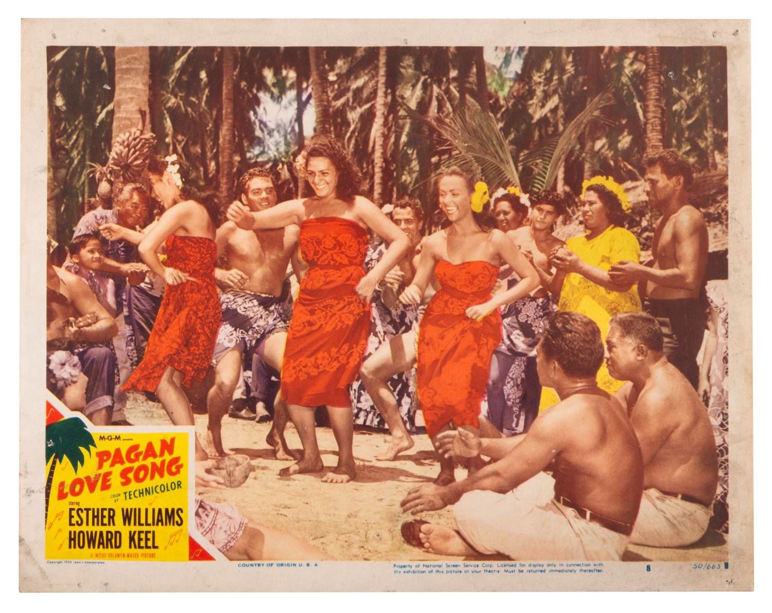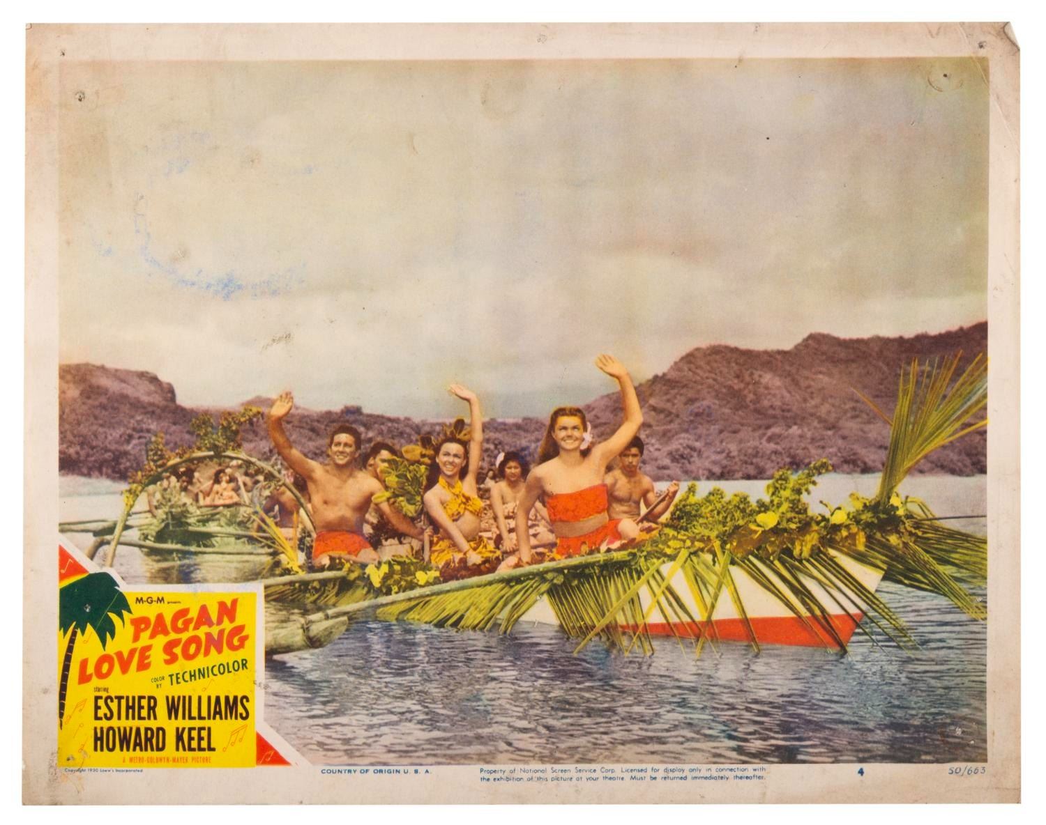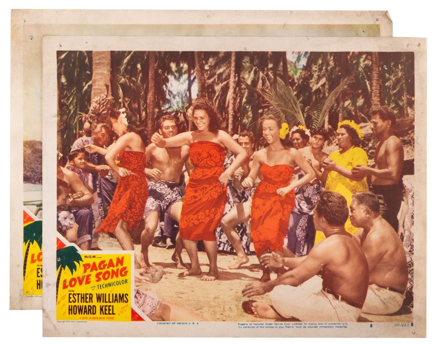 (MGM, 1950) A pair of lobby cards for the musical "Pagan Love Song " starring Esther Williams, Howard Keel, and a young Rita Moreno. Measuring 11 " x 14 " each, the lobby cards are in fair to good condition with discoloration from age, soiling, a corner fold, wear, and pinholes from display.