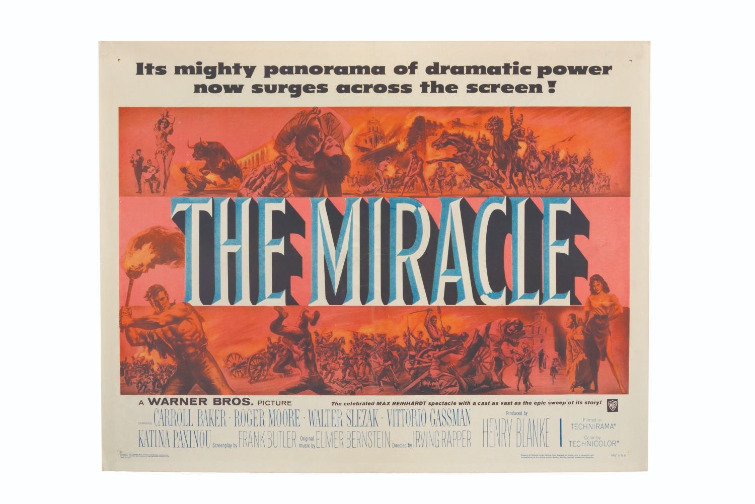 (Warner Bros., 1959) A half-sheet poster for the Technirama film "The Miracle, " starring Caroll Baker, Roger Moore, and Walter Slezak. Measuring 22 " x 28 ", the poster is in very good condition with light edge wear and creases along original folds.
